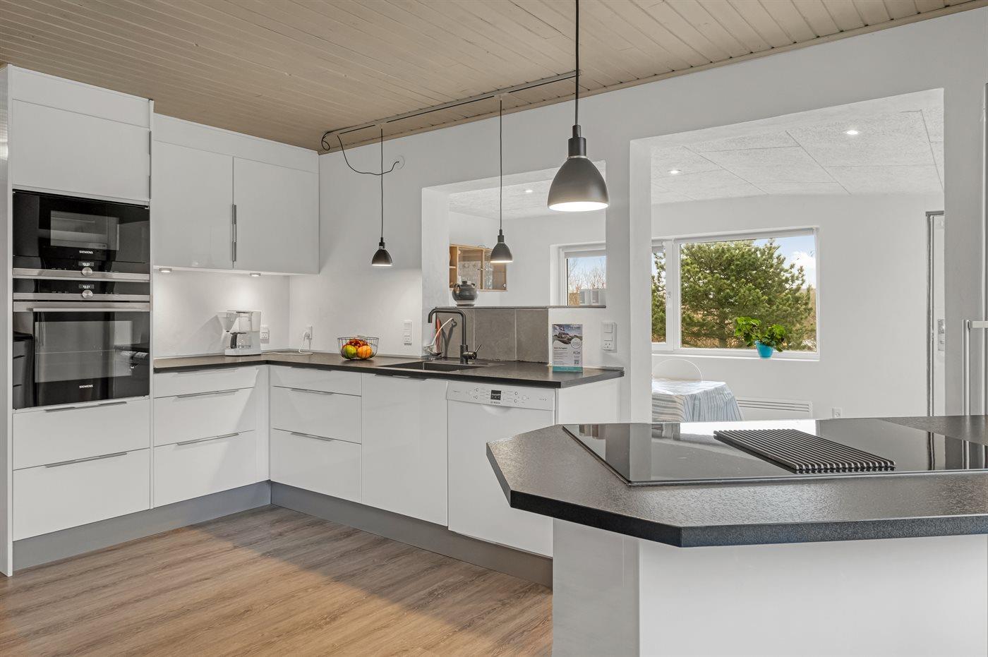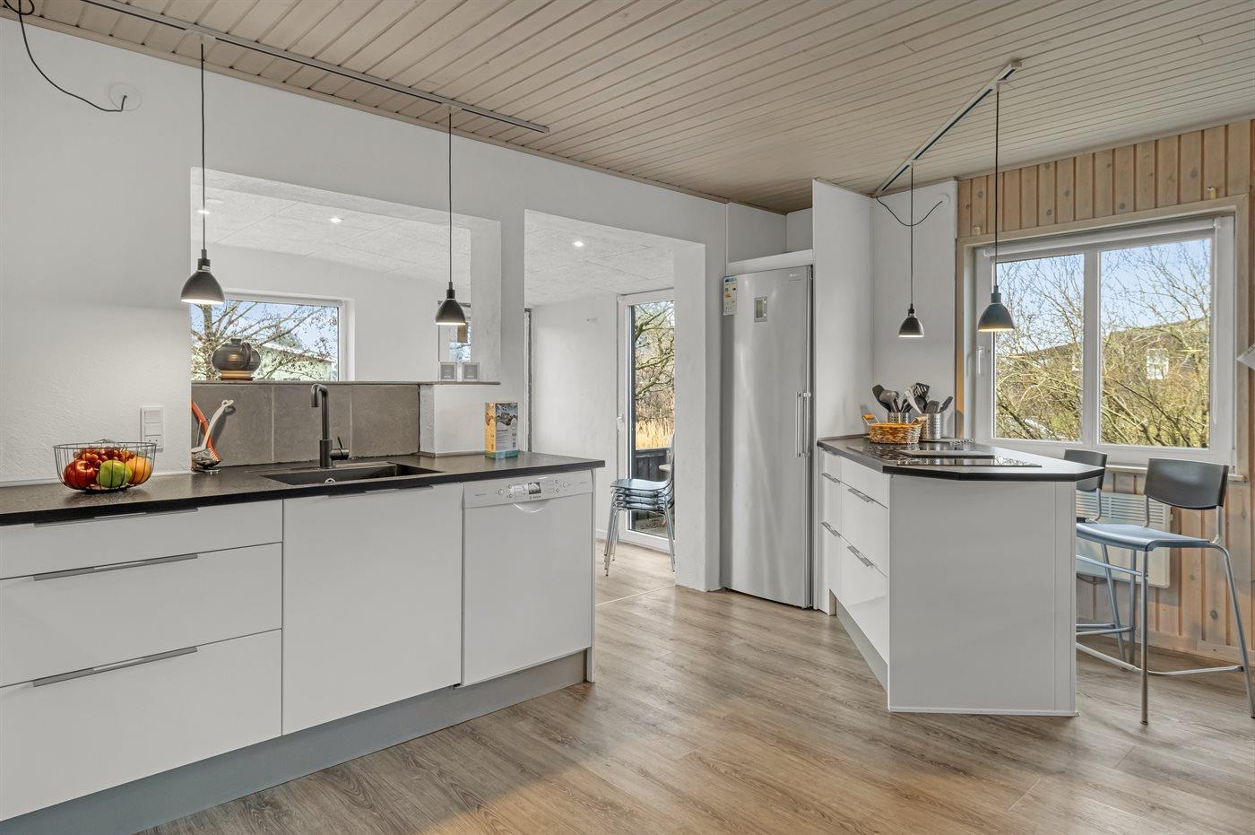 Køkkenet er udstyret med 1 køleskab. Der er 4 keramiske kogeplader, bageovn, mikrobølgeovn samt opvaskemaskine.