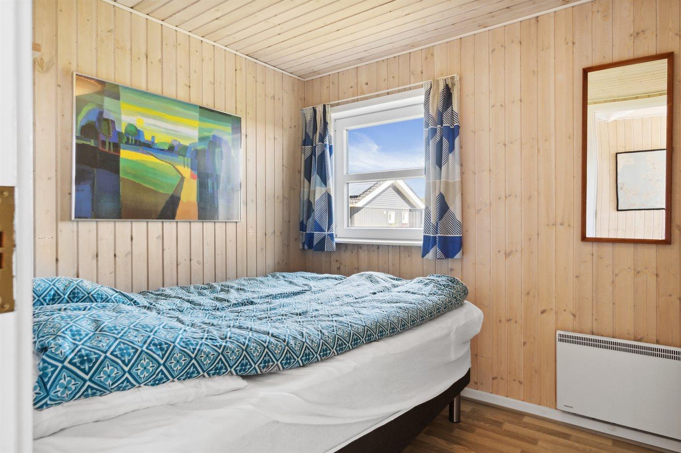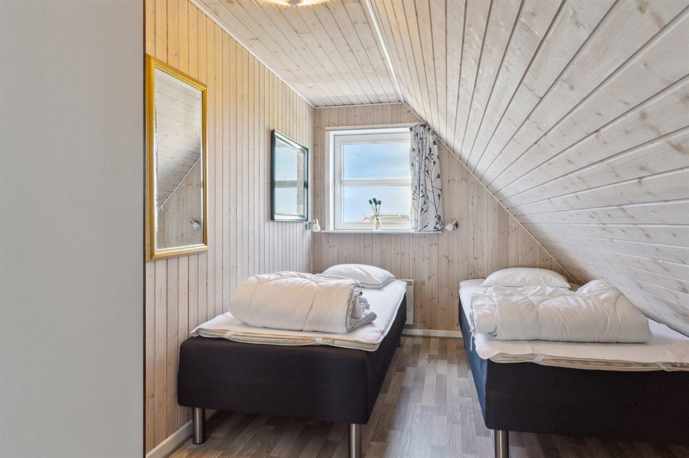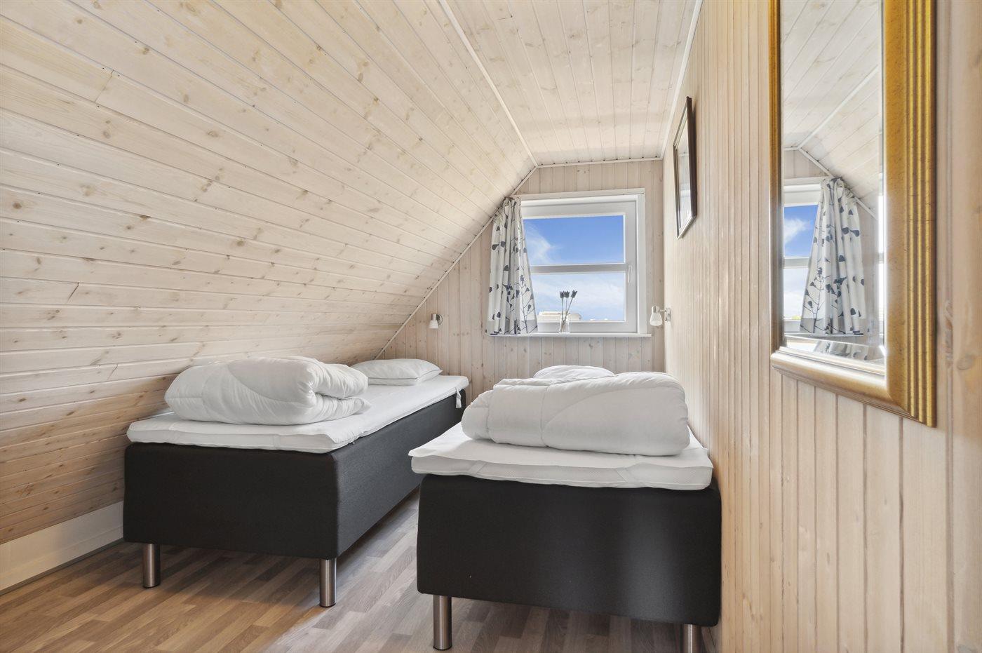 Der er i alt 4 soveværelser. Sovepladserne fordeler sig på: 6 sovepladser i dobbeltsenge. 2 sovepladser i enkeltsenge.
