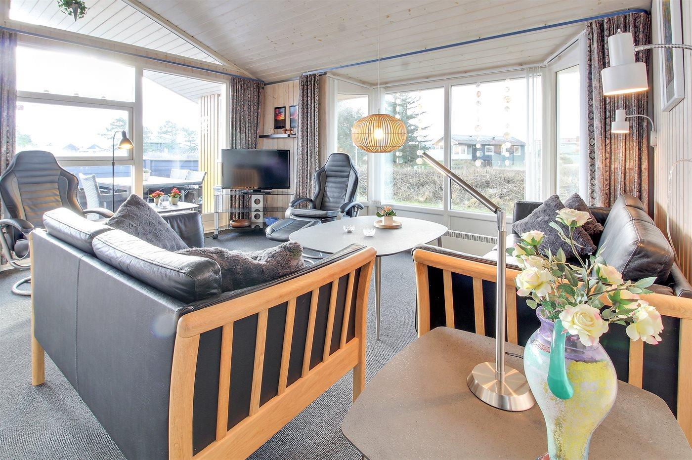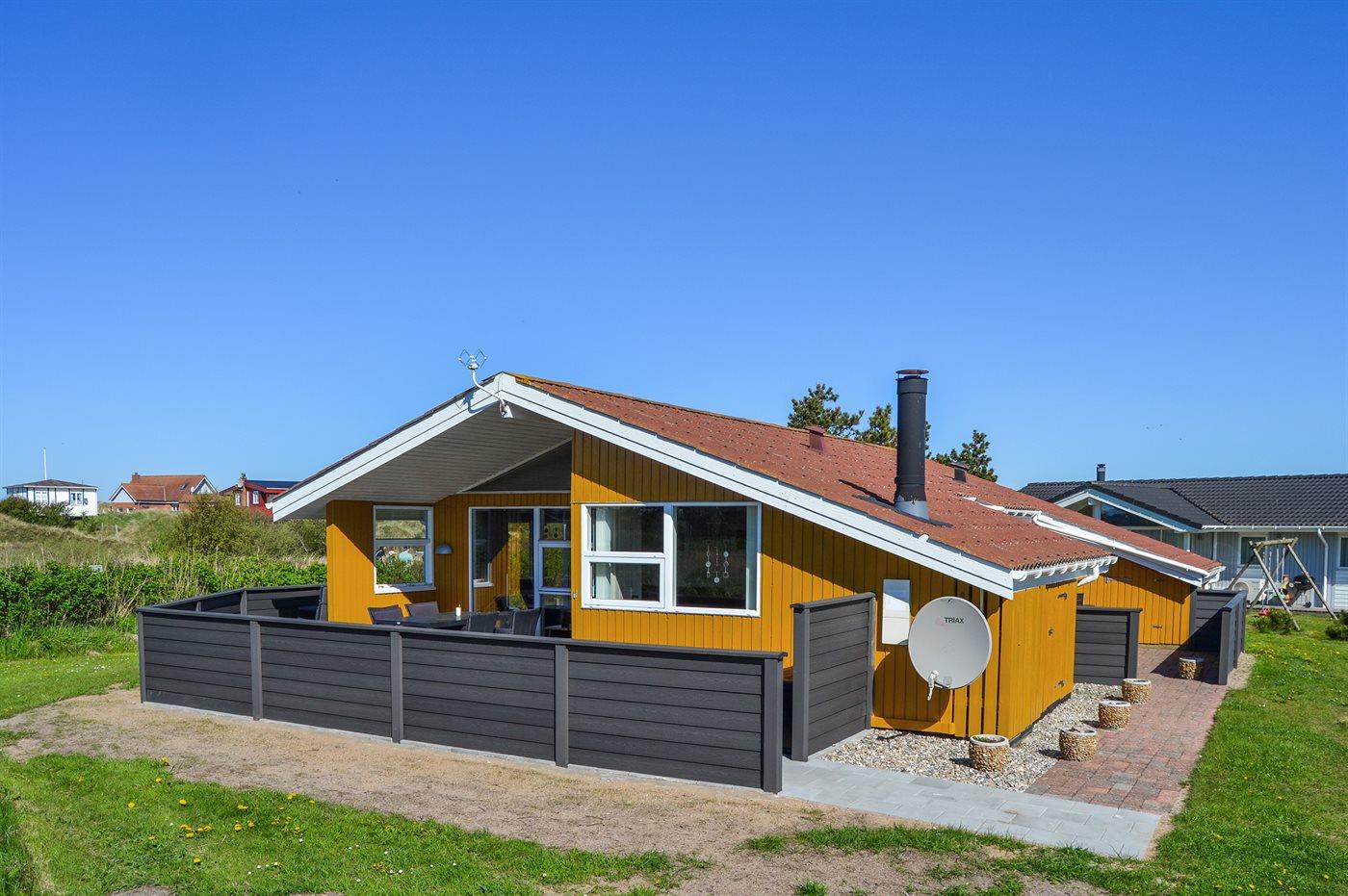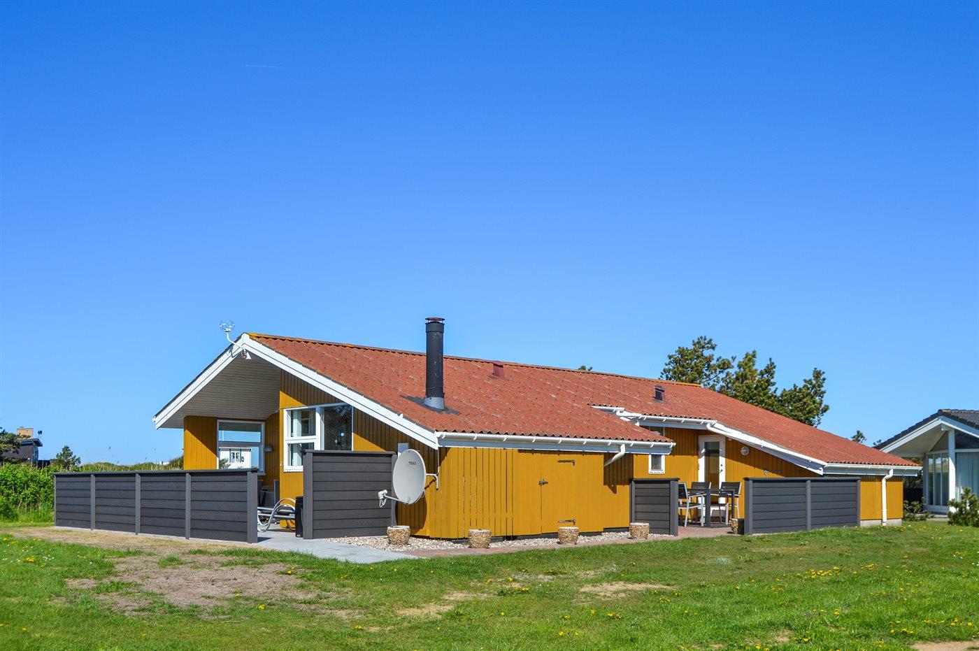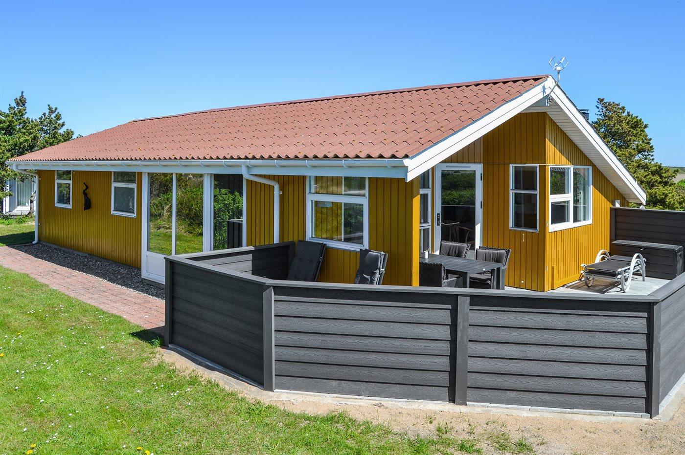 Tæt ved Vesterhavet ligger dette dejlige sommerhus på en naturgrund, som er omgivet at en jordvold. Til huset hører åben, til dels afskærmet terrasse med havemøbler.