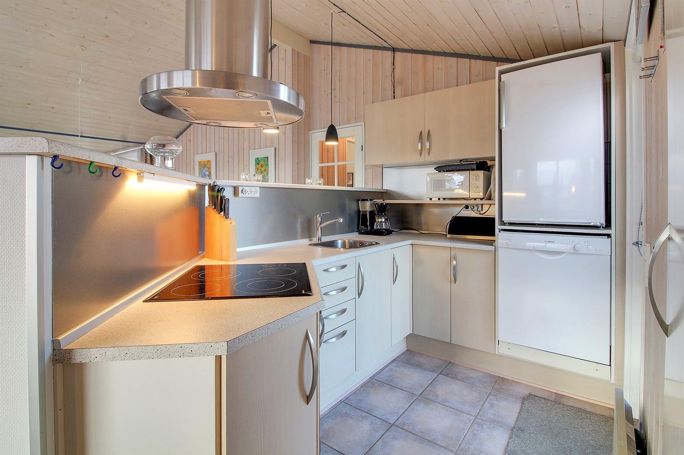 Køkkenet er udstyret med 1 køleskab. Der er 4 elkogeplader, bageovn, mikrobølgeovn samt opvaskemaskine.