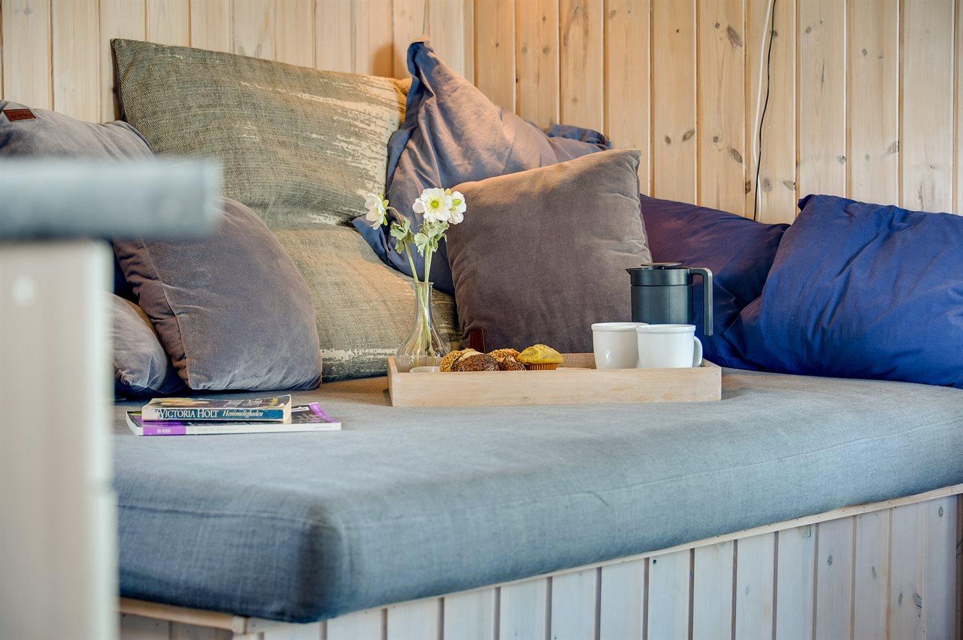 Der er i alt 1 soveværelse. Sovepladserne fordeler sig på: 4 sovepladser i dobbeltsenge. 3 sovepladser på madrasser. 2 af disse sovepladser befinder sig i opholdsstuen og 3 af dem befinder sig på hemsen.