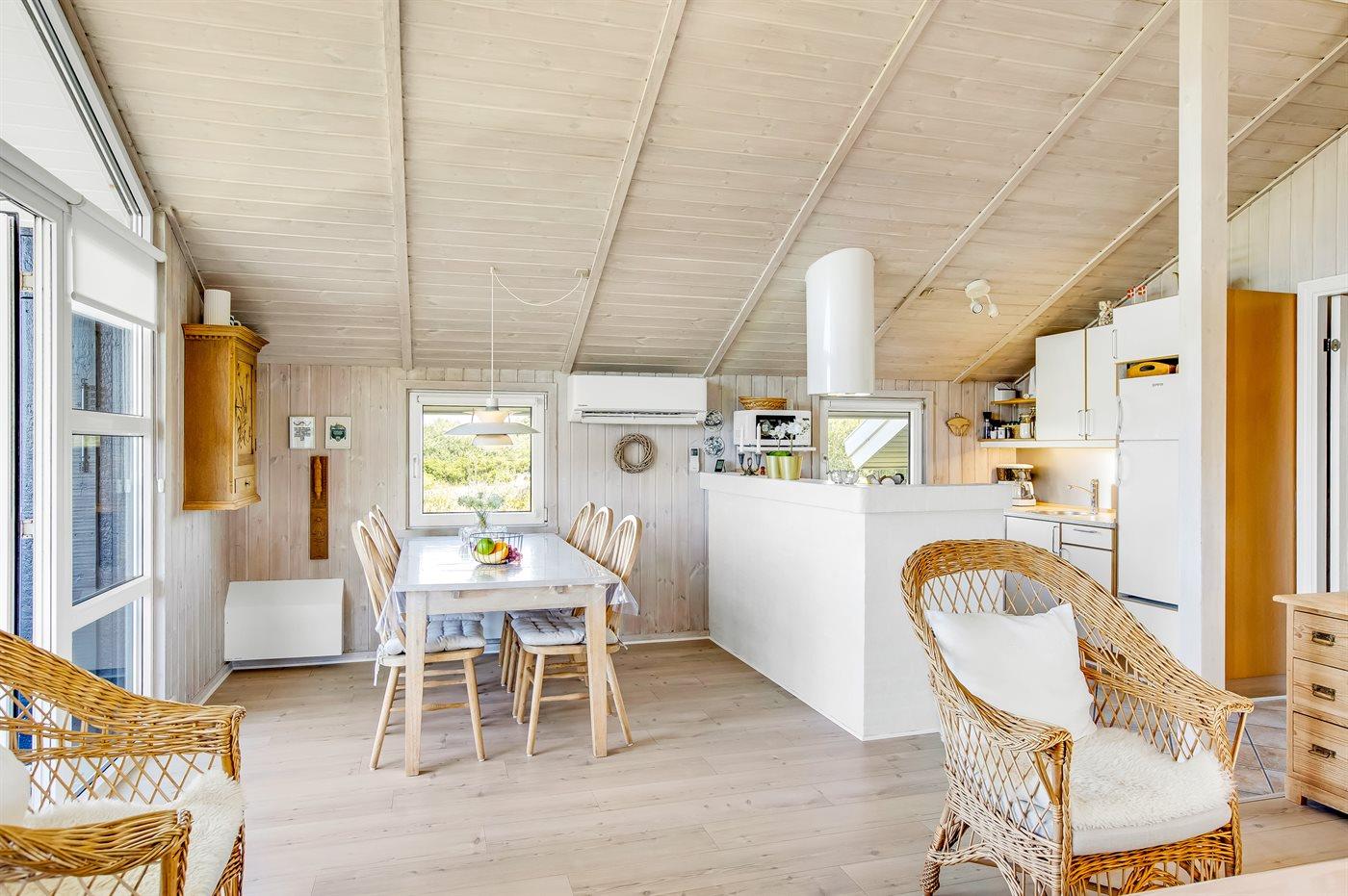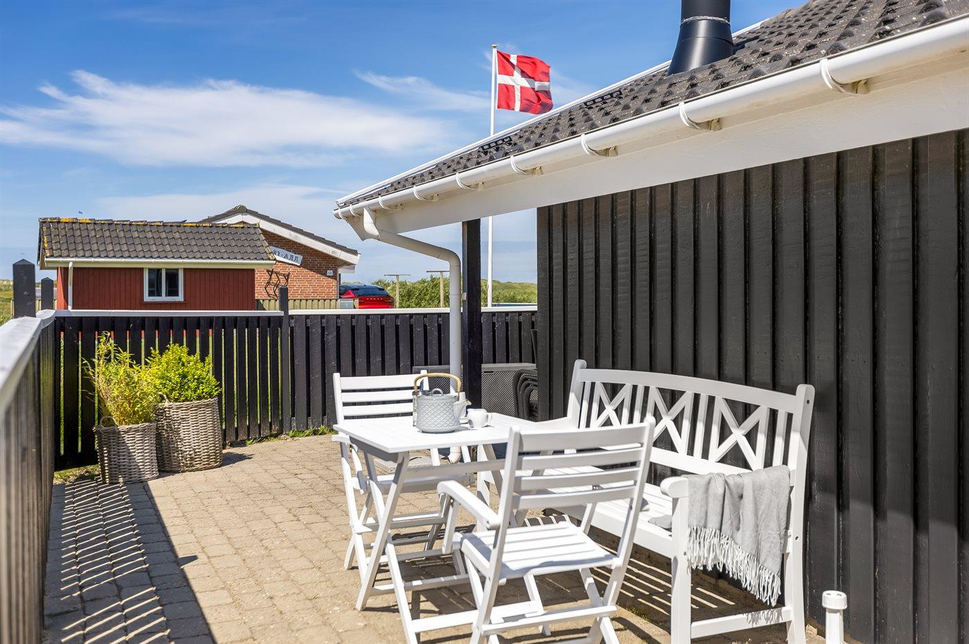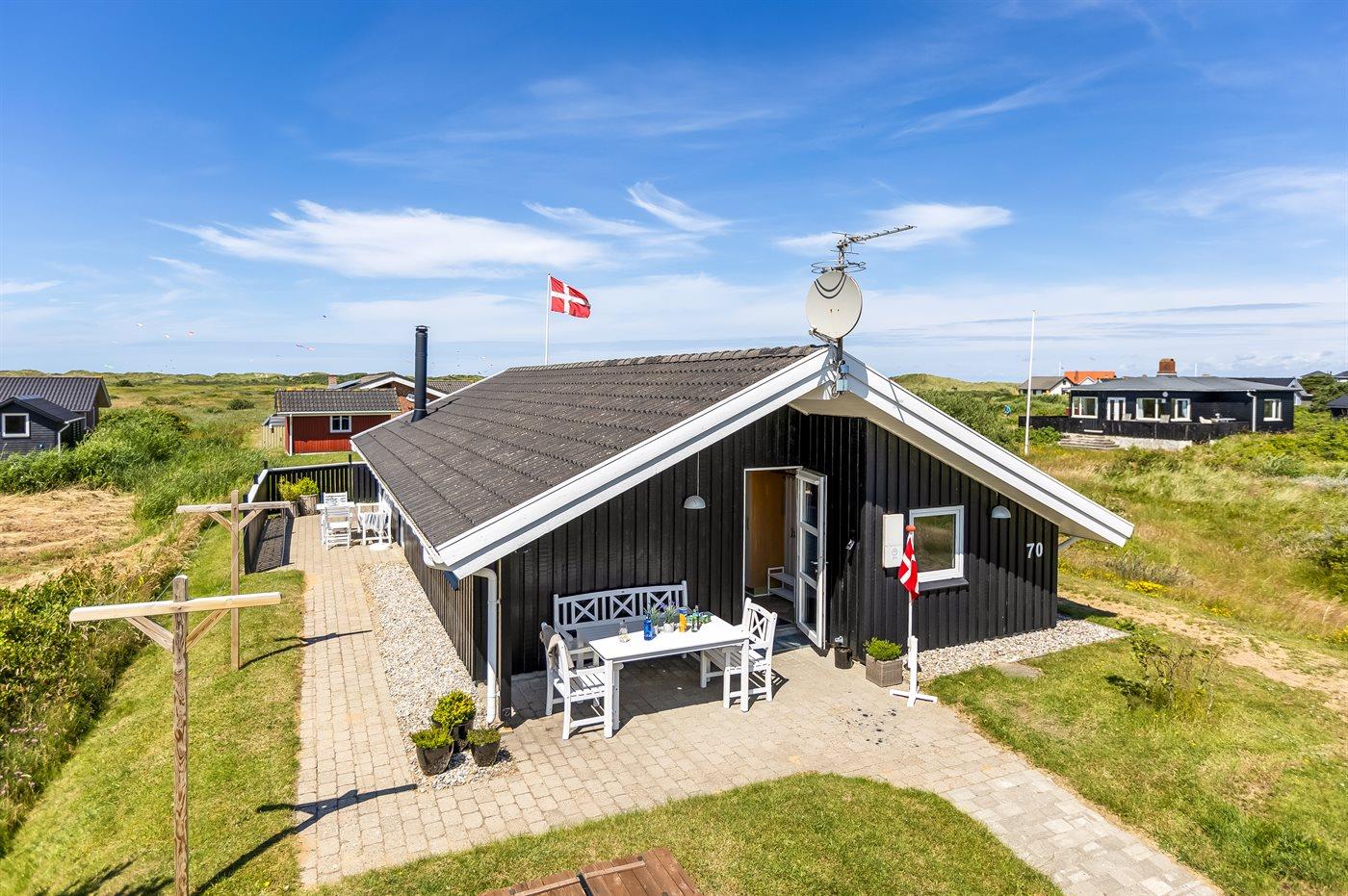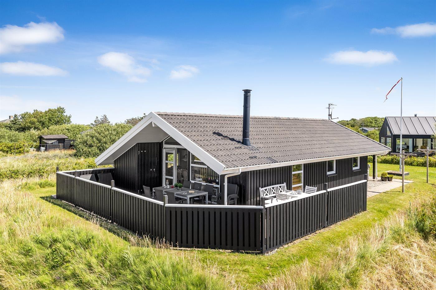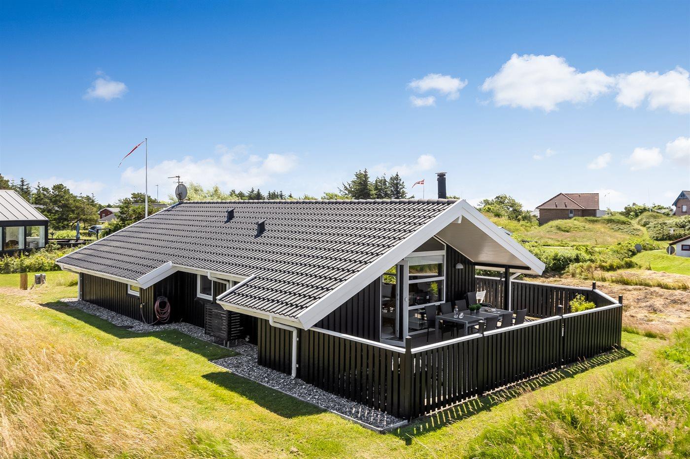 Et hyggeligt og veludstyret, flot træsommerhus med spa og sauna. Huset, som er bygget i 1998 og moderniseret i 2015, er beliggende på en børnevenlig naturgrund i 2. klitrække - nær stranden og med en dejlig udsigt over klitterne og Lakolk. Man kan spadsere direkte til stranden ad de små stier. Til huset hører et dejligt såvel åbent som overdækket og afskærmet terrasseareal, hvorfra der er udsigt over klitterne. Lækre havemøbler og Weber grill står til rådighed.