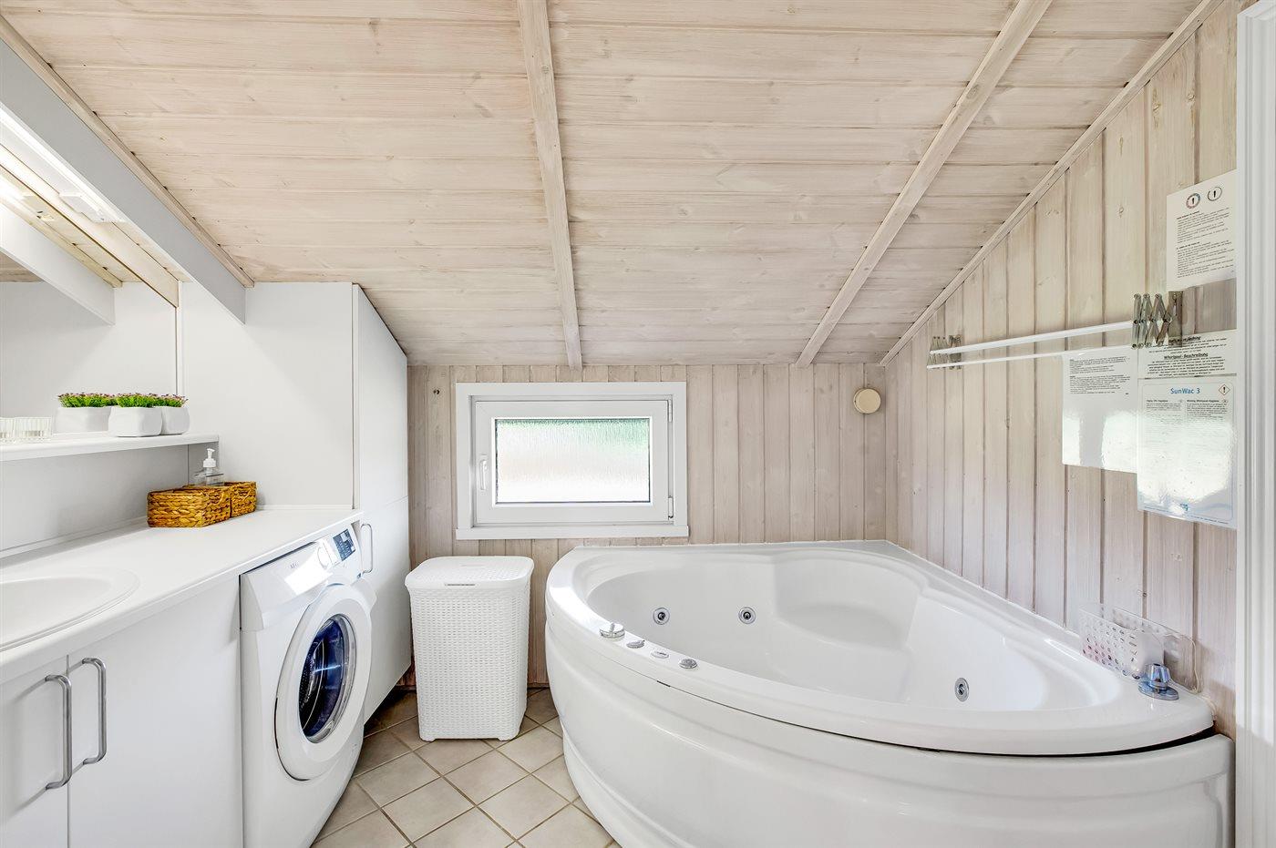 Pænt badeværelse med opvarmet flisegulv, bruseniche, vaskemaskine, 2-pers. spa og adgang til husets sauna. Det moderne og veludstyrede køkken indeholder bl.a. køleskab, fryser, opvaskemaskine, mikrobølgeovn, keramiske kogeplader og varmluftovn.