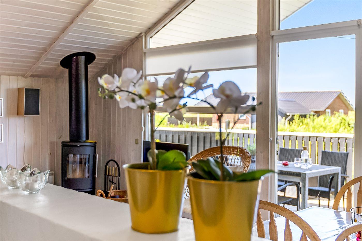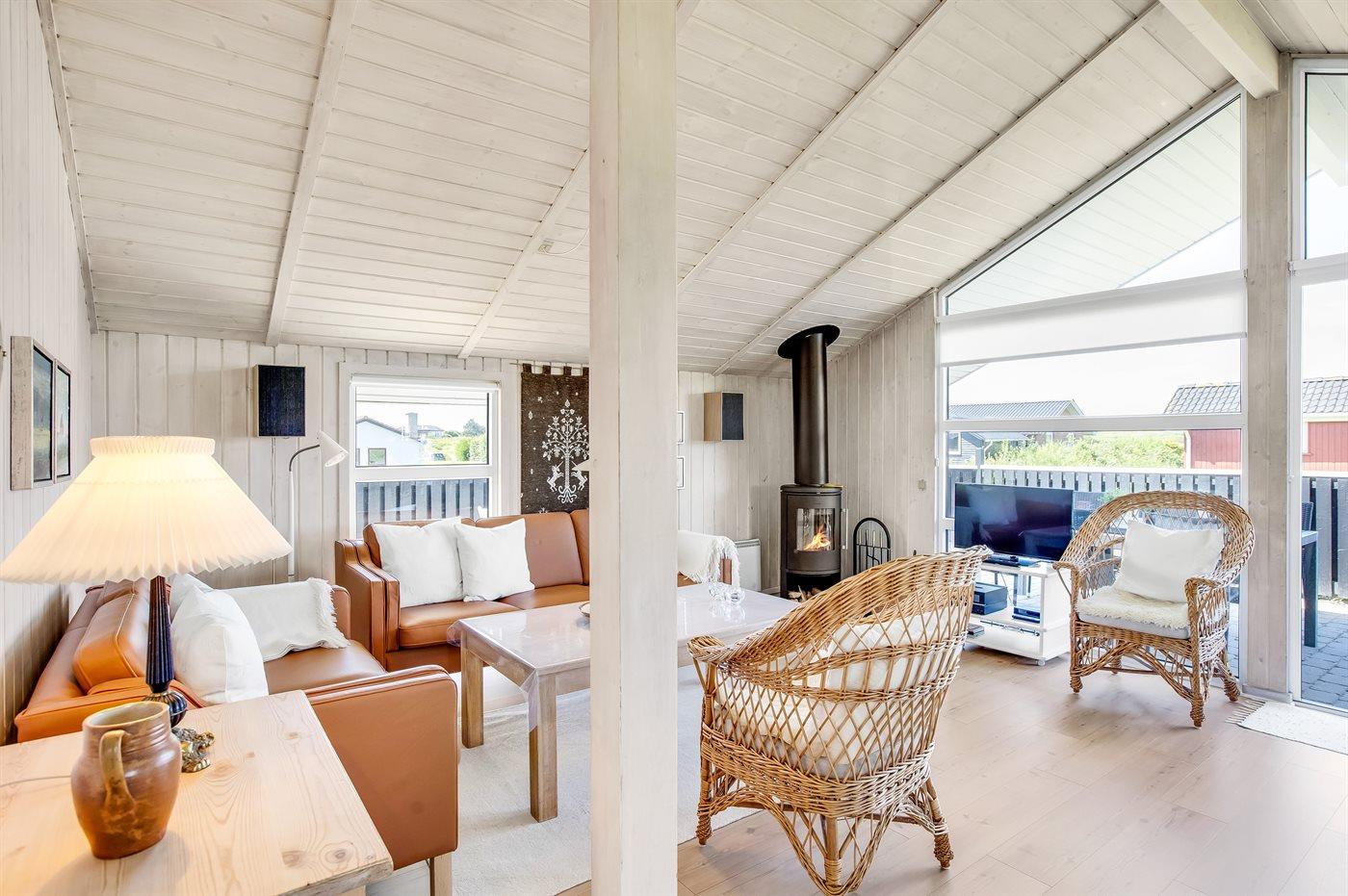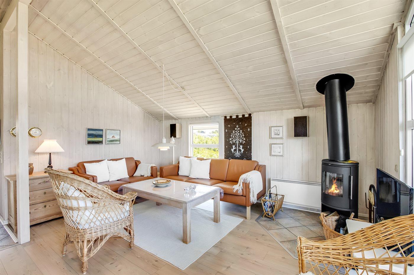 Den hyggelige opholdsstue indeholder brændeovn, radio, stereoanlæg med CD-afspiller, Smart-TV, Chromecast og parabol, der er mindst 4 danske kanaler og mindst 4 tyske kanaler, norske og svenske kanaler. Der er trådløs internetforbindelse til rådighed. Feriehuset er udstyret med energibesparende luft til luft varmepumpe (klimaanlæg) og alle lamper er forsynet med energibesparende LED pærer.