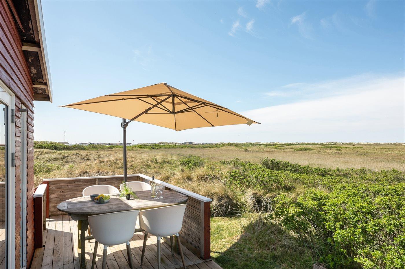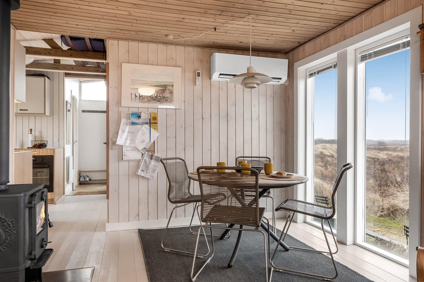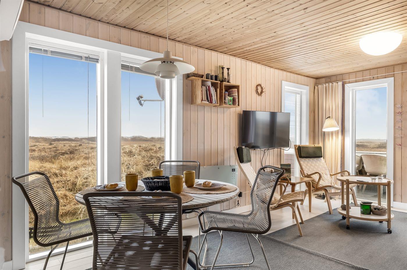 Dette lille, hyggelige sommerhus i træ, bygget i 1950 og løbende renoveret med bl.a. nyt køkken i 2026, ligger med en fantastisk, ugenert udsigt over Vesterhavet. Huset ligger i forreste række i en lille fredelig enklave med 13 huse i et fredet naturområde. Der er gåafstand til butikker og 300 m til stranden. Nyd den fantastiske solnedgang og naturen. Råvildt, harer, fasaner og ræven mødes ikke sjældent.