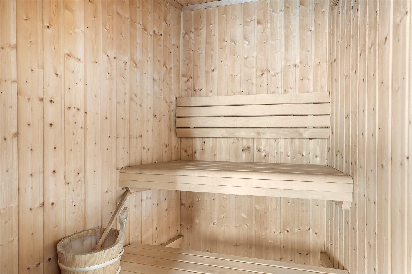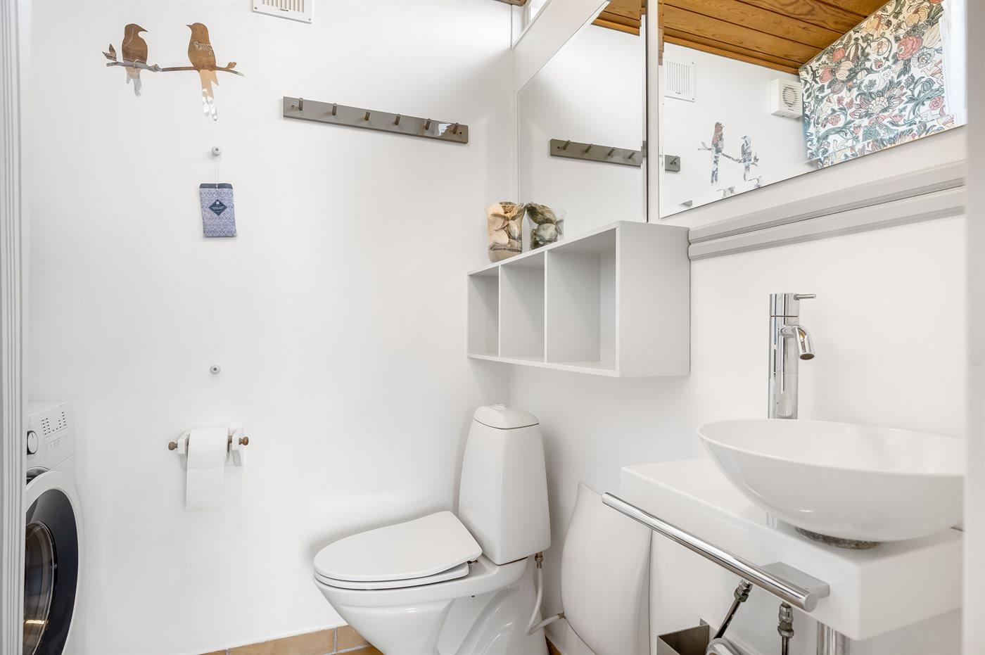 Badeværelse med bruser, gulvvarme, vaskemaskine og tørretumbler. Sauna. Køkkenet med bl.a. opvaskemaskine, induktionskogeplader og fryser ligger i forbindelse med opholdsstuen, som er udstyret med bl.a. brændeovn, fladskærms-TV med parabolantenne, DVD-afspiller og bluetooth højtaler (SONOS).