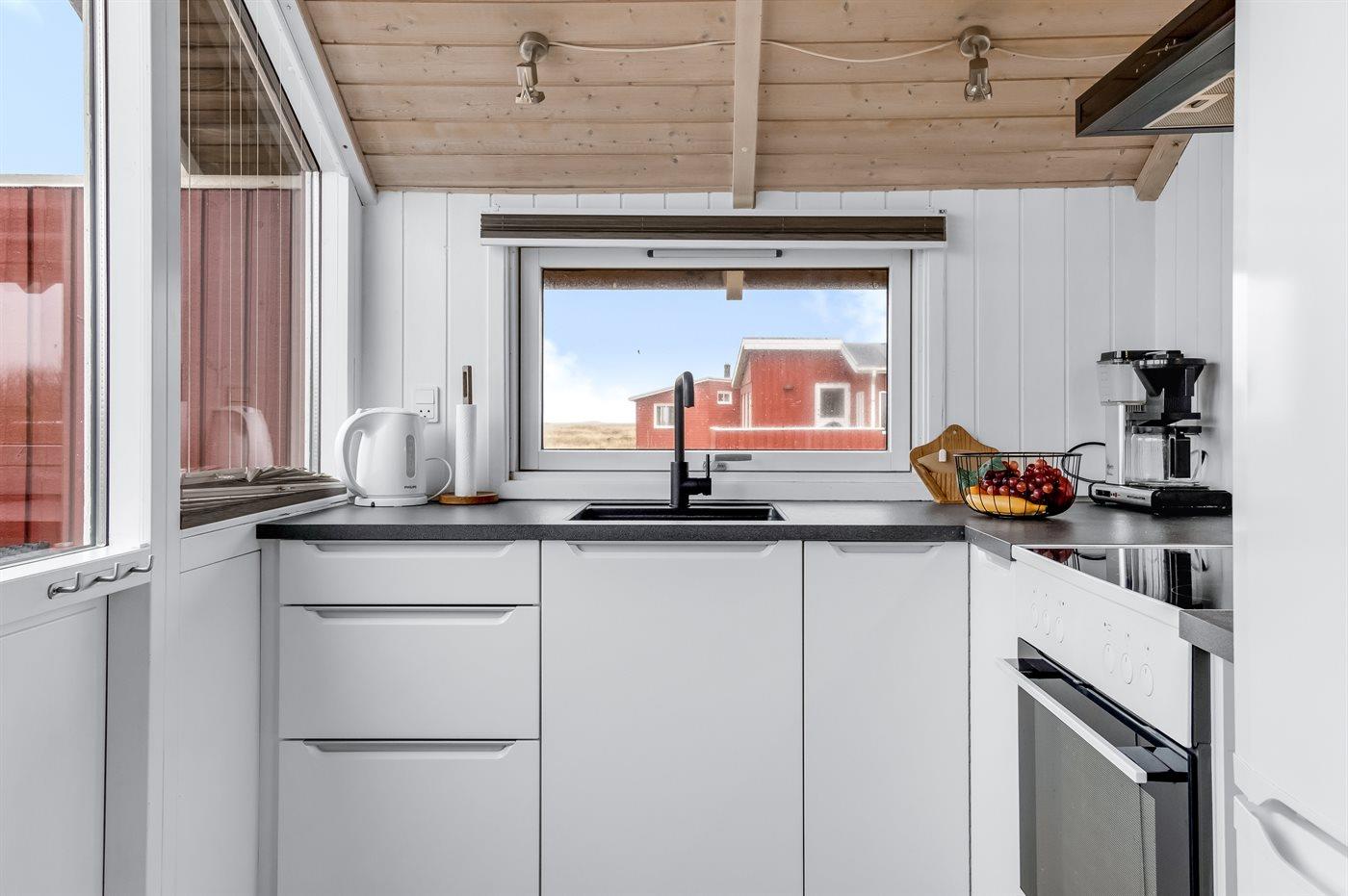 Køkkenet er udstyret med 1 køleskab. Der er 4 elkogeplader, bageovn.