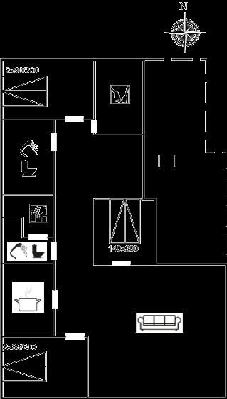 Køkkenet er udstyret med 1 køleskab. Der er 4 elkogeplader, bageovn, mikrobølgeovn samt opvaskemaskine.