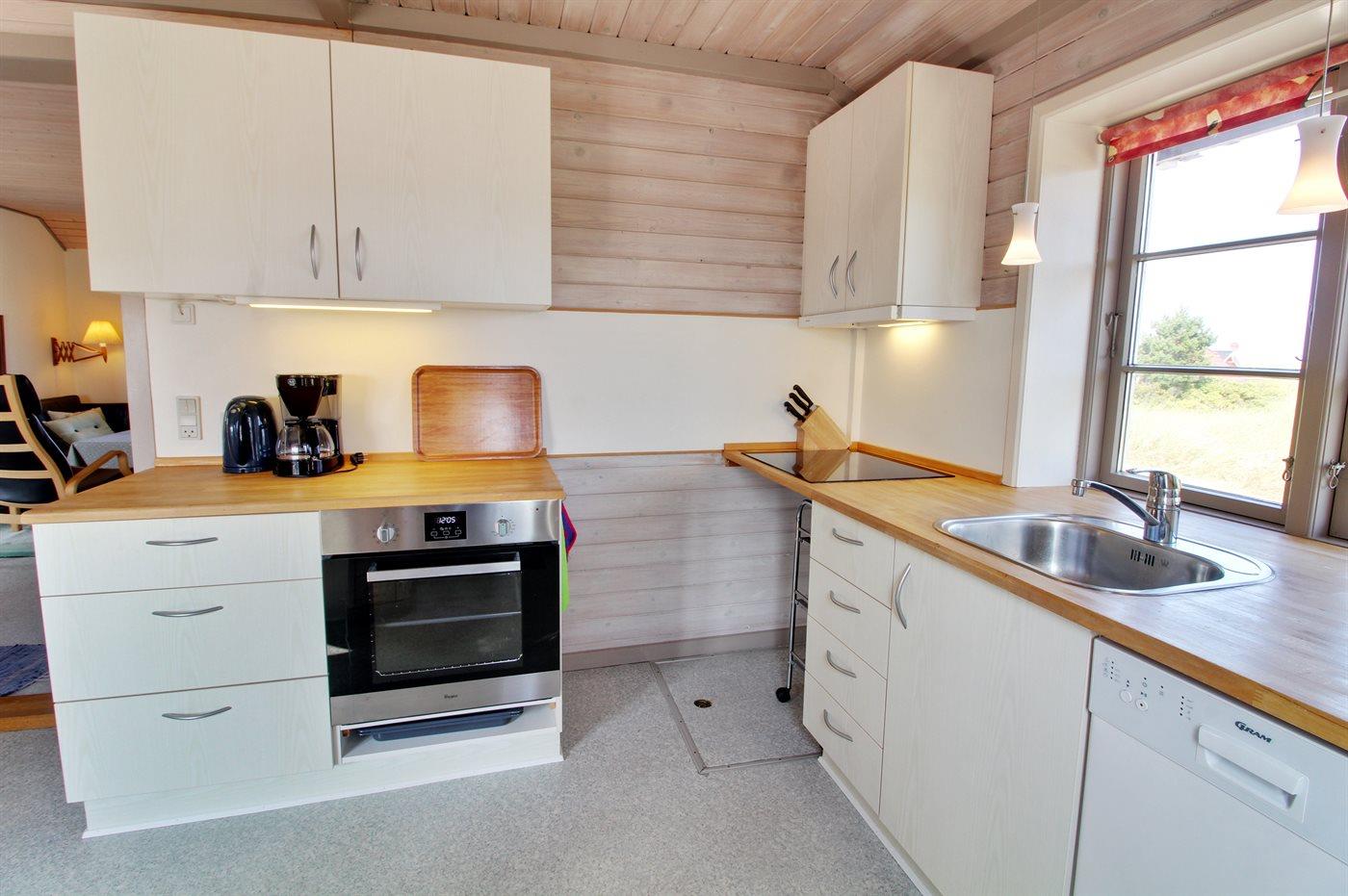 Køkkenet er udstyret med 1 køleskab. Der er 4 keramiske kogeplader, varmluftovn samt opvaskemaskine.