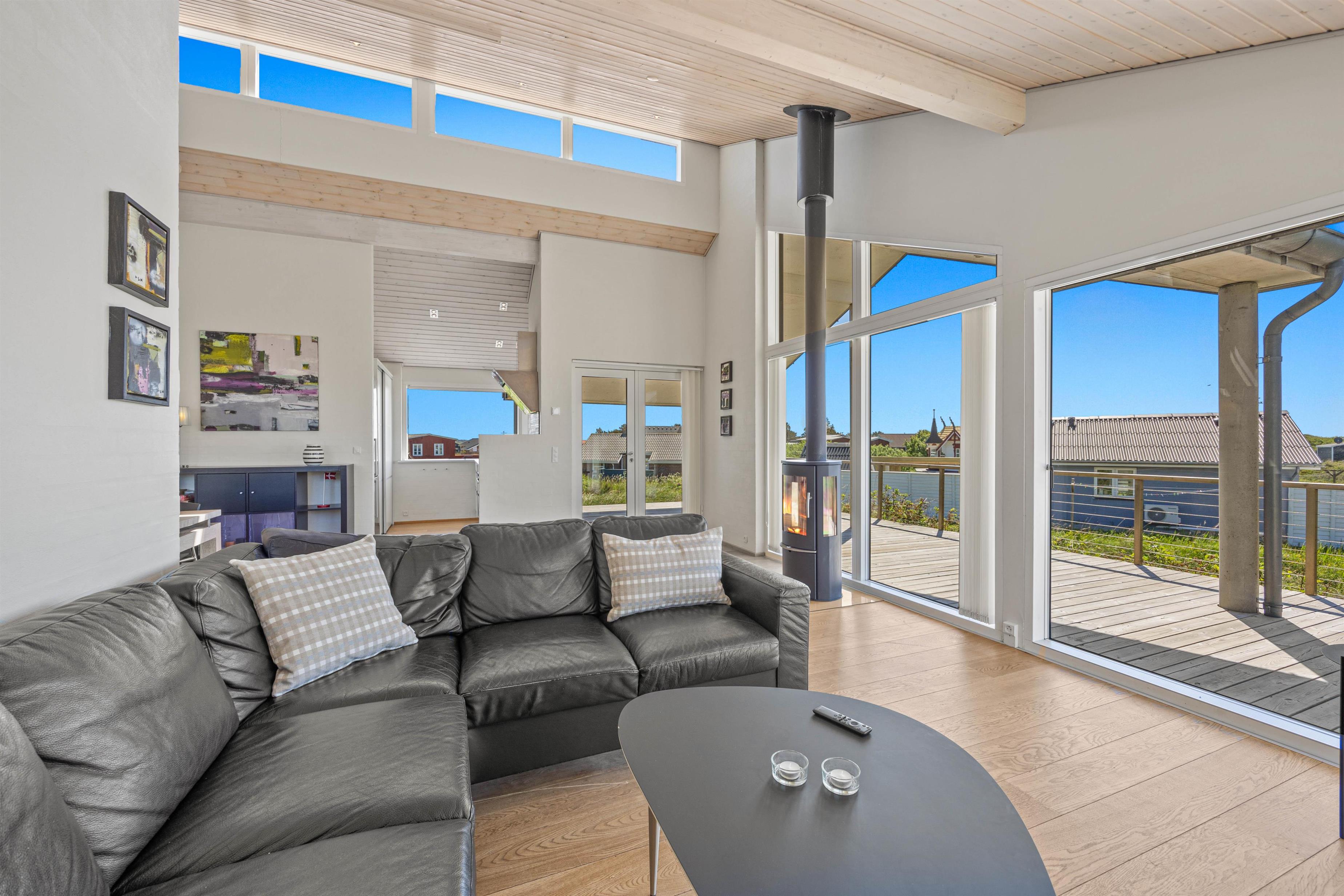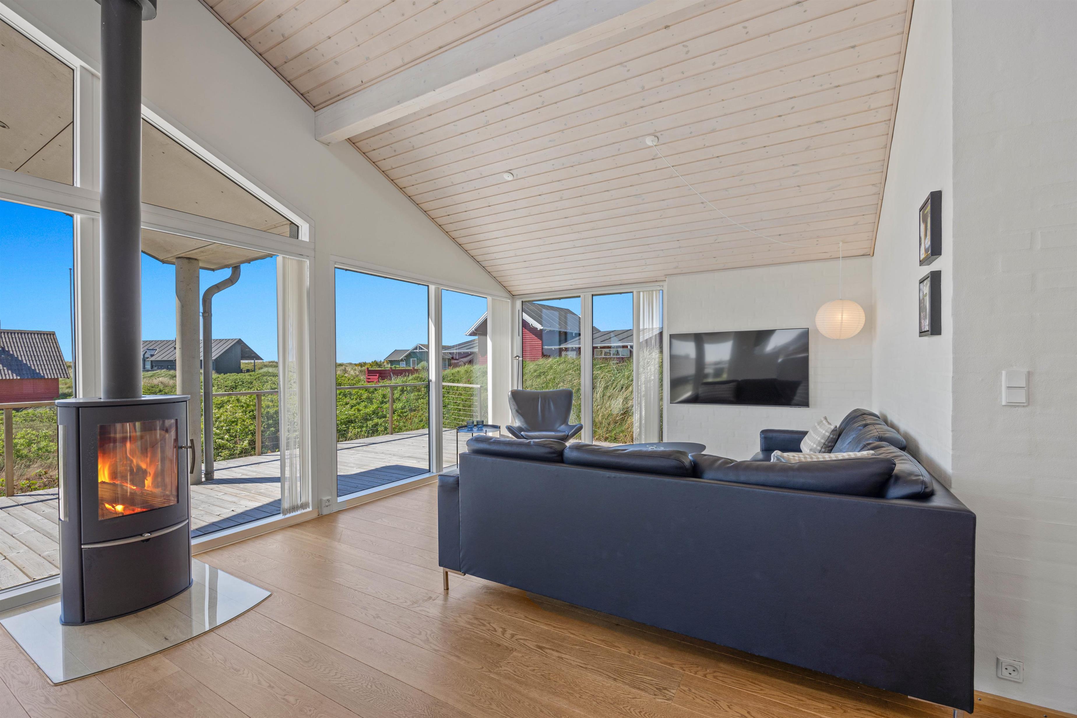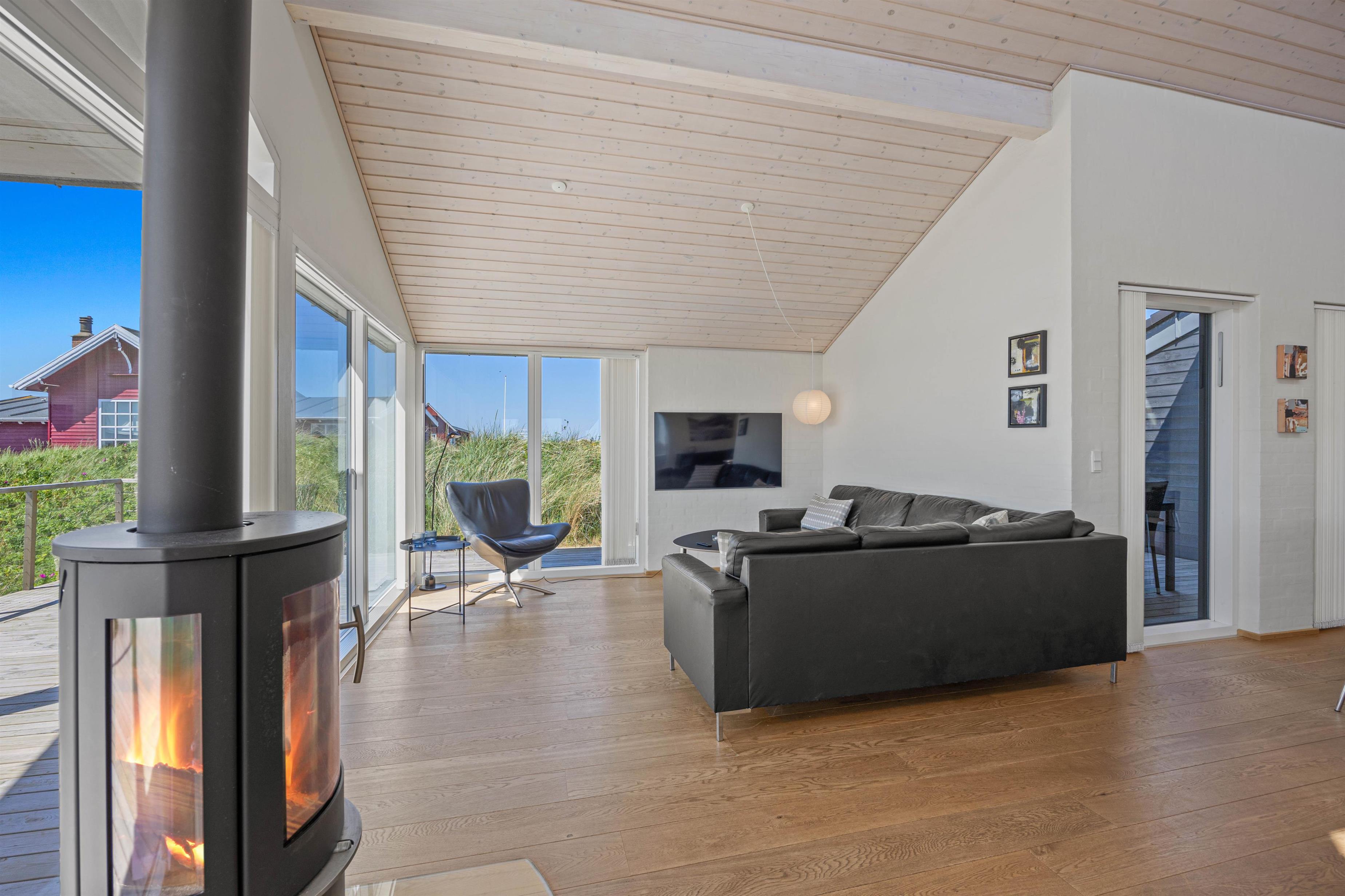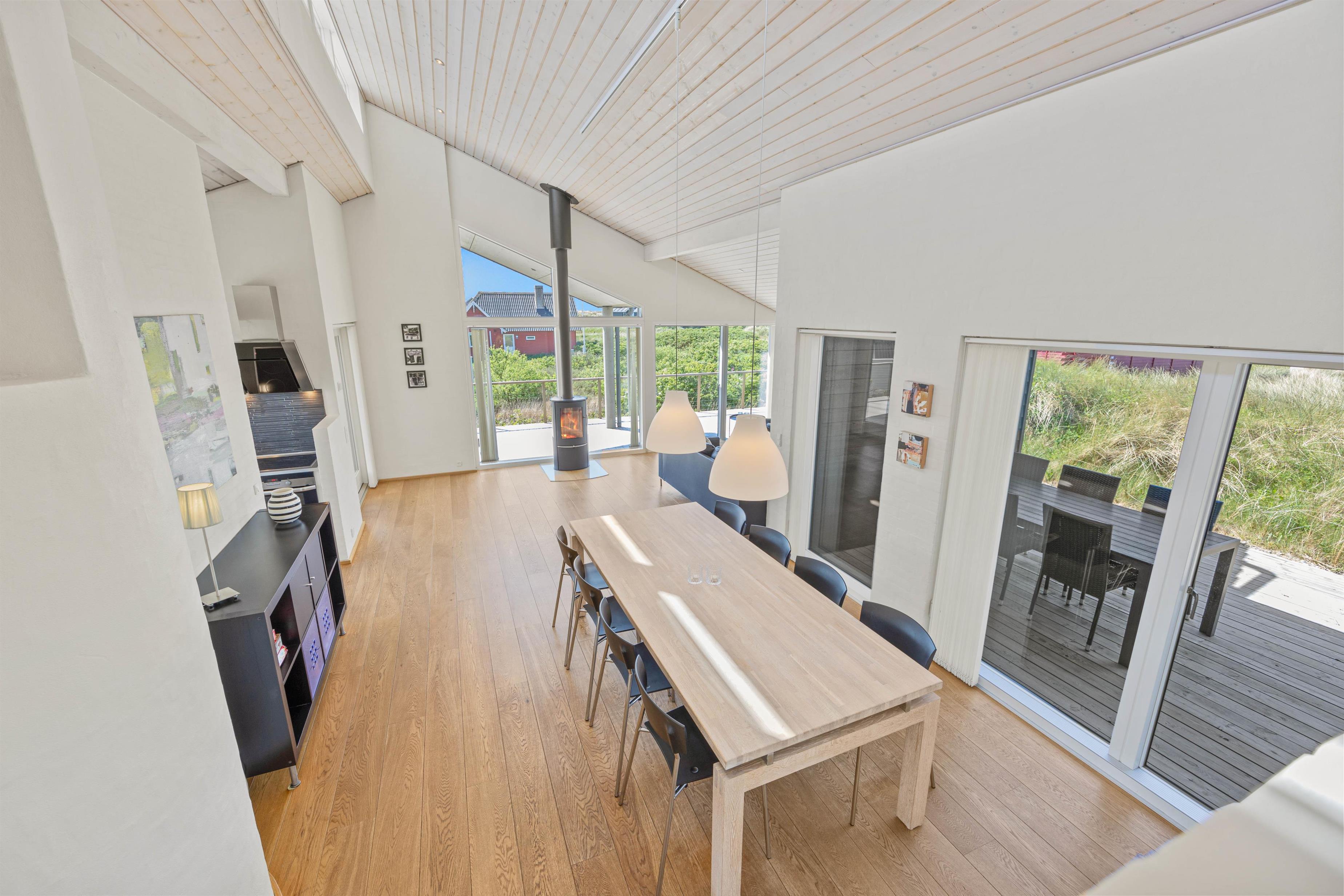 Den lyse og moderne indretning i feriehuset giver en let og luftig feriestemning straks, I træder ind ad døren. Det fine lysindfald, loft op i kip og de arkitektoniske detaljer medvirker til et miljø, hvor man føler feriehusets varme og samklang med naturen. I det rummelige opholdsrum kan I samles omkring ilden i brændeovnen på hyggelige aftener, mens I drøfter dagens oplevelser. Det åbne køkken indeholder alt, hvad I har brug for til at forkæle hinanden med lækre hjemmelavede måltider, herunder induktionskomfur, opvaskemaskine og en separat fryser på 110 liter.