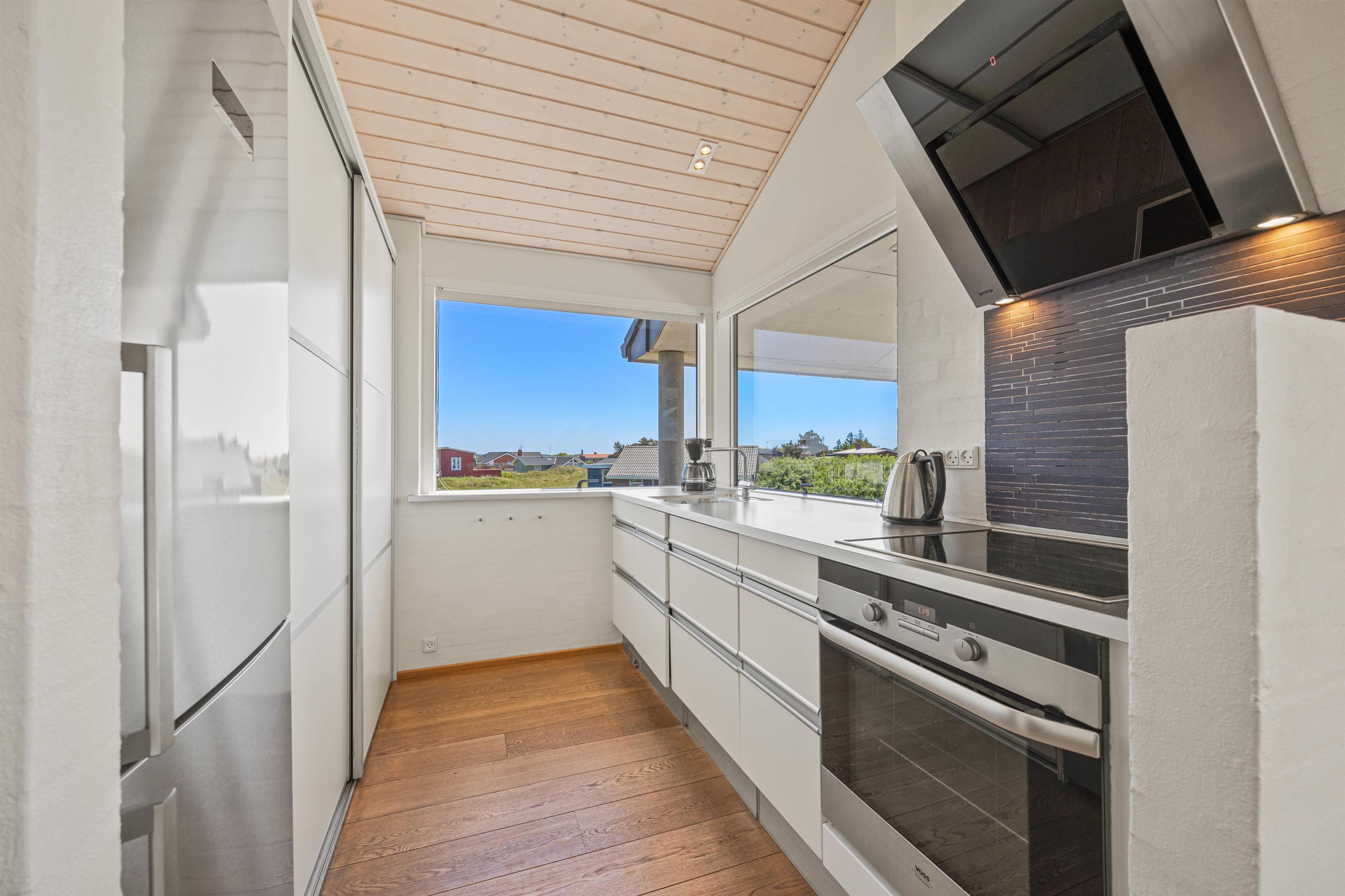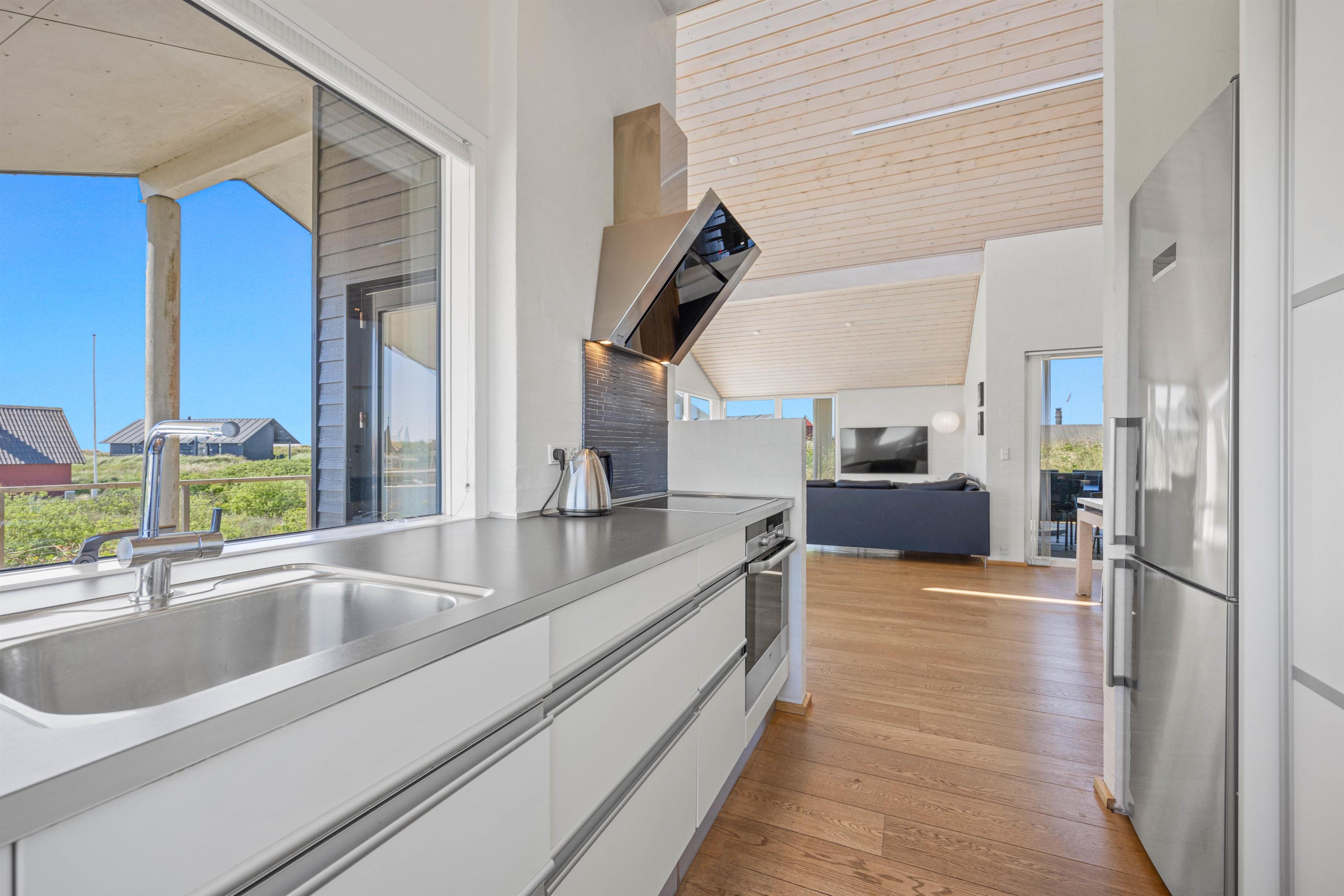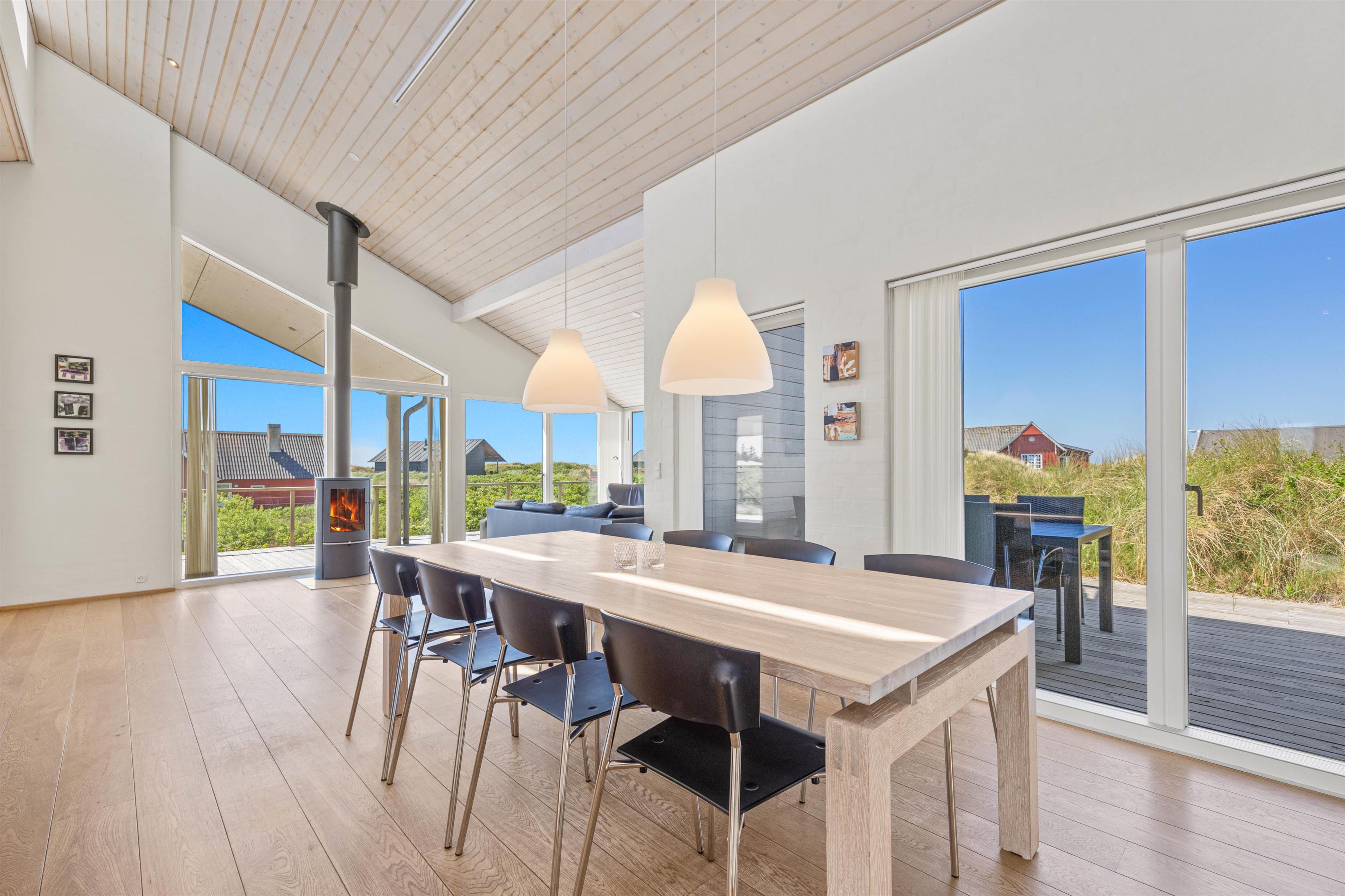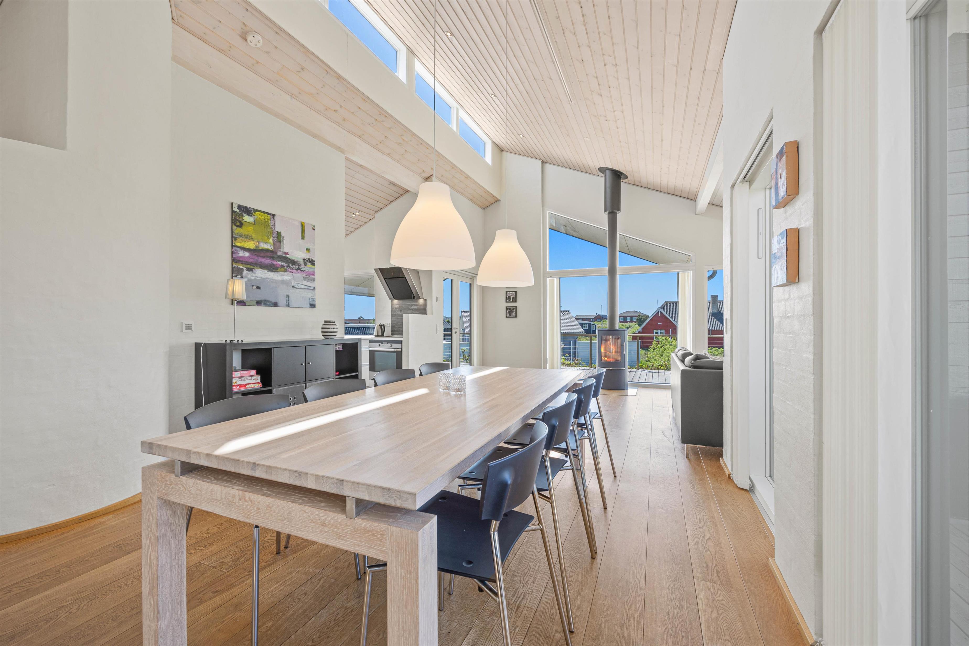 Den lyse og moderne indretning i feriehuset giver en let og luftig feriestemning straks, I træder ind ad døren. Det fine lysindfald, loft op i kip og de arkitektoniske detaljer medvirker til et miljø, hvor man føler feriehusets varme og samklang med naturen. I det rummelige opholdsrum kan I samles omkring ilden i brændeovnen på hyggelige aftener, mens I drøfter dagens oplevelser. Det åbne køkken indeholder alt, hvad I har brug for til at forkæle hinanden med lækre hjemmelavede måltider, herunder induktionskomfur, opvaskemaskine og en separat fryser på 110 liter.