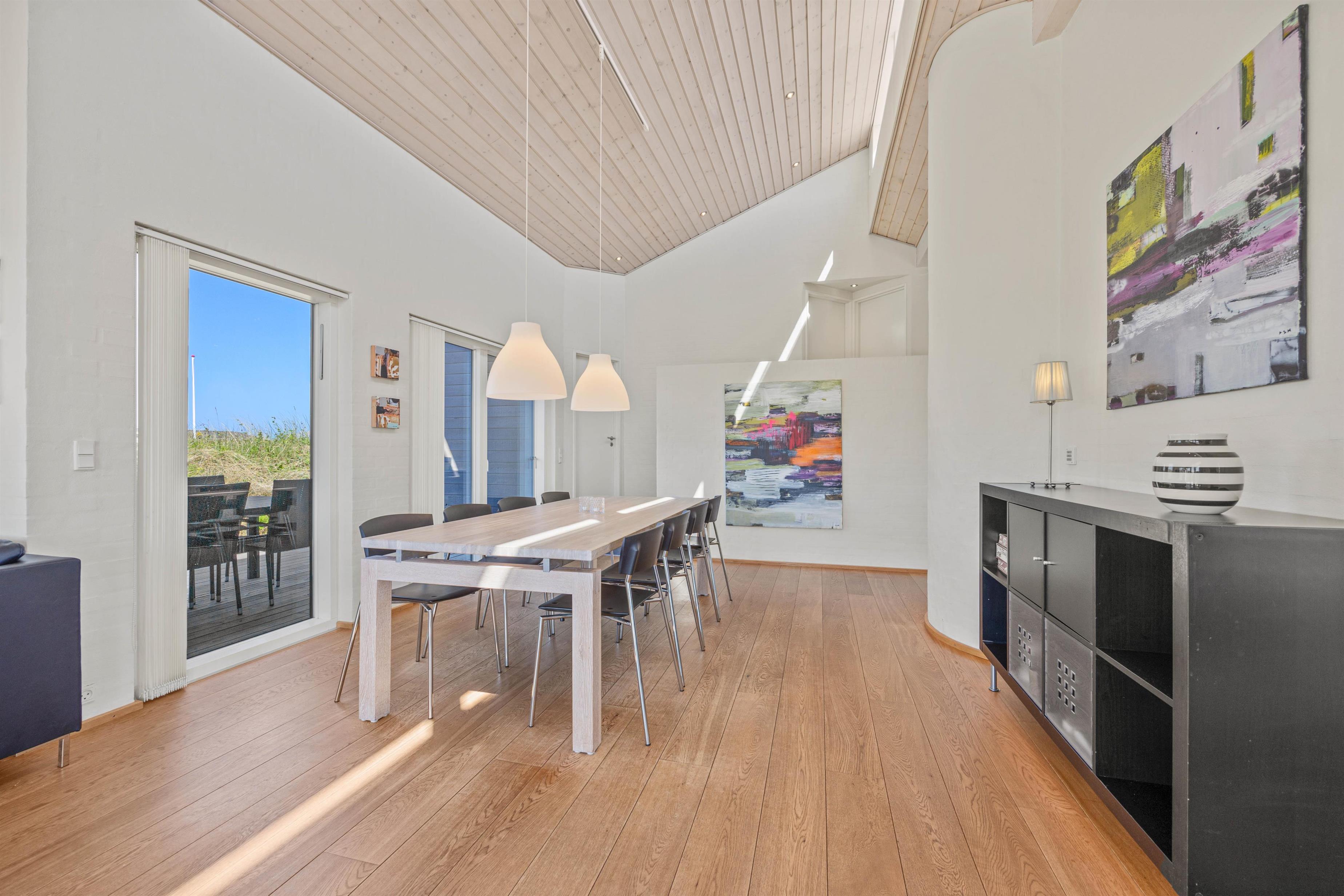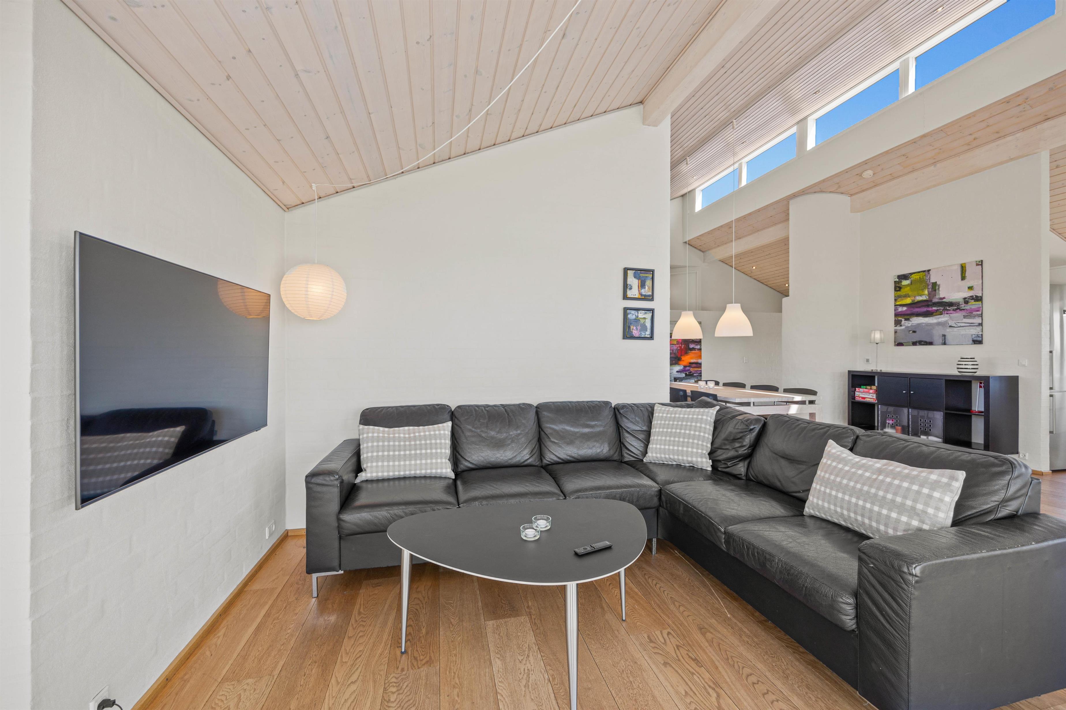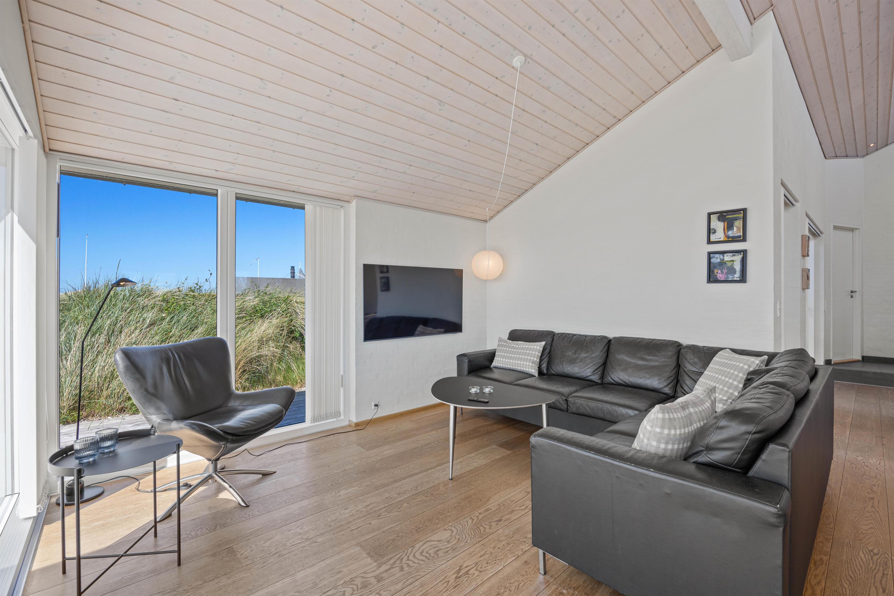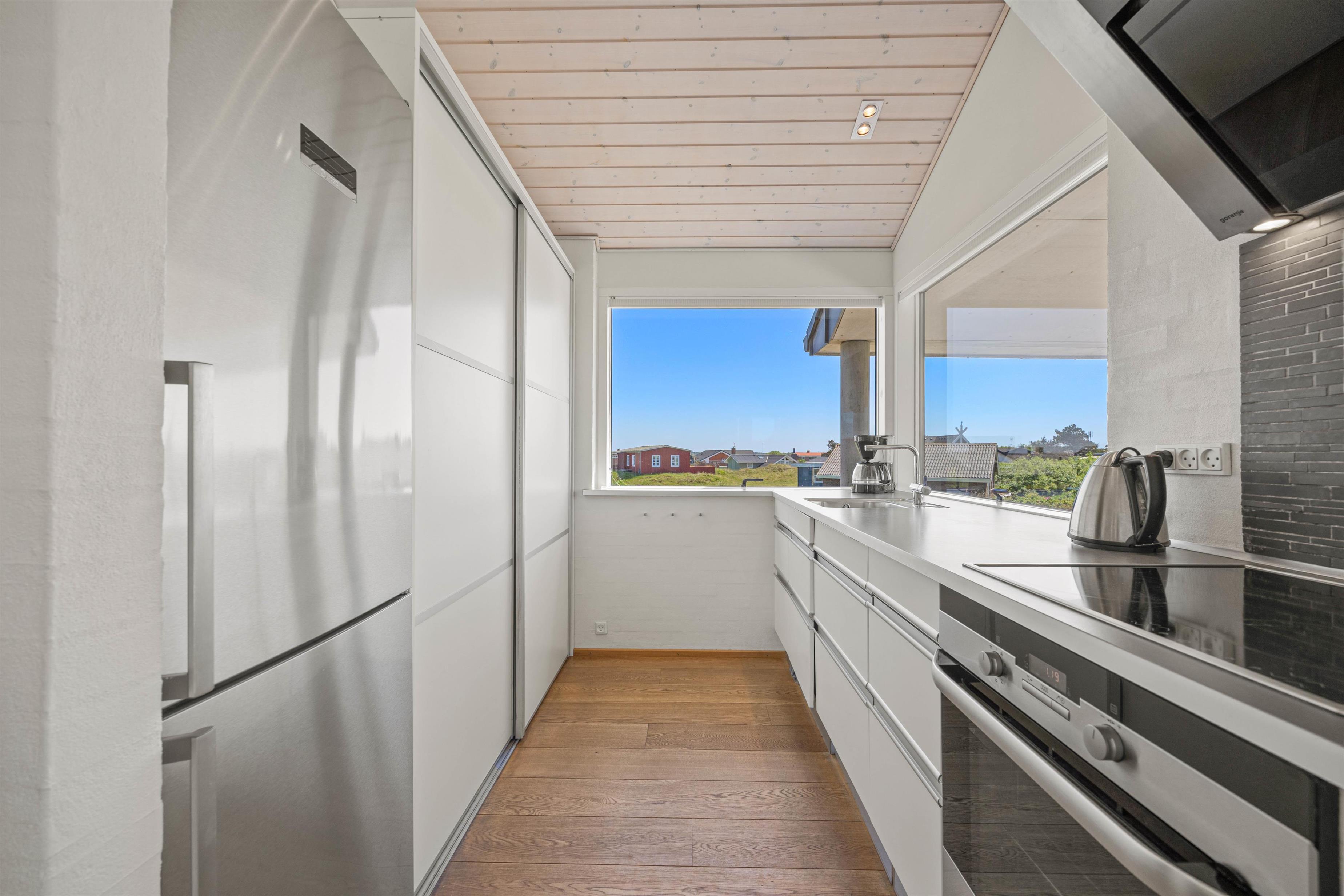 Den lyse og moderne indretning i feriehuset giver en let og luftig feriestemning straks, I træder ind ad døren. Det fine lysindfald, loft op i kip og de arkitektoniske detaljer medvirker til et miljø, hvor man føler feriehusets varme og samklang med naturen. I det rummelige opholdsrum kan I samles omkring ilden i brændeovnen på hyggelige aftener, mens I drøfter dagens oplevelser. Det åbne køkken indeholder alt, hvad I har brug for til at forkæle hinanden med lækre hjemmelavede måltider, herunder induktionskomfur, opvaskemaskine og en separat fryser på 110 liter.