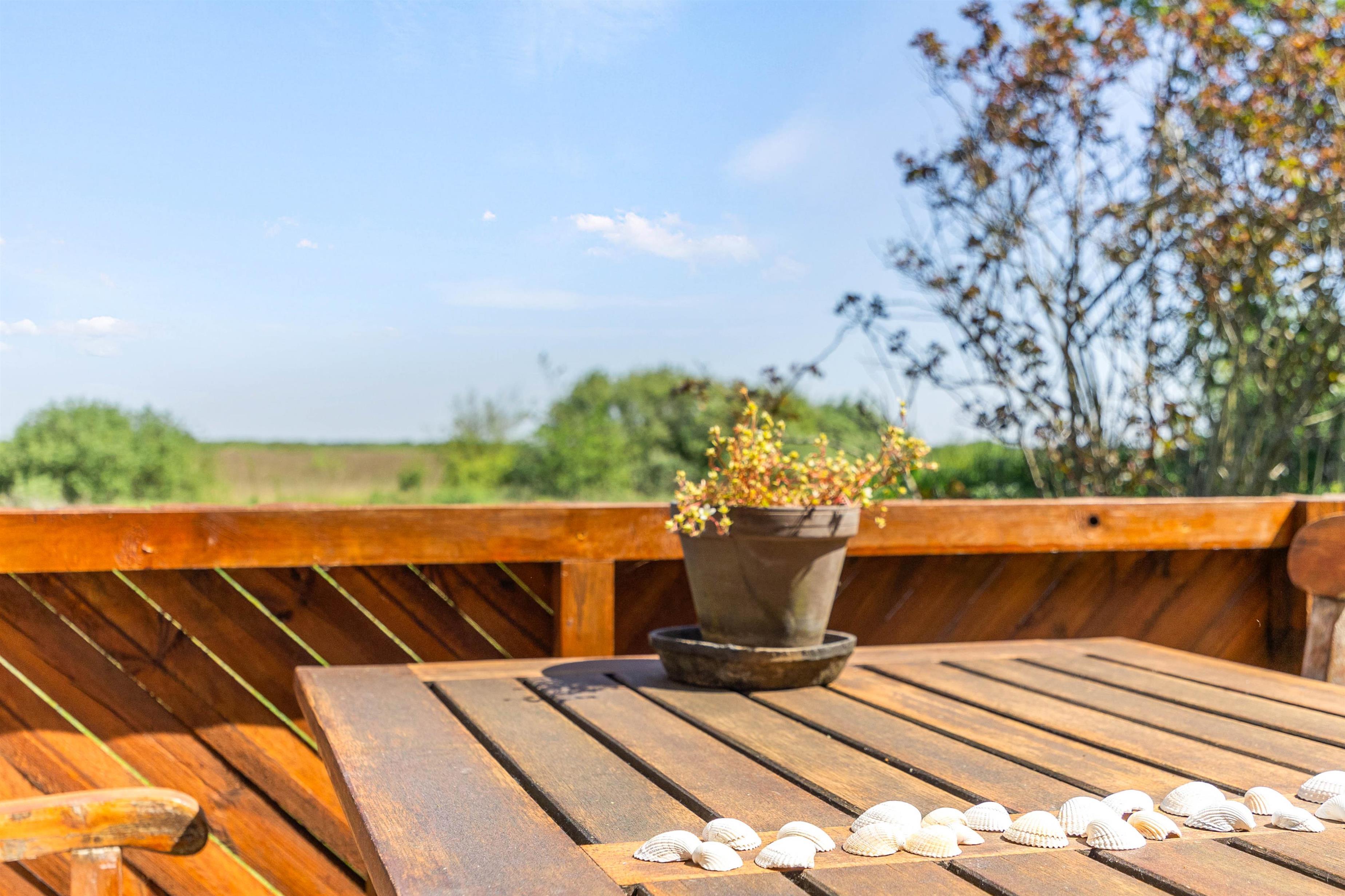 Udenfor findes en stor, delvist overdækket terrasse med siddepladser til solrige dage og hyggelige sommeraftener. Her kan I nyde varmen, morgenkaffen og ikke mindst roen. De rolige omgivelser og den smukke udsigt er helt fortryllende. Saml familien og slut aftenen af med en dejlig grillaften.