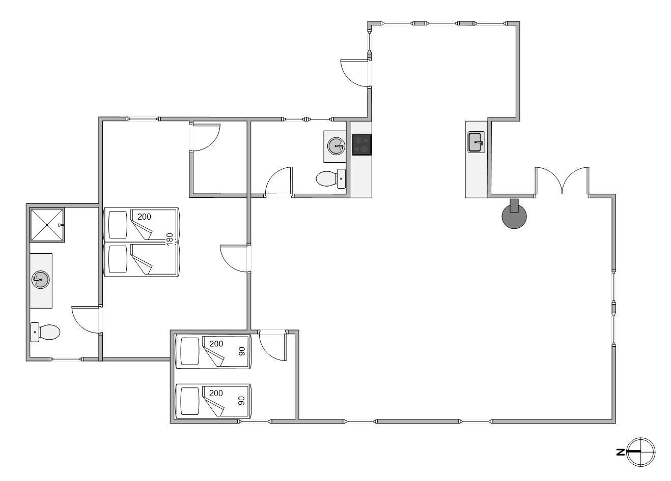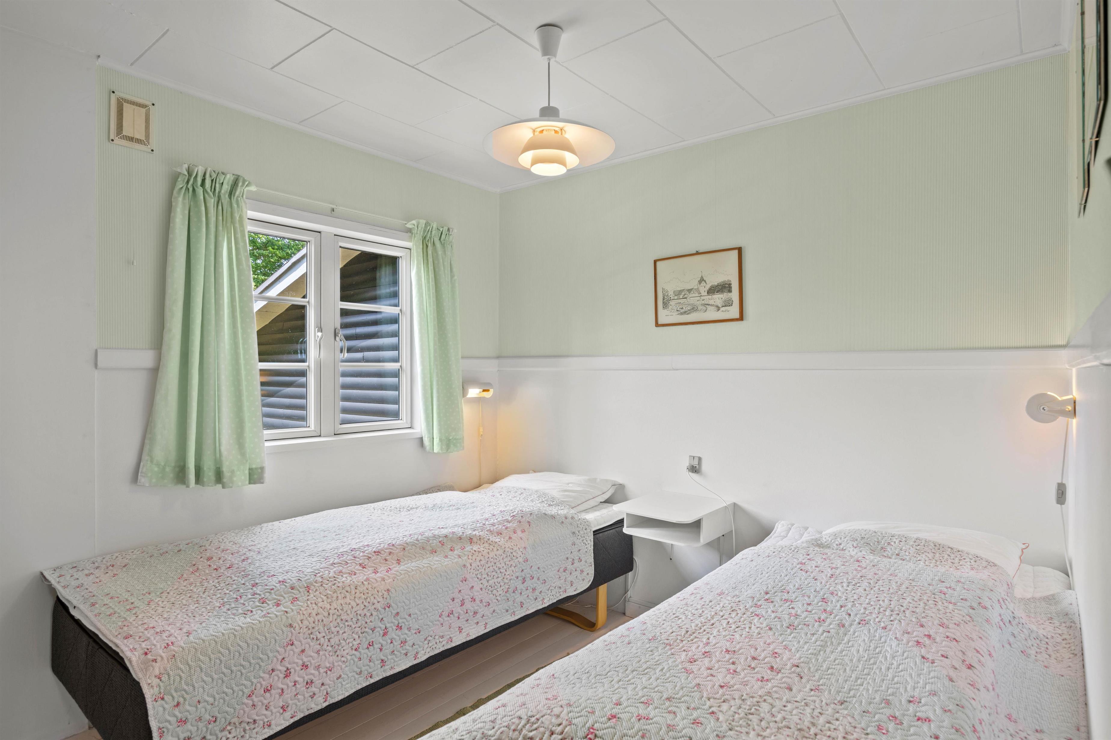 Der er to soveværelser, hvoraf det ene er indrette med 1 dobbeltseng, og den anden er indrettet med 2 enkeltsenge. Badeværelset med bruser og gulvvarme, finder I i forlængelse af det ene soveværelse og gæstetoiletet finder i ved siden af køkkenet. Sommerhuset opvarmes med en energibesparende varmepumpe, som bidrager til et behageligt indeklima.