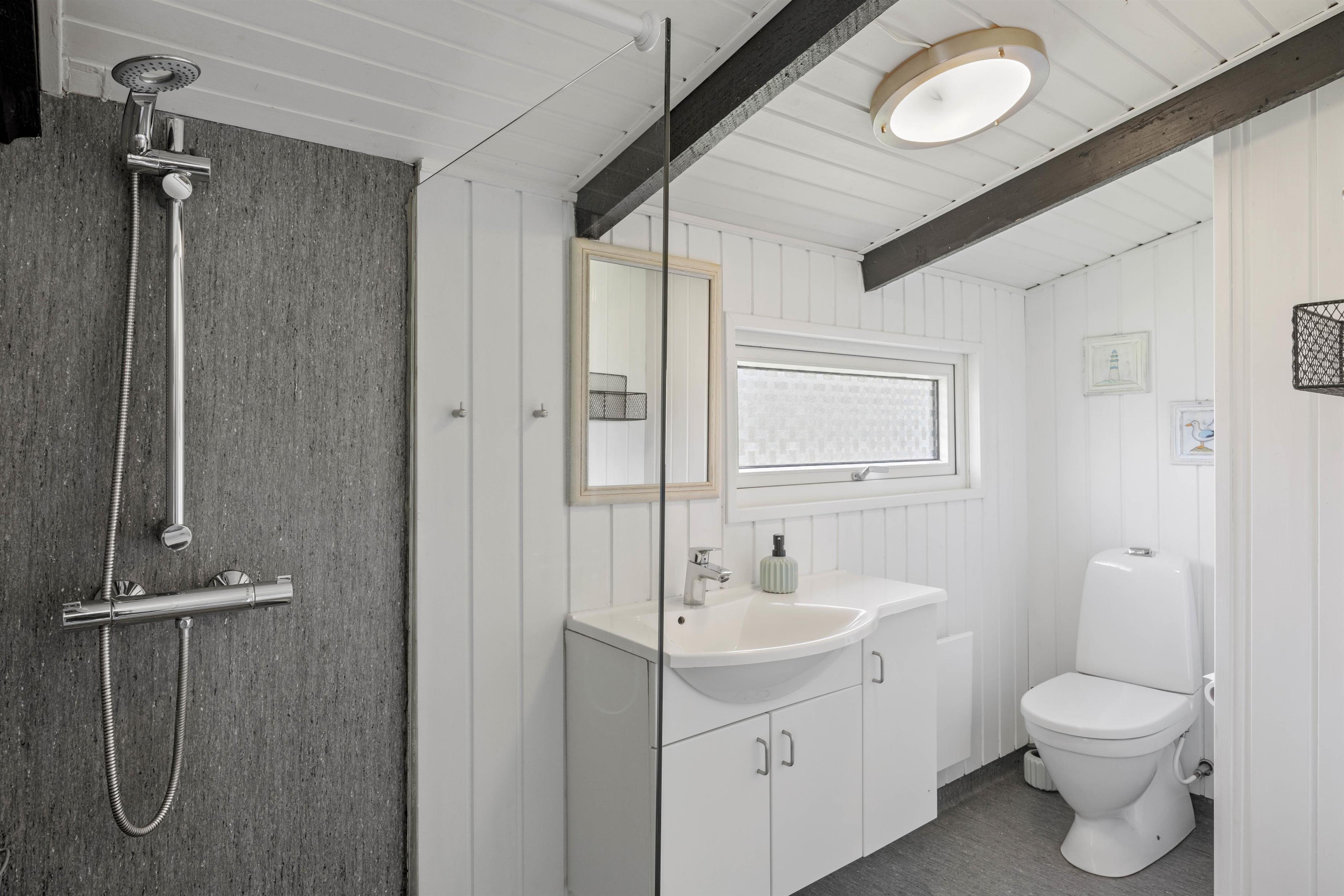 Badeværelset har gulvvarme for ekstra komfort. Derudover kan jeres elbil oplades direkte på stedet, så I kan starte ferien uden bekymringer og på en miljøvenlig måde.
