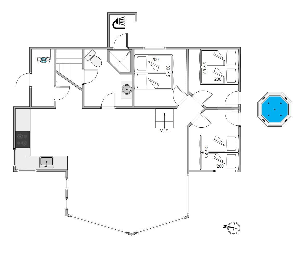 Børnene vil helt sikkert nyde hemsen, hvor de kan lege uforstyrret. De resterende sovepladser er fordelt på 3 gode værelser, som alle er indrettet med dobbeltsenge.