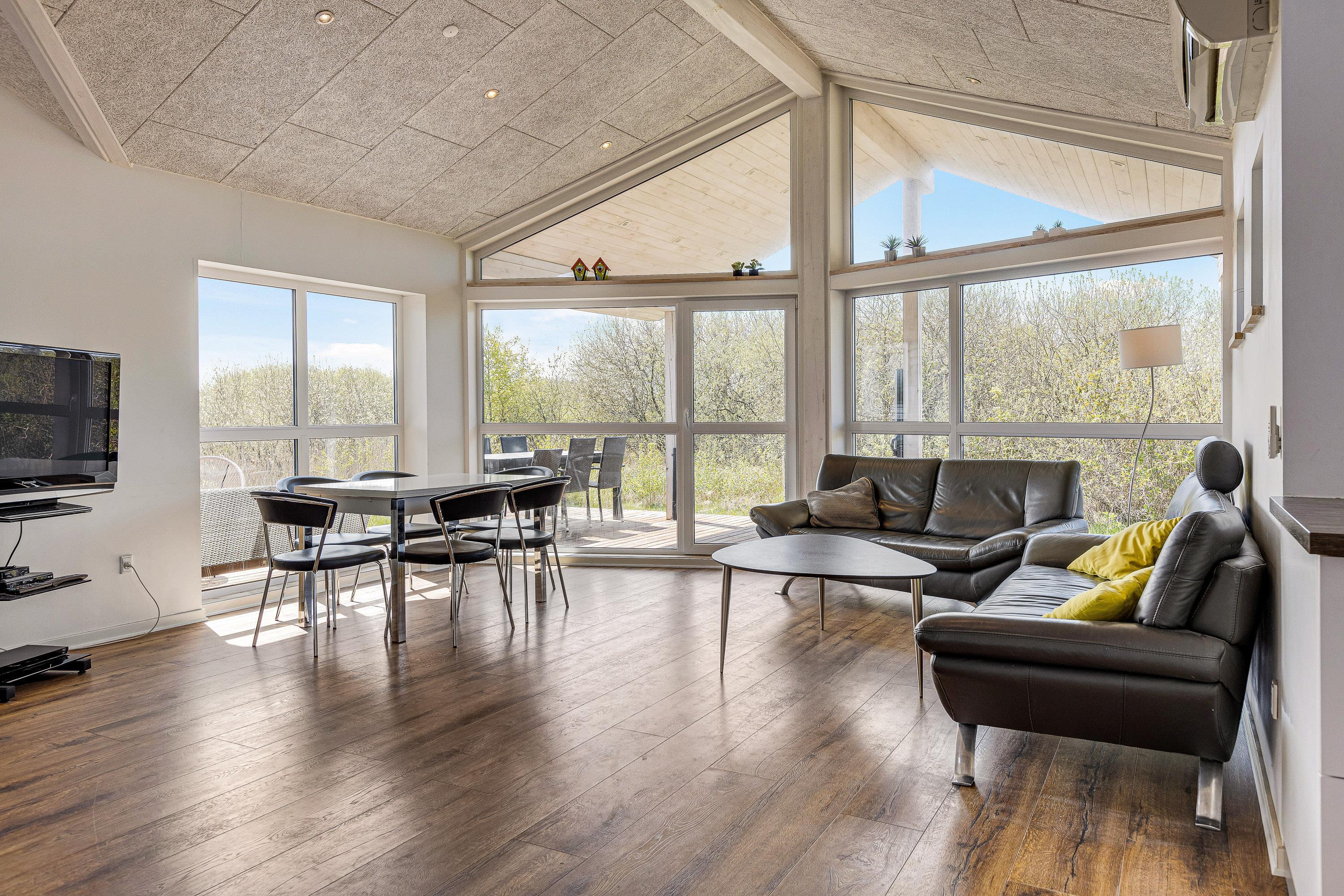 Sommerhuset er lyst og venligt indrettet. Vinduerne fra gulv til loft samt loft til kip sørger for en behagelig atmosfære og tillader dagslyset at oversvømme opholdsrummet. Fra den komfortable sofa kan I nyde udsigten til landskabet eller se jeres yndlingsfilm i fjernsynet. Her er desuden danske tv-kanaler. Den energibesparende varmepumpe sørger for en behagelig temperatur.