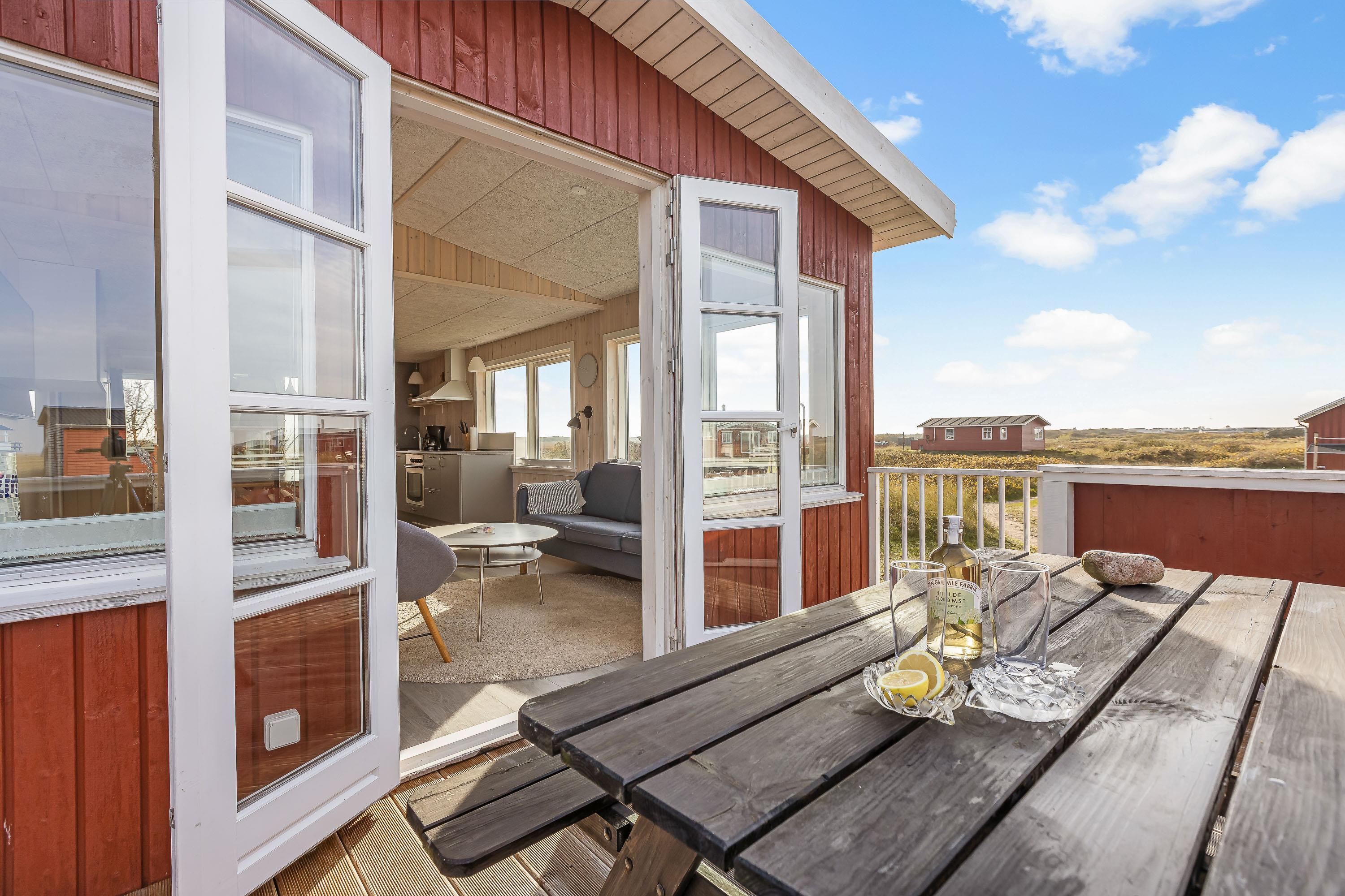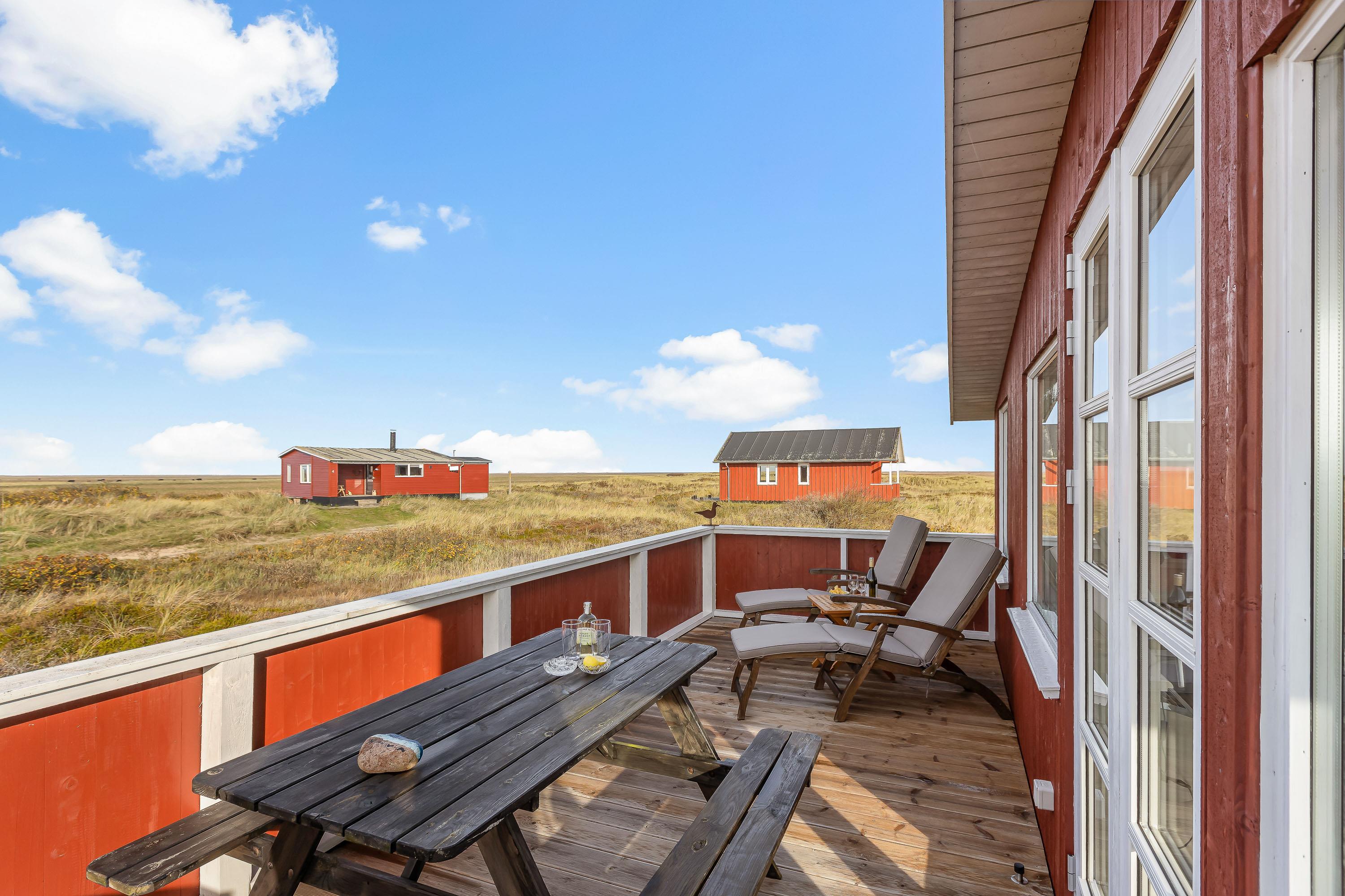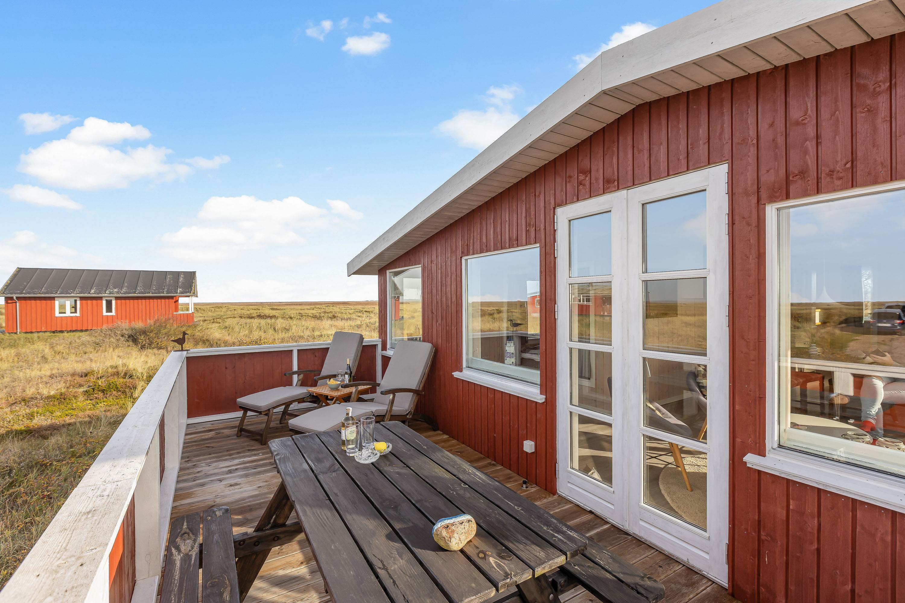 Sommerhuset to terrasser ligger hævet, hvilket giver en flot udsigt udover de åbne vidder i kystlandskabet. Den østvendte terrasse er overdækket, mens den vestvendte er åben, så her er rig mulighed for hyggelige grillaftener og måltider under åben himmel.