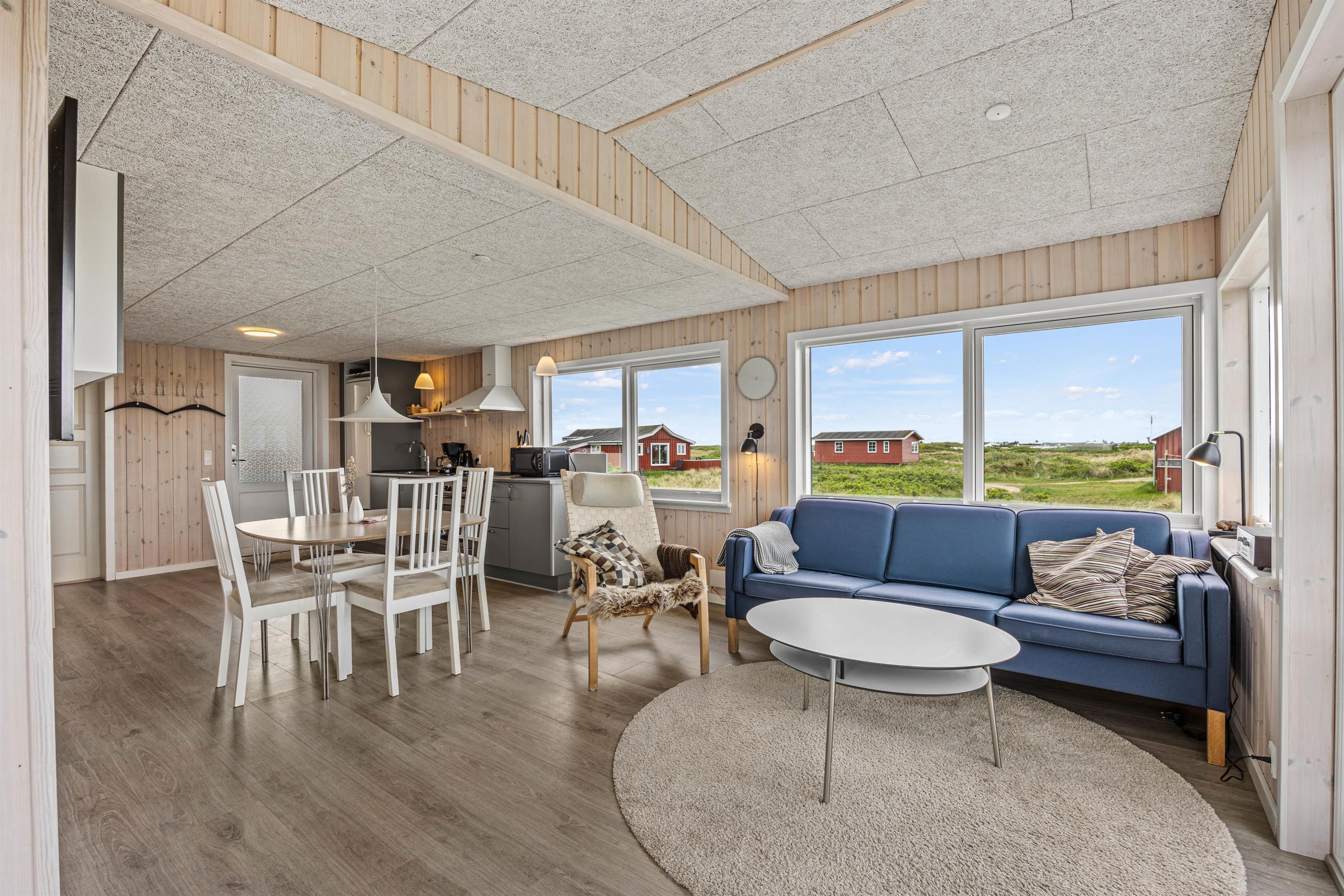 Klassisk feriehusstemning møder en, allerede når man åbner døren indtil dette hyggelige sommerhus med lyse trævægge, -gulve og -lofter. Her er virkelig lagt op til en hyggelig ferie. Køkkenet er integreret med stuen, der er indrettet med spisebord og sofahjørne.