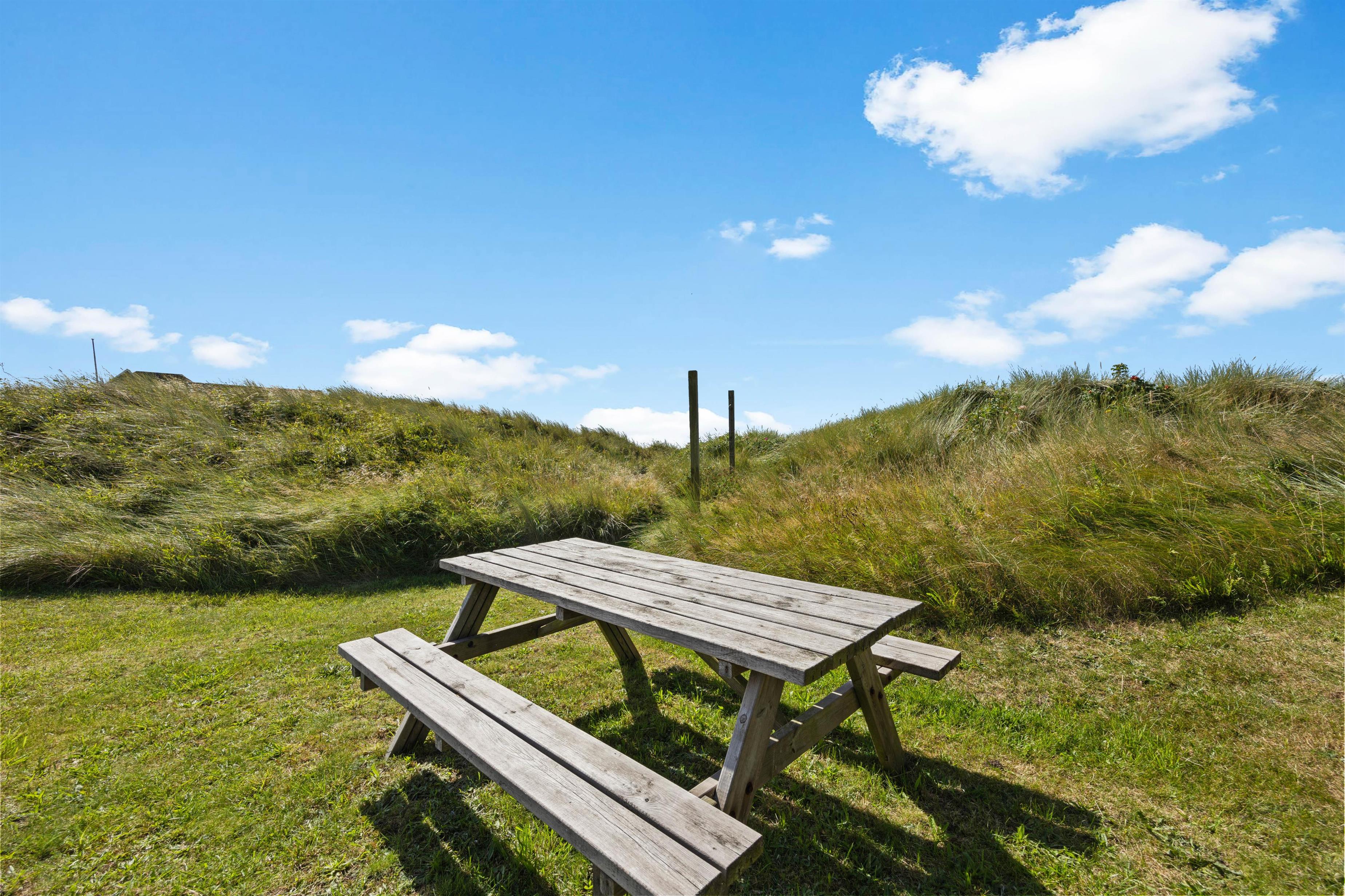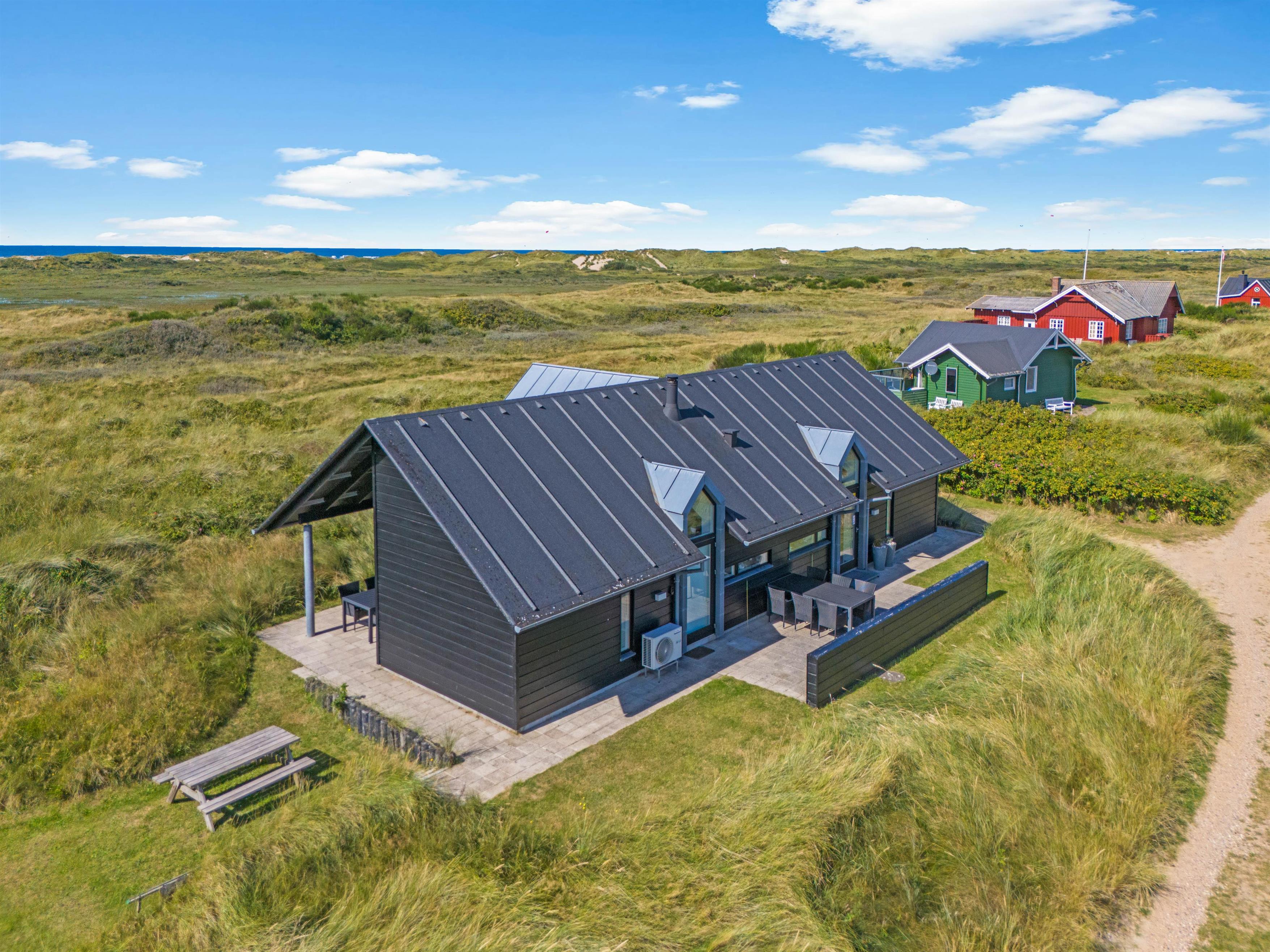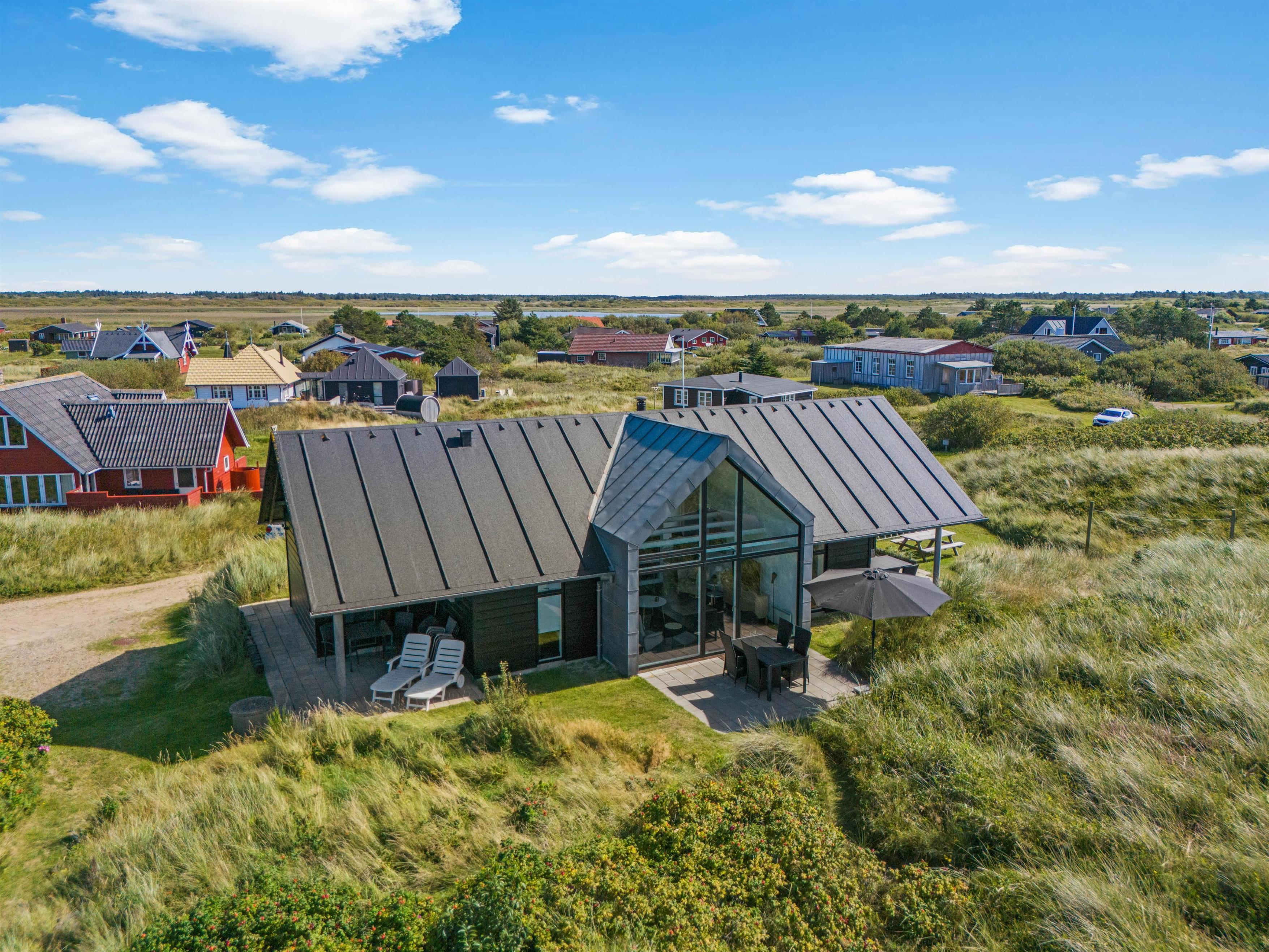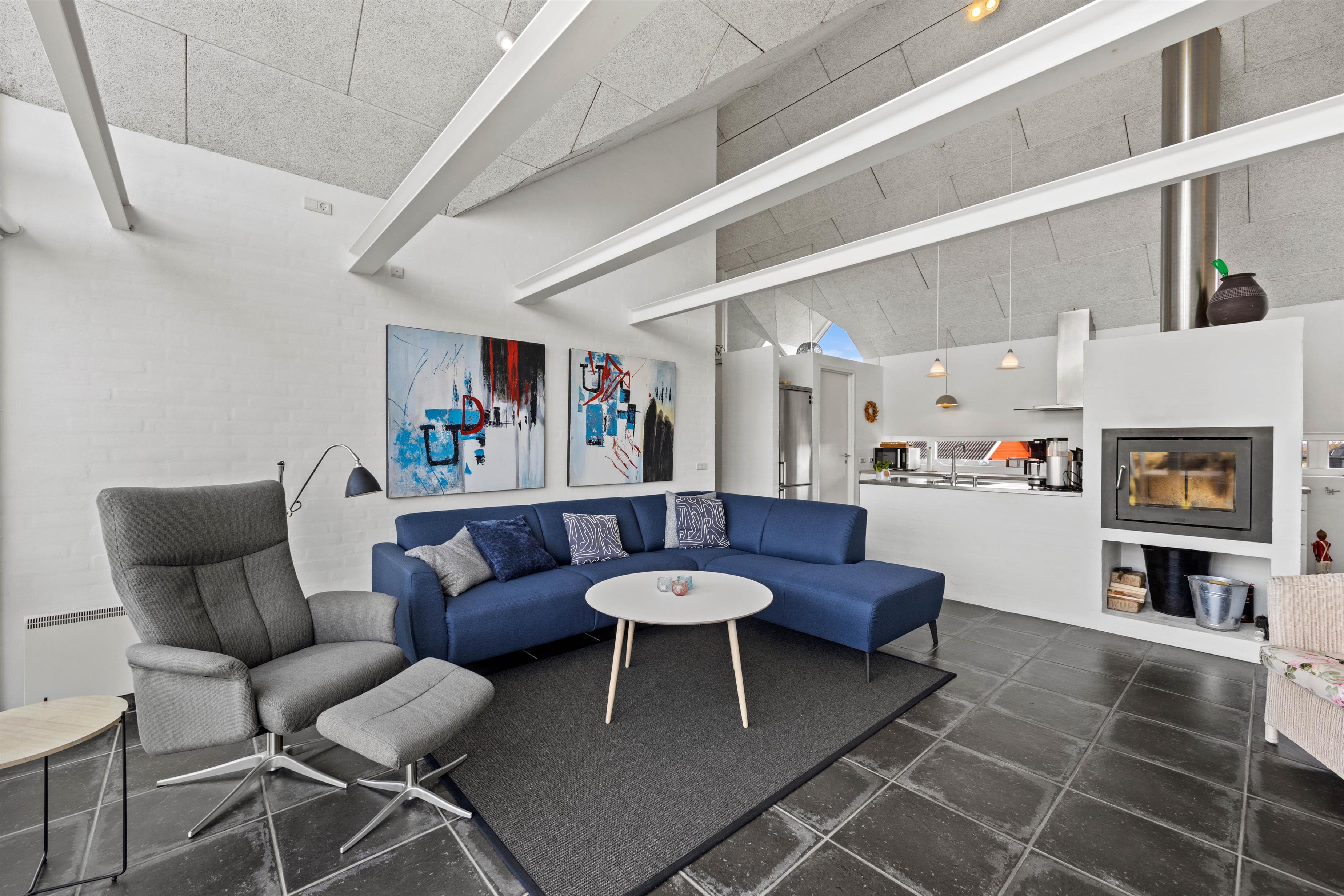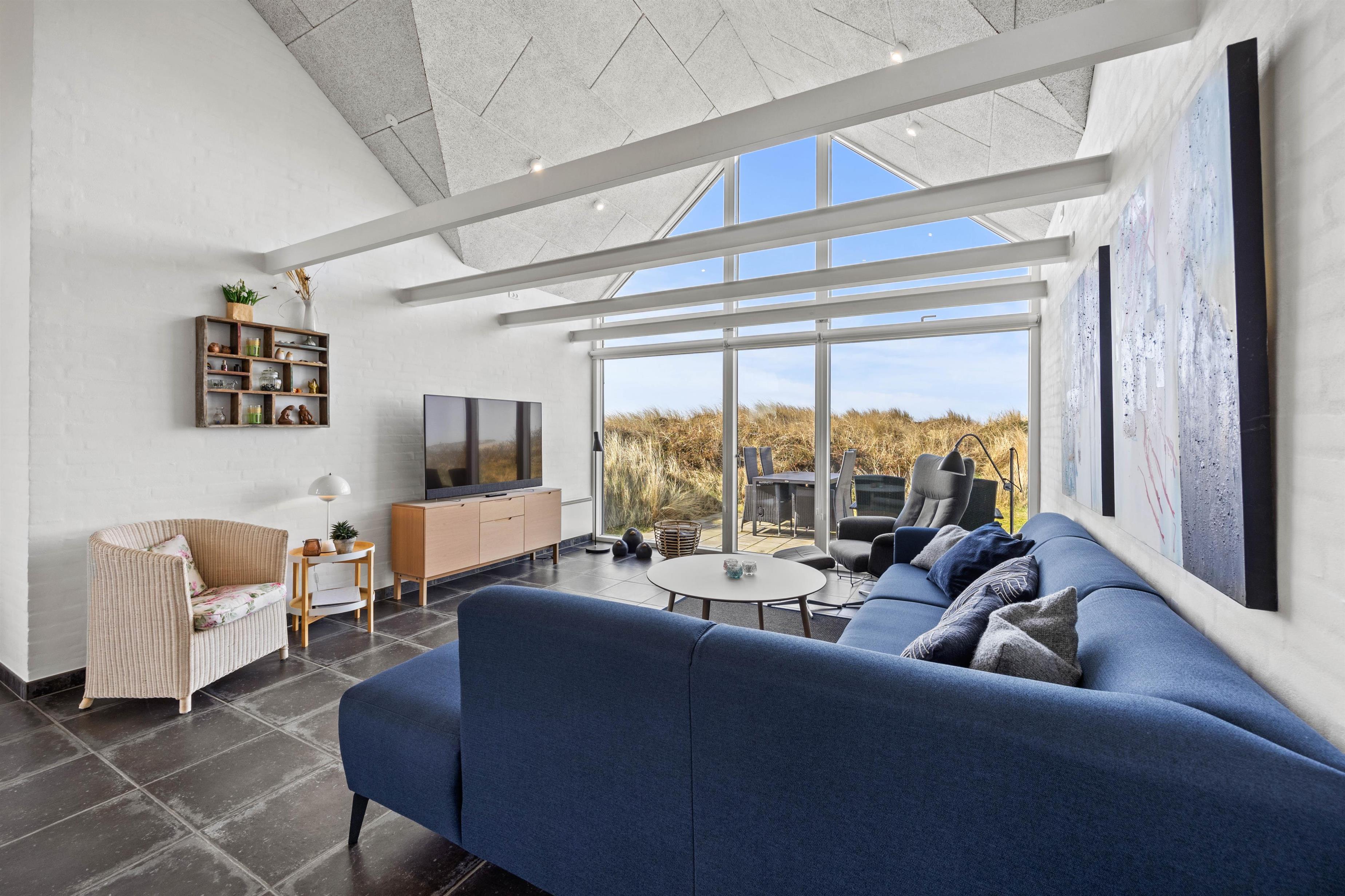 Sommerhuset er lyst og moderne indrettet, og sammen med de store vinduespartier i alrummet giver det en indbydende atmosfære i rummet. Den åbne planløsning giver jer mere tid sammen som familie, da I kan fortsætte snakken og hyggen, selvom nogle står for madlavningen, og andre slapper af på sofaen. Fra stuen har I en fantastisk udsigt udover de smukke klitter. For at fuldende den hyggelige sommerhusstemning kan I med fordel tænde op i den knitrende brændeovn, som skaber varme og glæde. Desuden er her også en energibesparende varmepumpe, der sørger for et godt og behageligt indeklima.