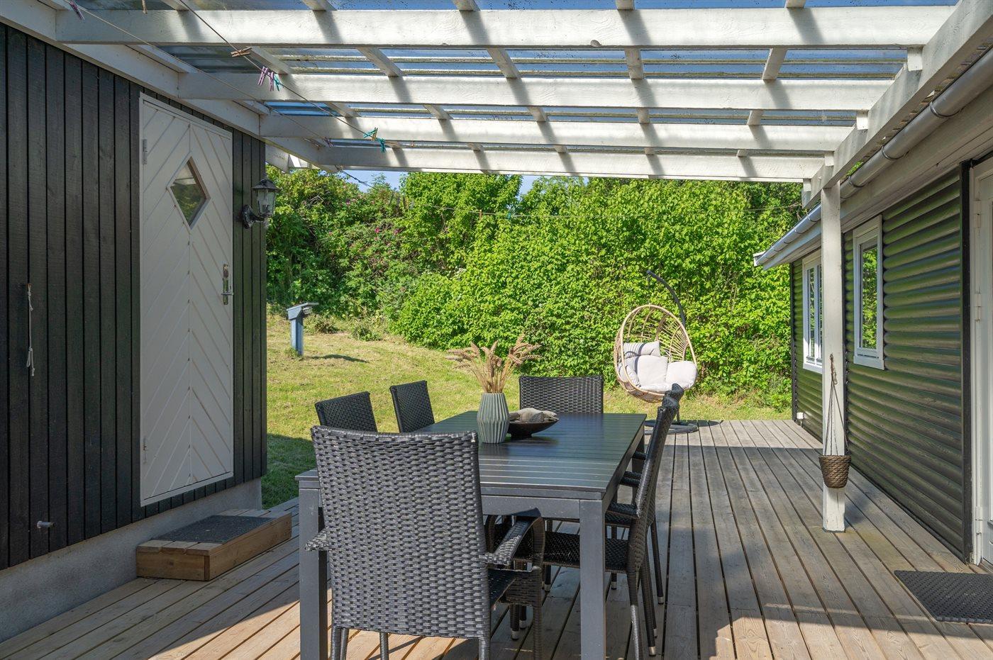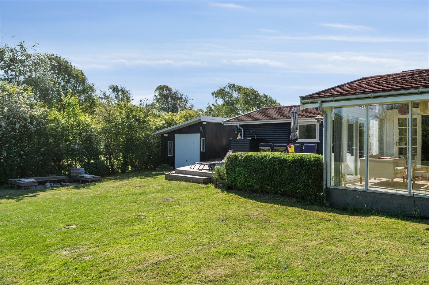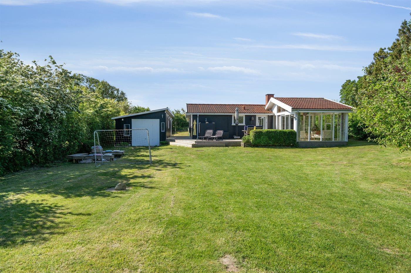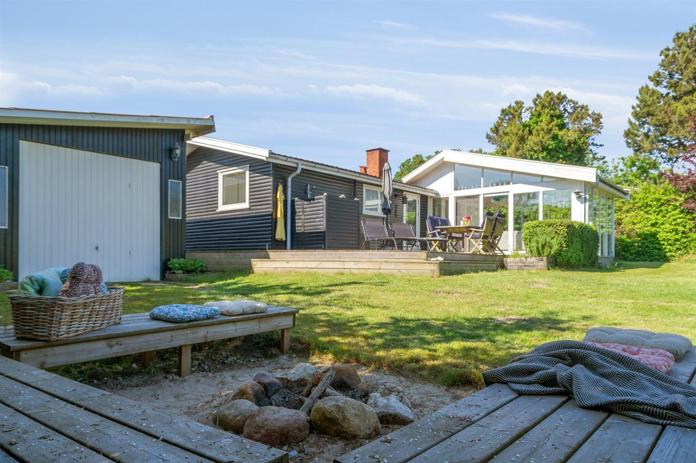 Flot, lyst og moderniseret sommerhus kun 75 m fra dejlig badestrand. Huset er nydeligt indrettet og har bl.a. en skøn udestue, hvorfra der er udsigt over haven. Både foran og bagved huset er der anlagt træterrasse. Den sydvendte terrasse ligger bag huset i god læ bag skrænt og er delvist overdækket. Huset ligger på en stor grund, hvor der er god plads til udendørs aktiviteter.