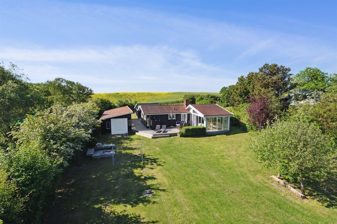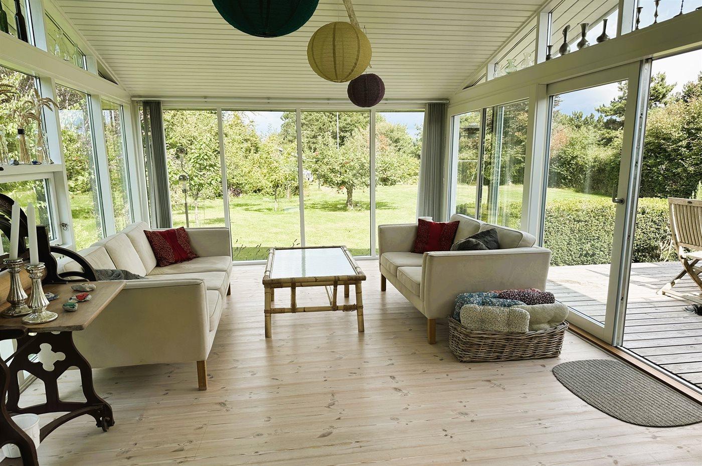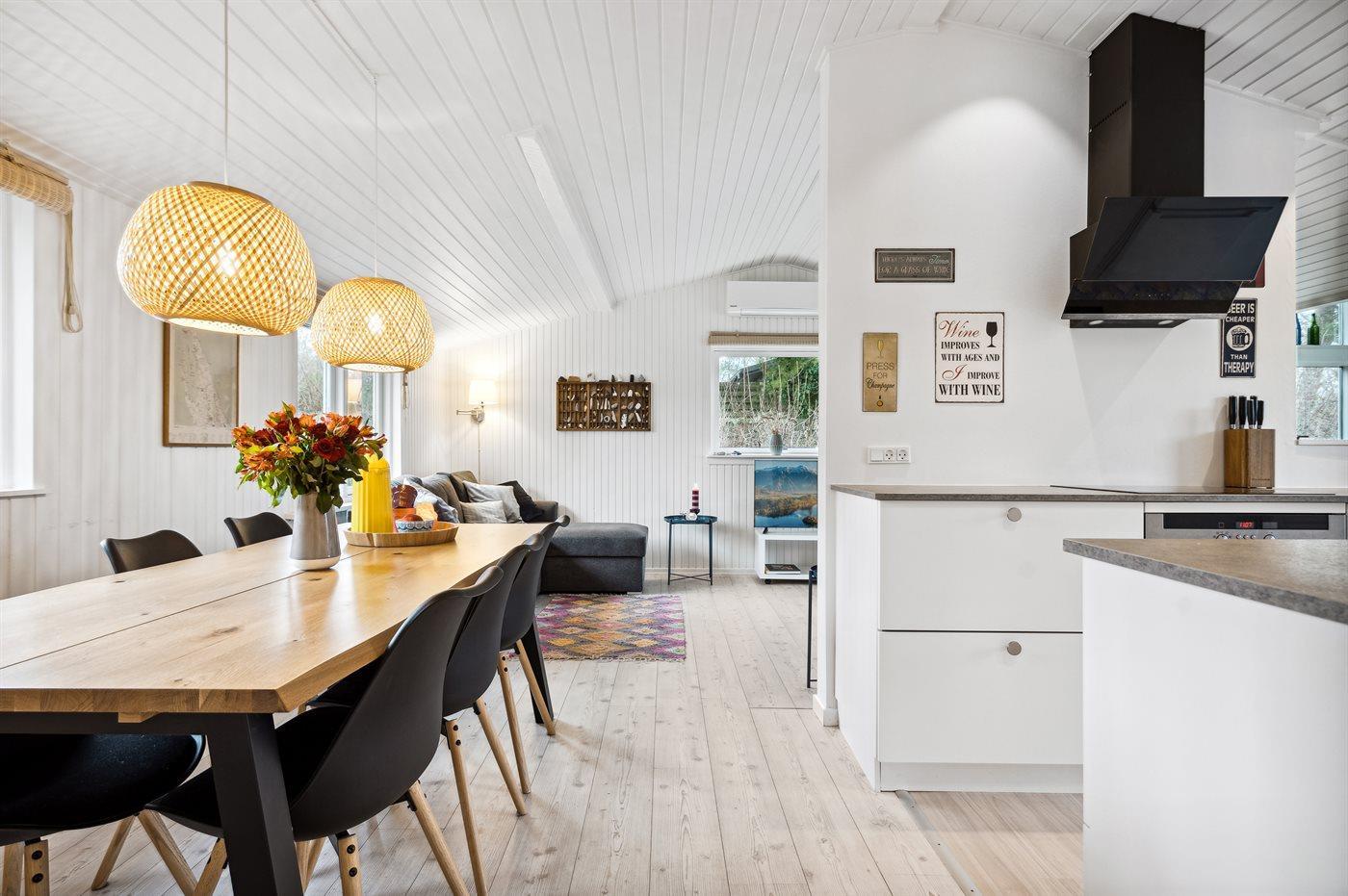 Flot, lyst og moderniseret sommerhus kun 75 m fra dejlig badestrand. Huset er nydeligt indrettet og har bl.a. en skøn udestue, hvorfra der er udsigt over haven. Både foran og bagved huset er der anlagt træterrasse. Den sydvendte terrasse ligger bag huset i god læ bag skrænt og er delvist overdækket. Huset ligger på en stor grund, hvor der er god plads til udendørs aktiviteter.