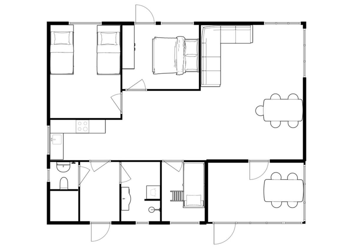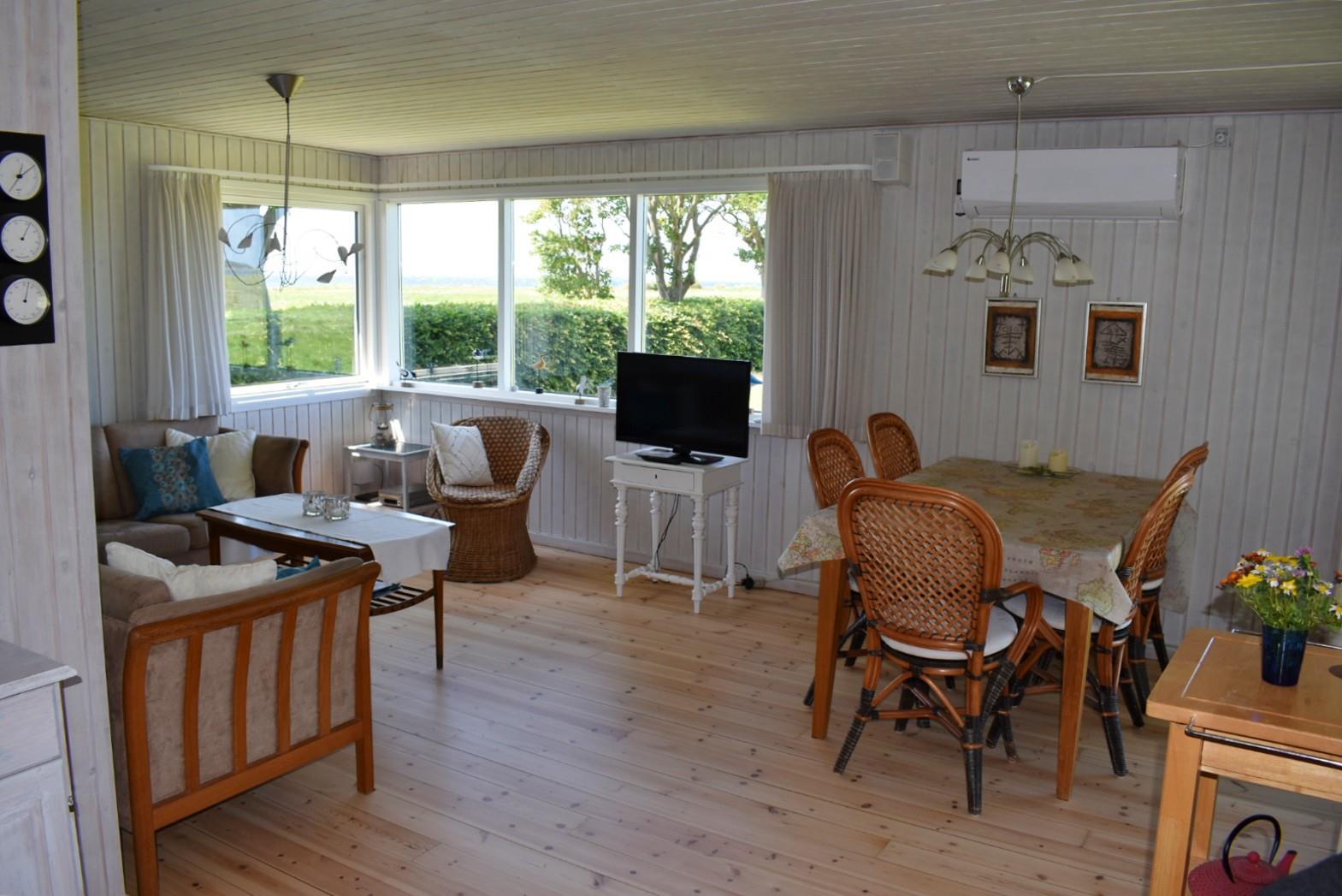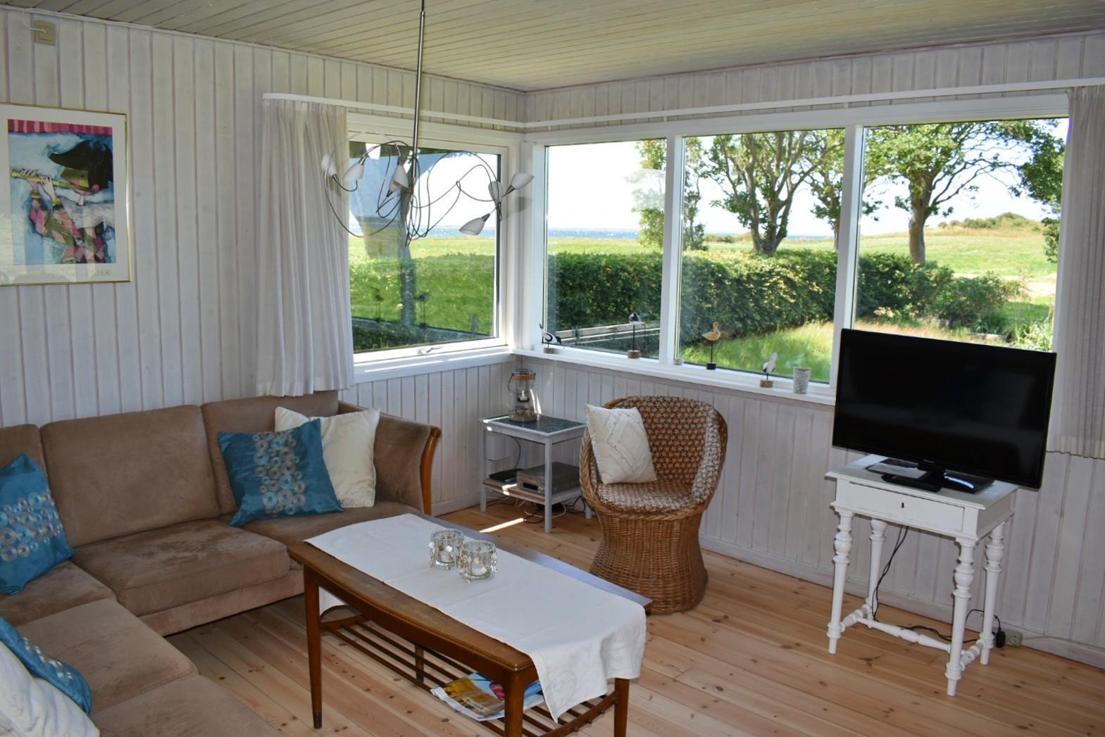 Huset er ældre, men hyggeligt og funktionelt. Her er tre soveværelser med i alt 6 sovepladser: én dobbeltseng, 2 enkeltsenge og 2 køjer. Et stort badeværelse med vaskemaskine og tørretumbler, seperat toilet samt en lys stue med panoramaudsigt og udgang til både udestue og stor træterrasse, hvor udelivet rigtig kan nydes. Herfra har du frit udsyn over en smuk, uspoleret mark og fjorden mellem Langø og Fyns Hoved. Køkkenet er nyt fra 2024 og fuldt udstyret. Der er ikke TV-pakke, men mulighed for at streame via chromecast.