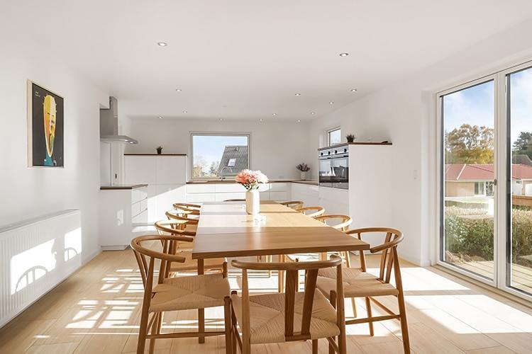 Dette, skønne, store feriehus på hele 180 m2 har havudsigt og god plads til 12 personer. Lækkert, hvidt køkken med opvaskemaskine og mikrobølgeovn.