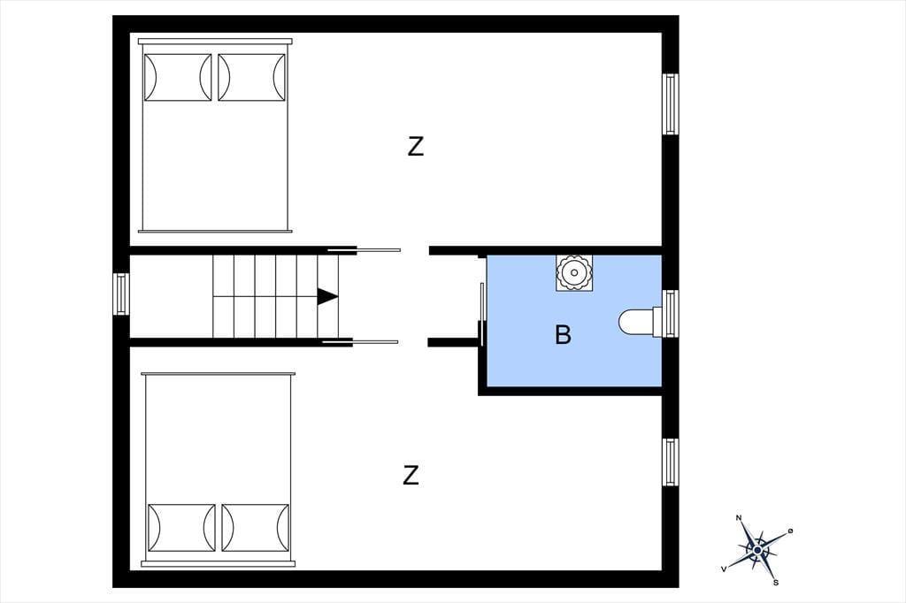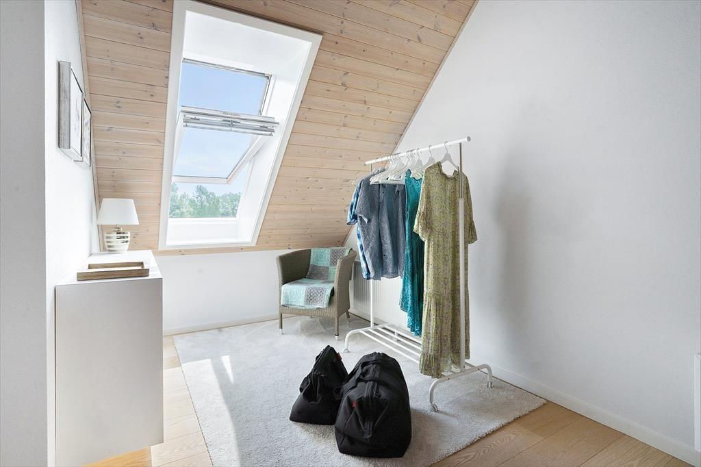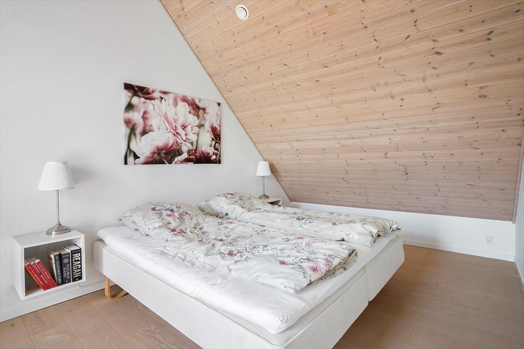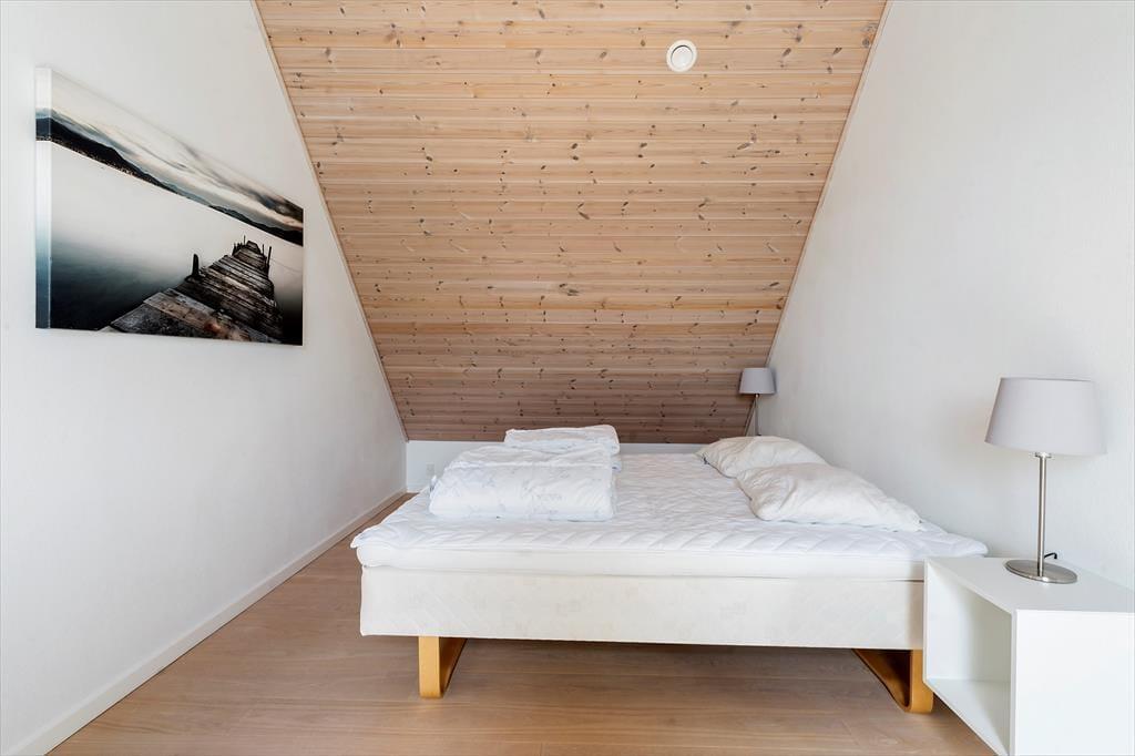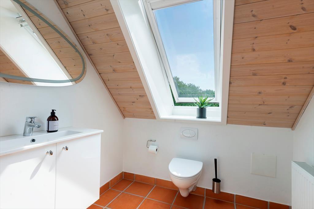 Centralt i huset er en flot trappe op til 1. sal, hvor man finder to gode soveværelser og endnu et toilet. Soveværelserne er hyggelige med skrævægge og trægulve, men de er også lyst indrettet med komfortable senge og opbevaringsplads. I det ene værelse er to enkeltsenge, mens det andet værelse har en god dobbeltseng. Toilettet lige ved siden af soveværelserne er mindre, men giver ekstra komfort, når man er op til 4 personer i ferielejligheden.