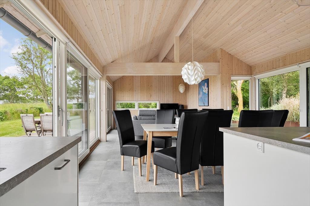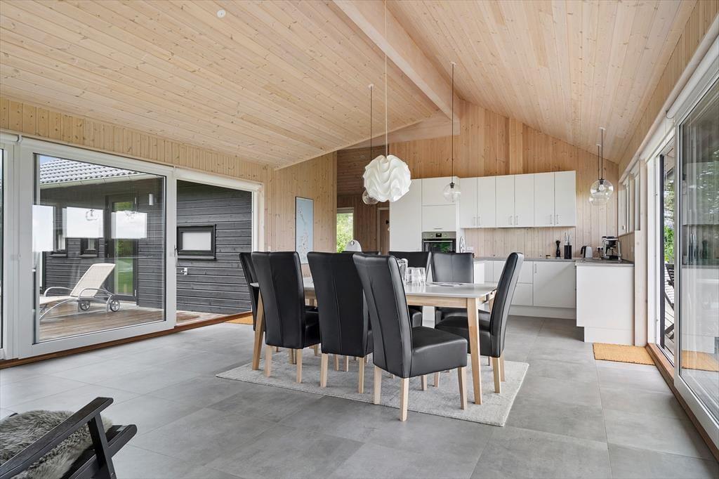 Stuen og køkkenet udgør husets samlingspunkt. Det åbne køkken gør det muligt at tilberede aftensmaden, mens du stadig kan snakke med dem, der hygger sig i stuen. Køkkenet er funktionelt og veludstyret med alle nødvendige faciliteter – og selvfølgelig udsigt til havet. Spisebordet er i forlængelse af køkkenet, og her er der plads til at spise sammen eller nyde et hyggeligt spil.