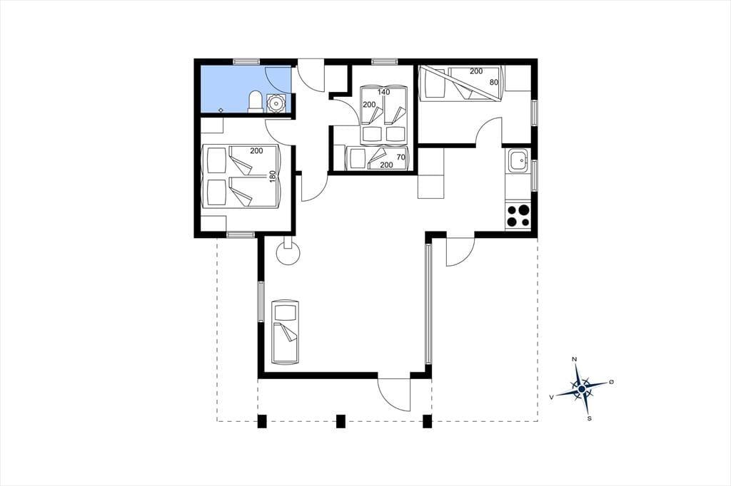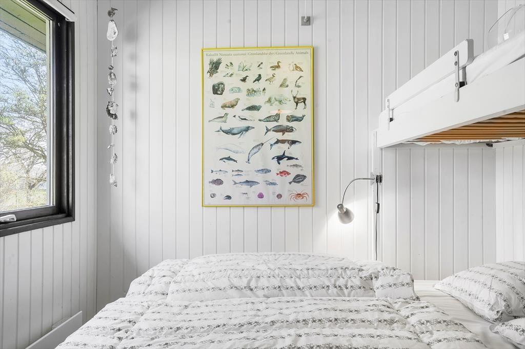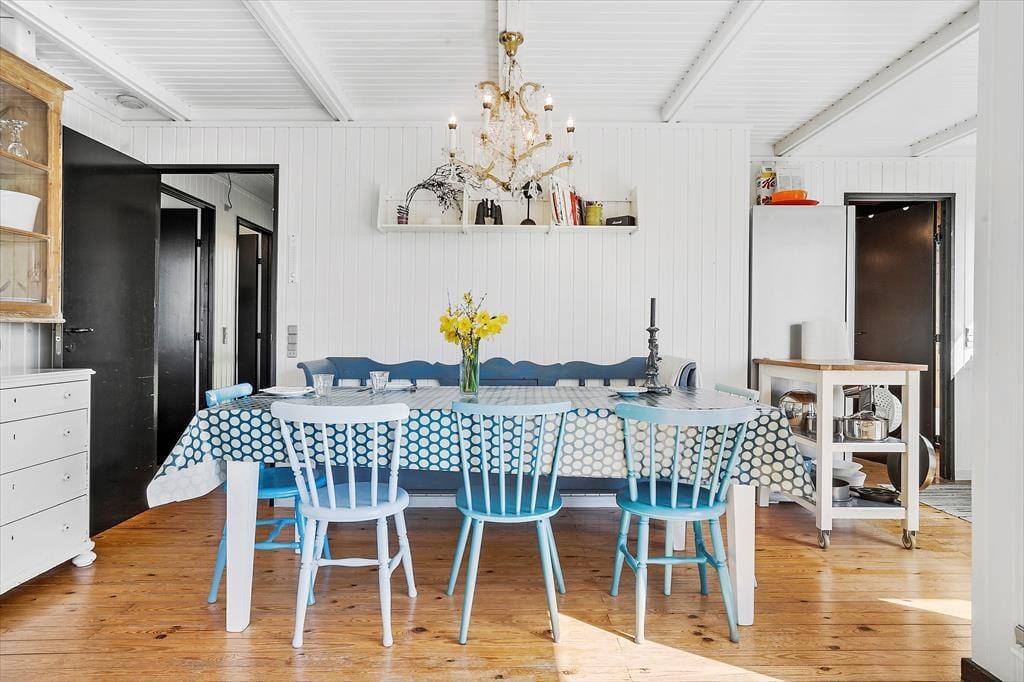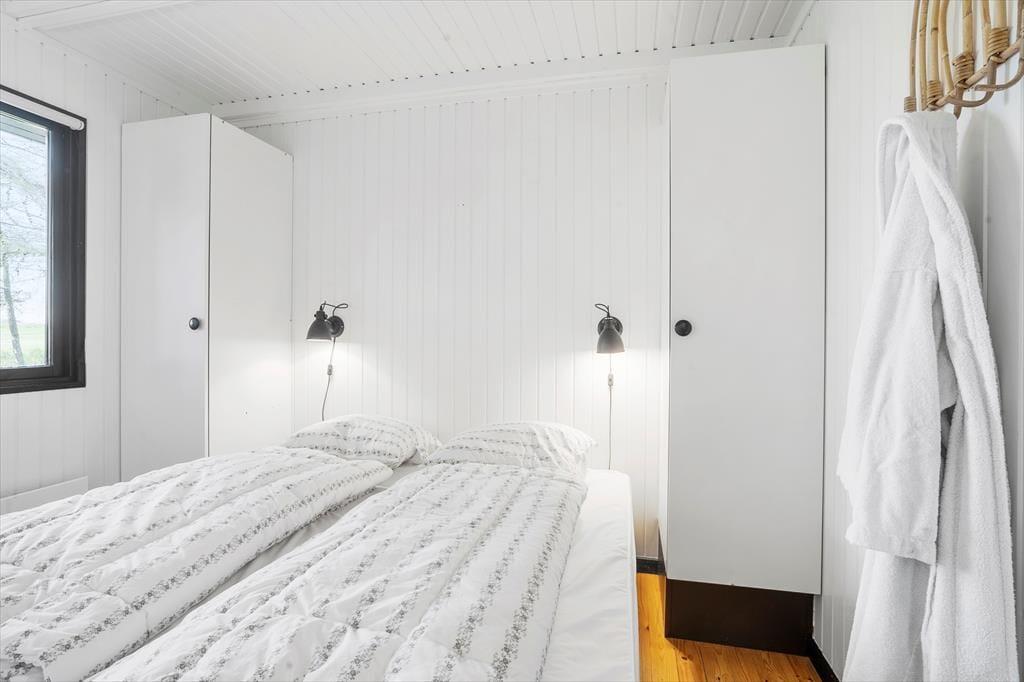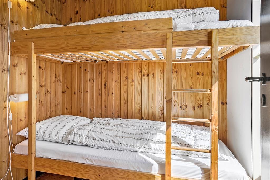Huset har tre værelser der er fordelt med to soveværelser med dobbeltseng samt et værelse med køjesenge., så der er plads til både børn og voksne.