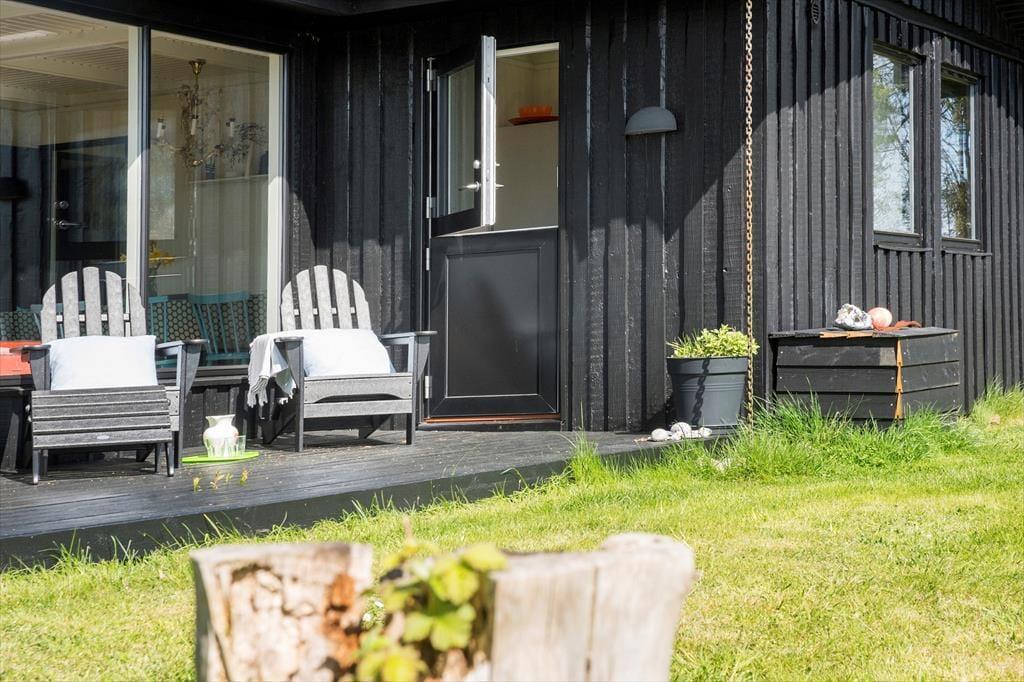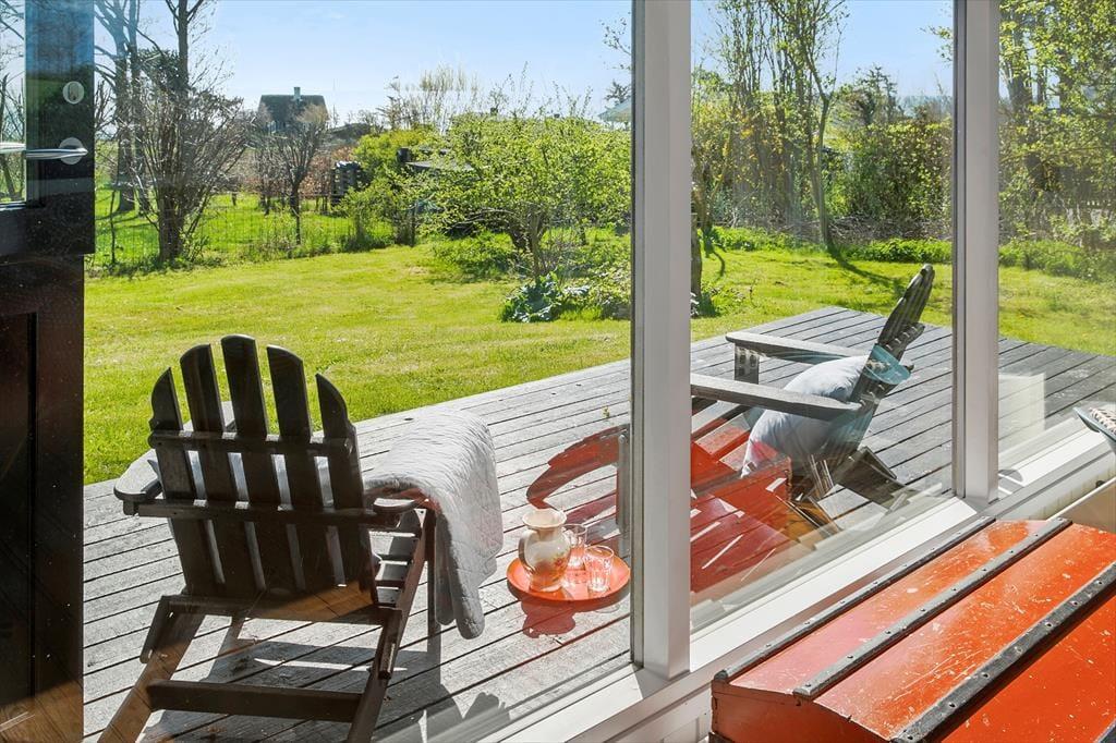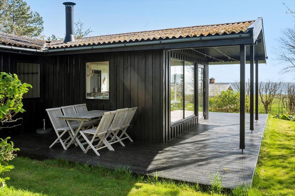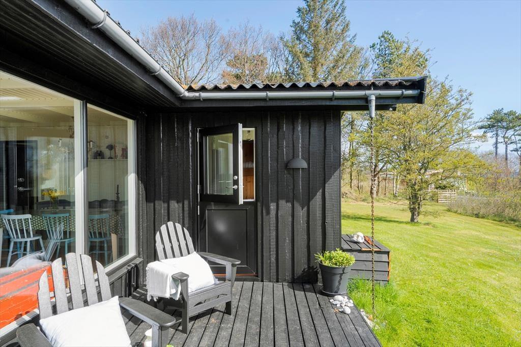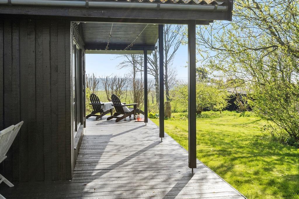 Med direkte udgang fra husets stue er den store træterrasse perfekt til at nyde solen eller dagens måltider på, som du bl.a. kan tilberede på grillen. Her kan man sidde i havemøblerne helt uforstyrret, og finde både skygge og læ på den delvist overdækkede terrasse hvor man kan skimte havet.