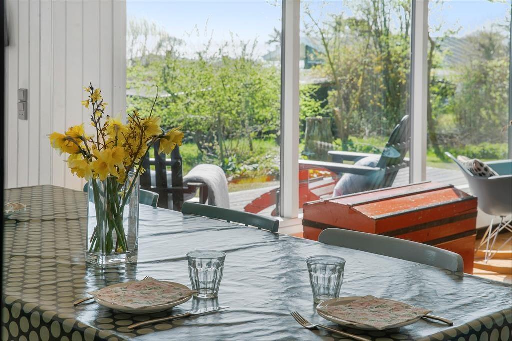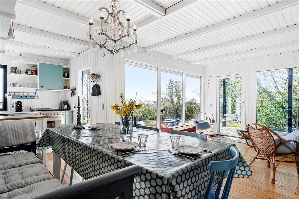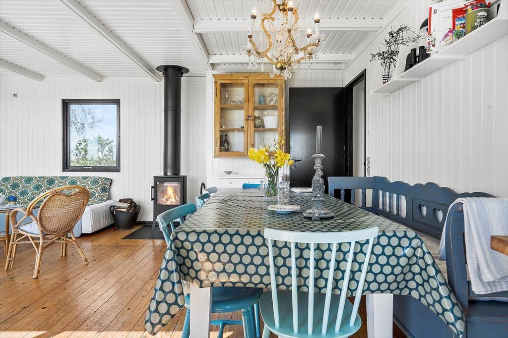 Sommerhusets brændeovn er centralt placeret i stuen, der er husets omdrejningspunkt. Stuen er oplagt til at afslapning med spil, læse en god bog eller tænde op i brændeovnen. Huset har også gratis WiFi. I direkte forlængelse med stuen og køkkenet er husets spisebord, hvor der er plads til 6 personer. Huset er småt men hyggeligt, og her er du sikret autentisk sommerhus stemning.