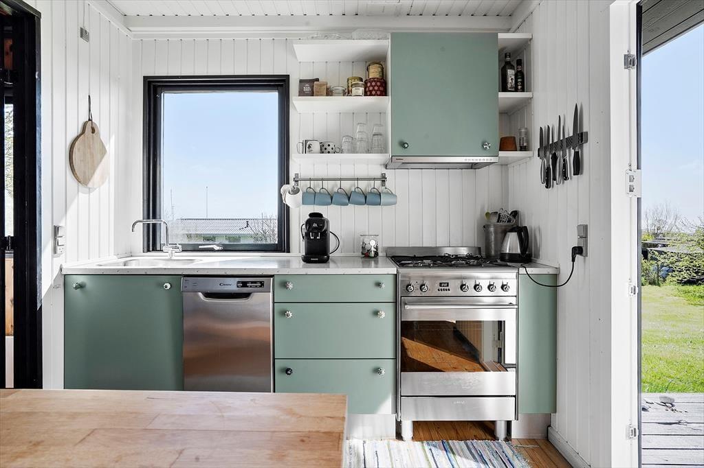 Køkkenet er fuldt funktionelt og har alt det, du har brug for på din ferie, når du skal tilberede dagens måltider. Her er både fryser, mikroovn og kaffemaskine samt opvaskemaskine.