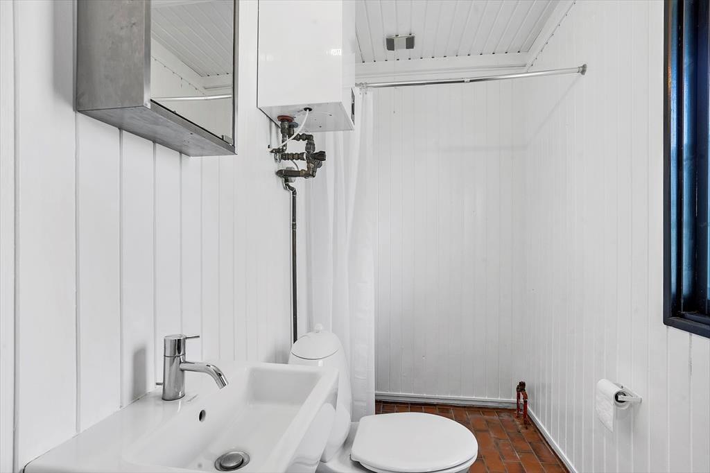 Ved siden af det store soveværelse er husets badeværelse, der ikke er stort, men har de faciliteter, der er brug for i sommerhuset.