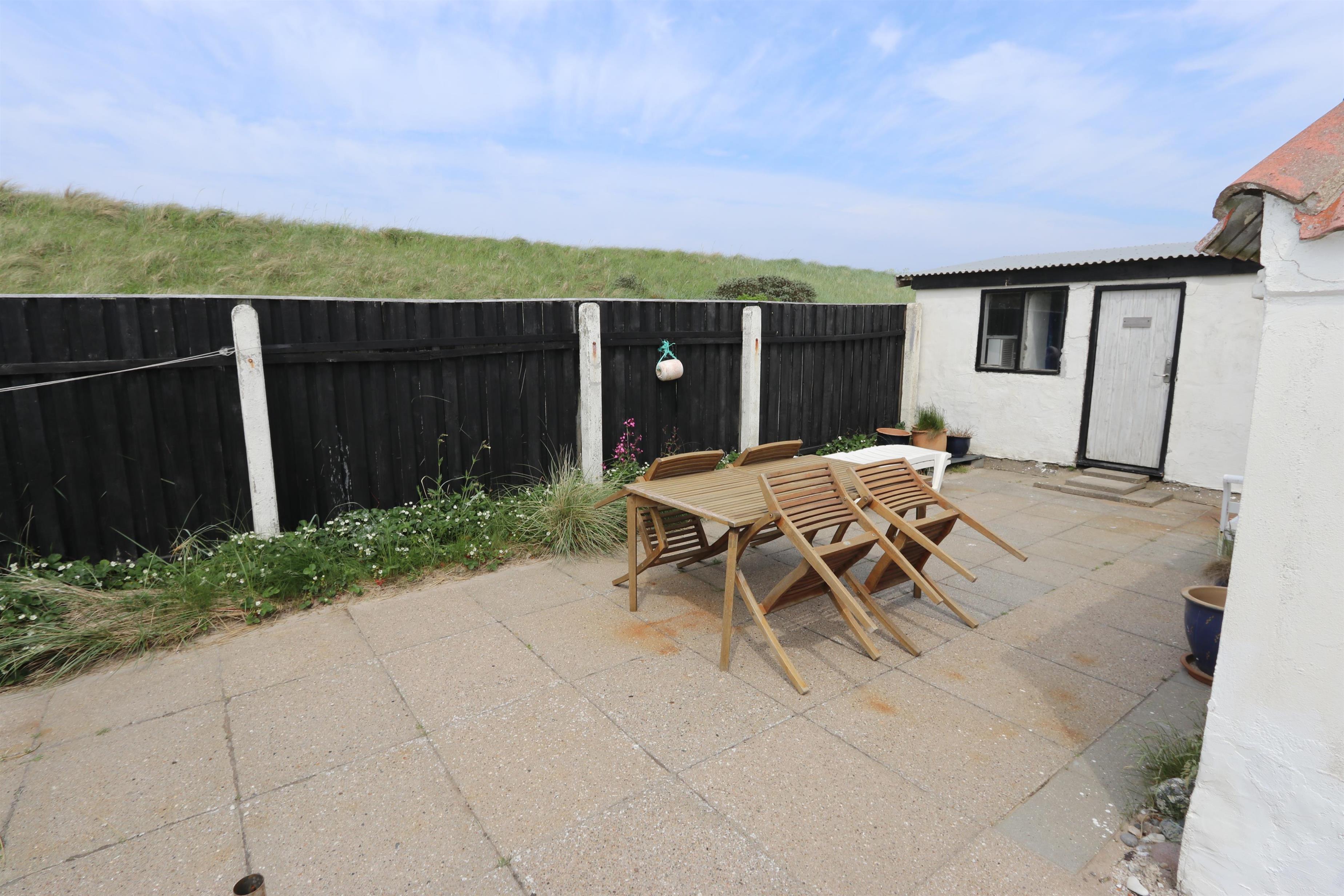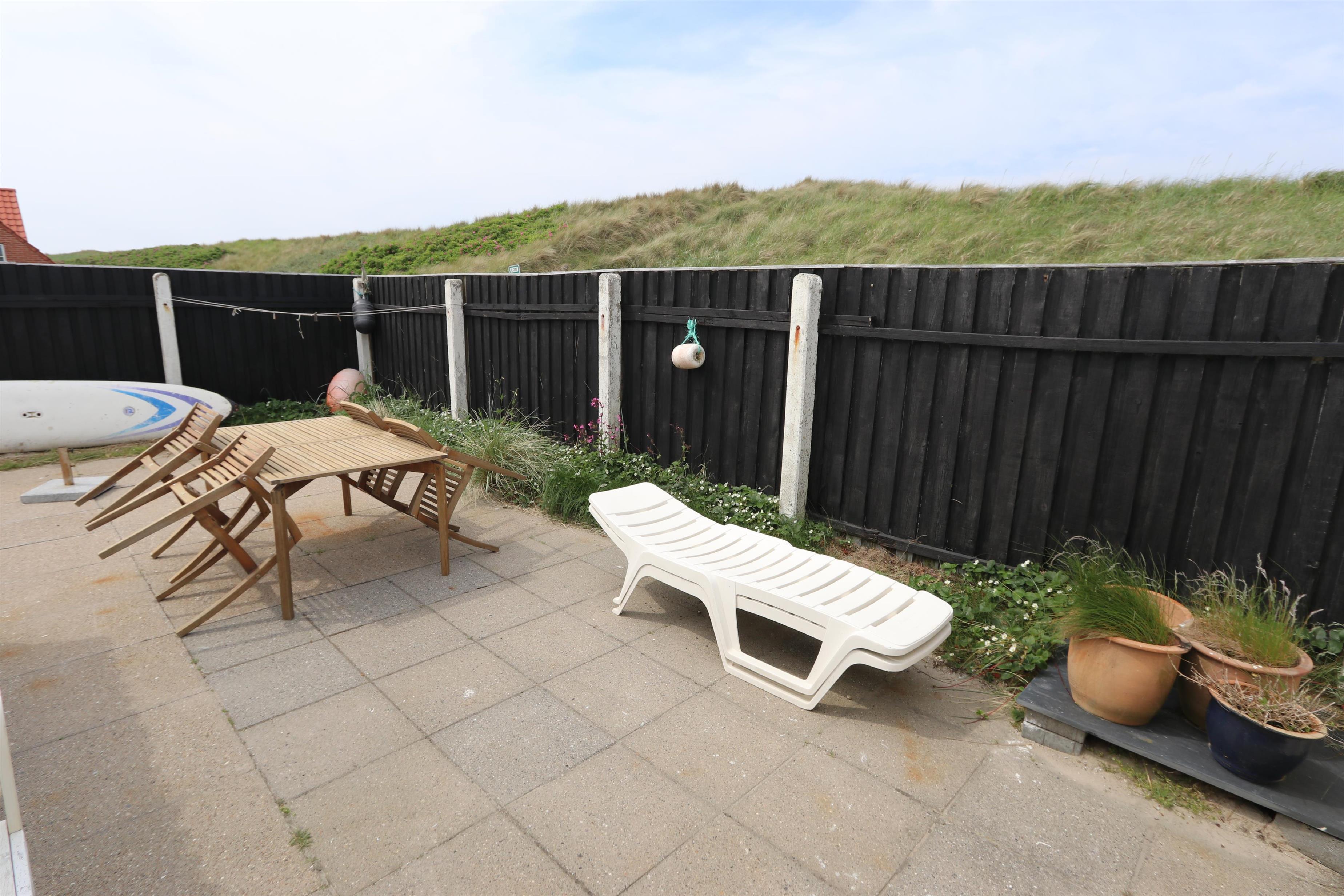 Fra køkkenet er der udgang til en stor, indhegnet terrasse med havemøbler og grill. Huset ligger på en ca. 987 m2 stor klitgrund kun 50 fra Vesterhavet. Nyd en ferie tæt ved Vesterhavet i en charmerende Klitgård med en helt unik beliggenhed. Parker bilen og nyd at I resten af ferien kan gå til stranden på under 5 minutter.
