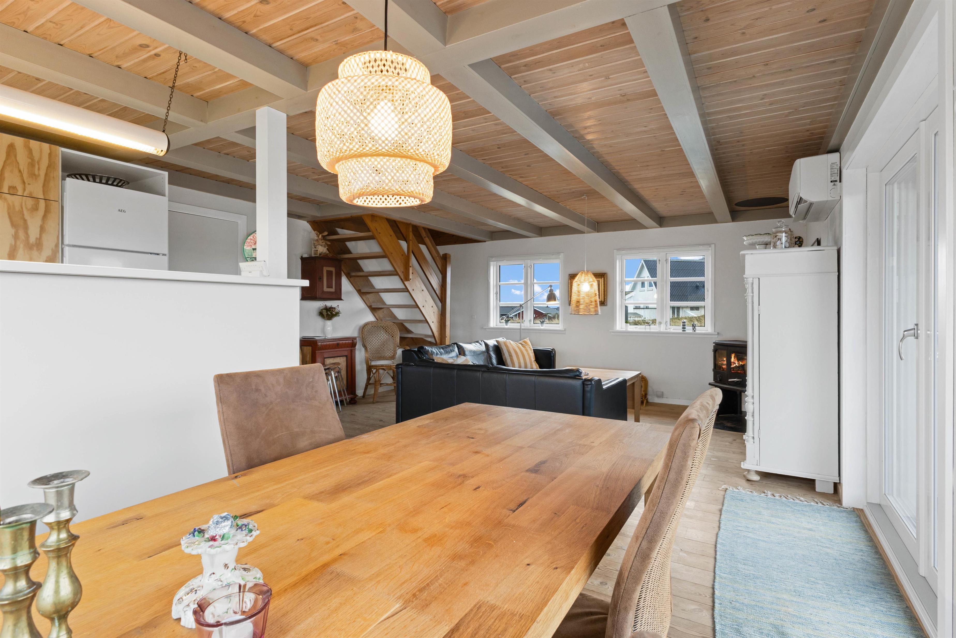 Huset ligger kun et stenkast fra klitterne og man kan nyde naturen direkte fra den afskærmede terrasse. Her er både grill og havemøbler til at benytte i mange glade ferietimer. Man kan gå direkte over til stranden som byder på badning, drageflyvning, lystfiskeri eller blot lange gåture. Der er cirka 2 kilometer til nærmeste købmand i form af Aldi og Brugsen i Harboøre. Vil man på dagsudflugt anbefaler vi gerne Thyborøn med unik havnemiljø, fiskespisesteder på havnen, en dejlig børnevenlig badestrand samt flere attraktioner såsom Sneglehuset, Sea War Museum eller Jyllandsakvariet. Andre udflugtsmål inkluderer Bovbjerg Klint som ligger cirka 10 km syd for sommerhuset, der kendetegnes ved Bovbjerg Fyr og sine unikke skrænter ved Vesterhavet, som er op til 40 meter høje. Tag også gerne til den gamle købstad Lemvig som byder på både gågade og moderne havnemiljø.