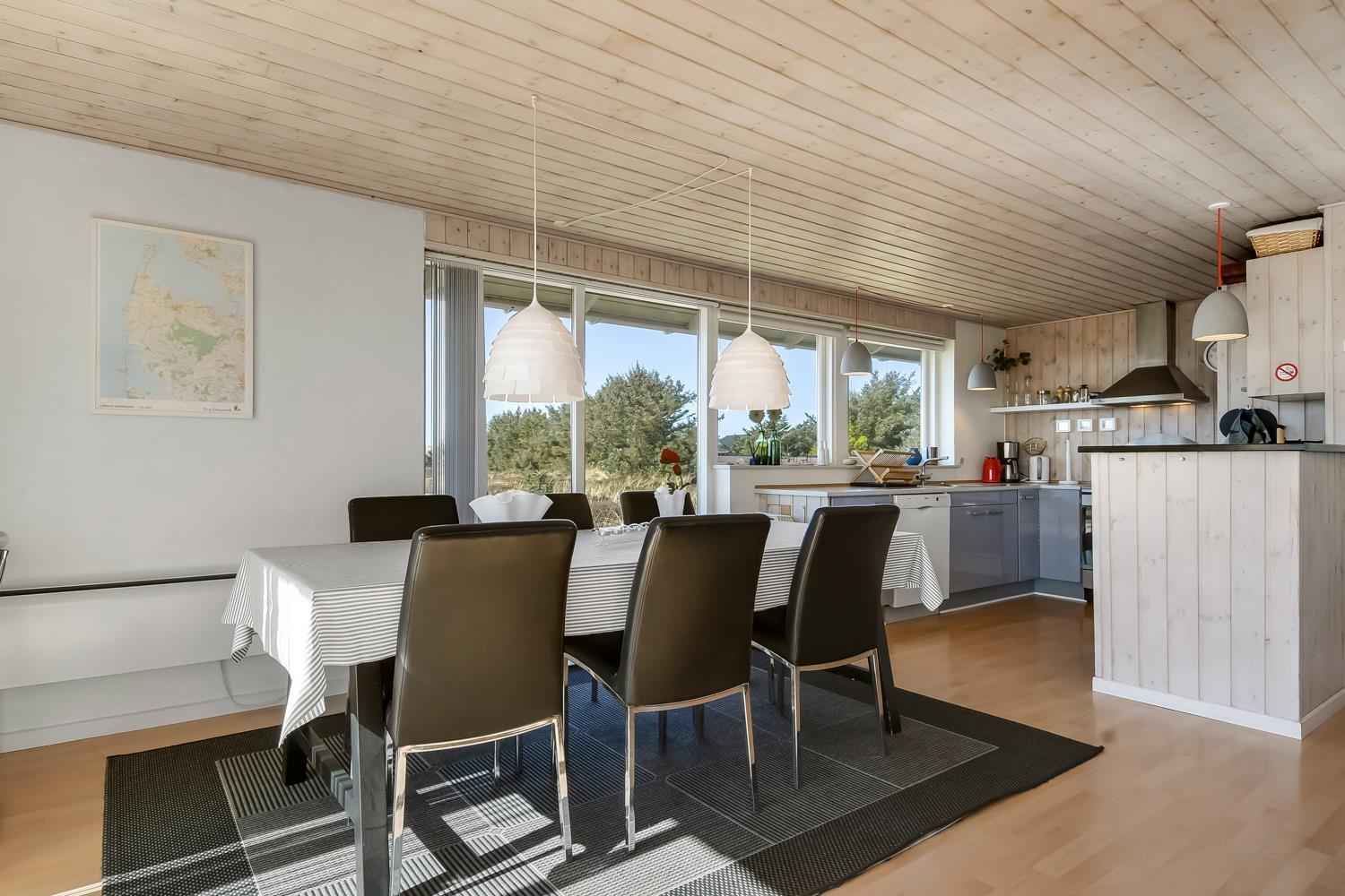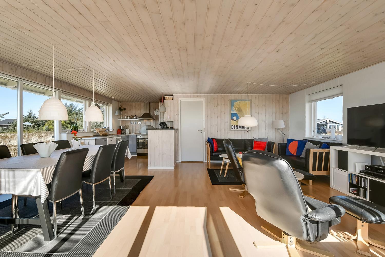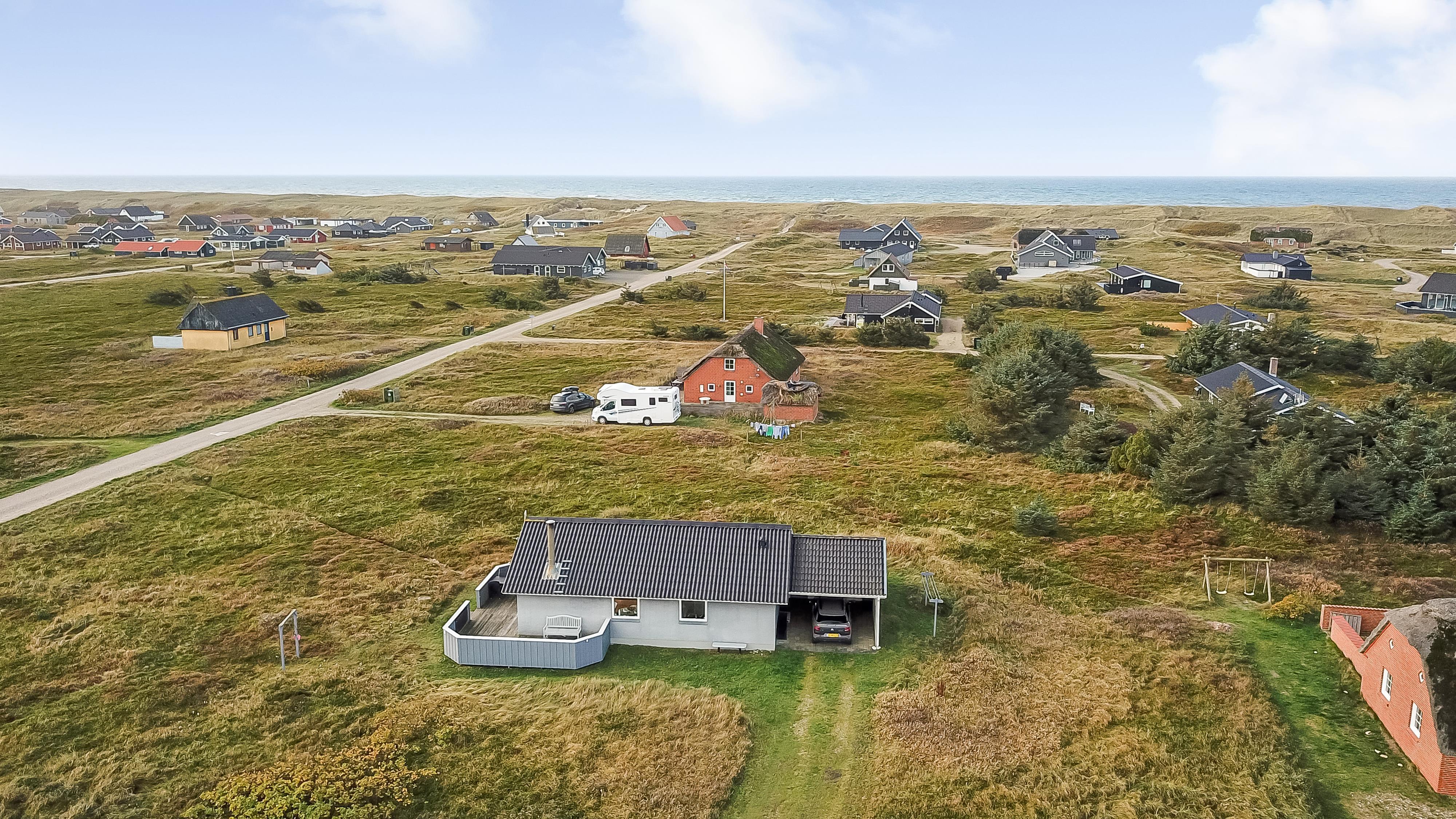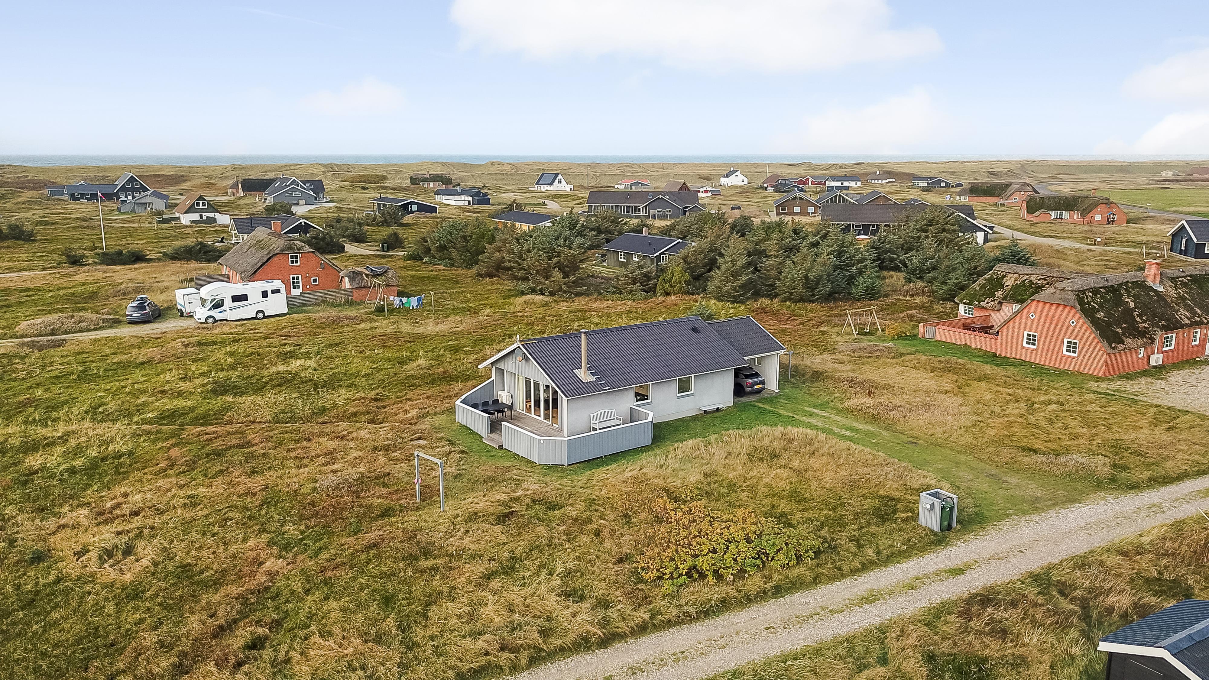 Godt udnyttet feriehus på ca. 75 m2 med kig til de høje klitter ved Vesterhavet. 2 soveværelser (1DS, 2ES+1KS). Huset seneste større renovering var 2006, men huset bliver løbende vedligeholdt og renoveret. Huset er indrettet med lædermøbler, spiseplads, samt-TV med danske og tyske programmer samt mulighed for streaming af TV / radio / Apps. Radio og CD-afspiller. En hyggelig brændeovn samt varmepumpe søger for en billigere el-regning og ekstra hygge samt varme til de rå dage ved Vesterhavet. Praktisk køkkenhjørne med bl.a. opvaskemaskine, komfur med keramiske kogeplade, emhætte, mikroovn samt køleskab med fryseboks. Badeværelse med toilet, håndvask, bruseniche og klinkegulv samt vaskemaskine. Der er praktiske træ gulve i alle opholds- og soverum. Max. 1 husdyr tilladt. Ikke ryger hus.