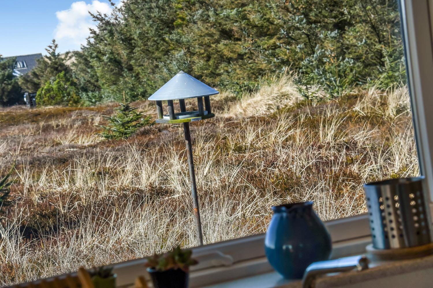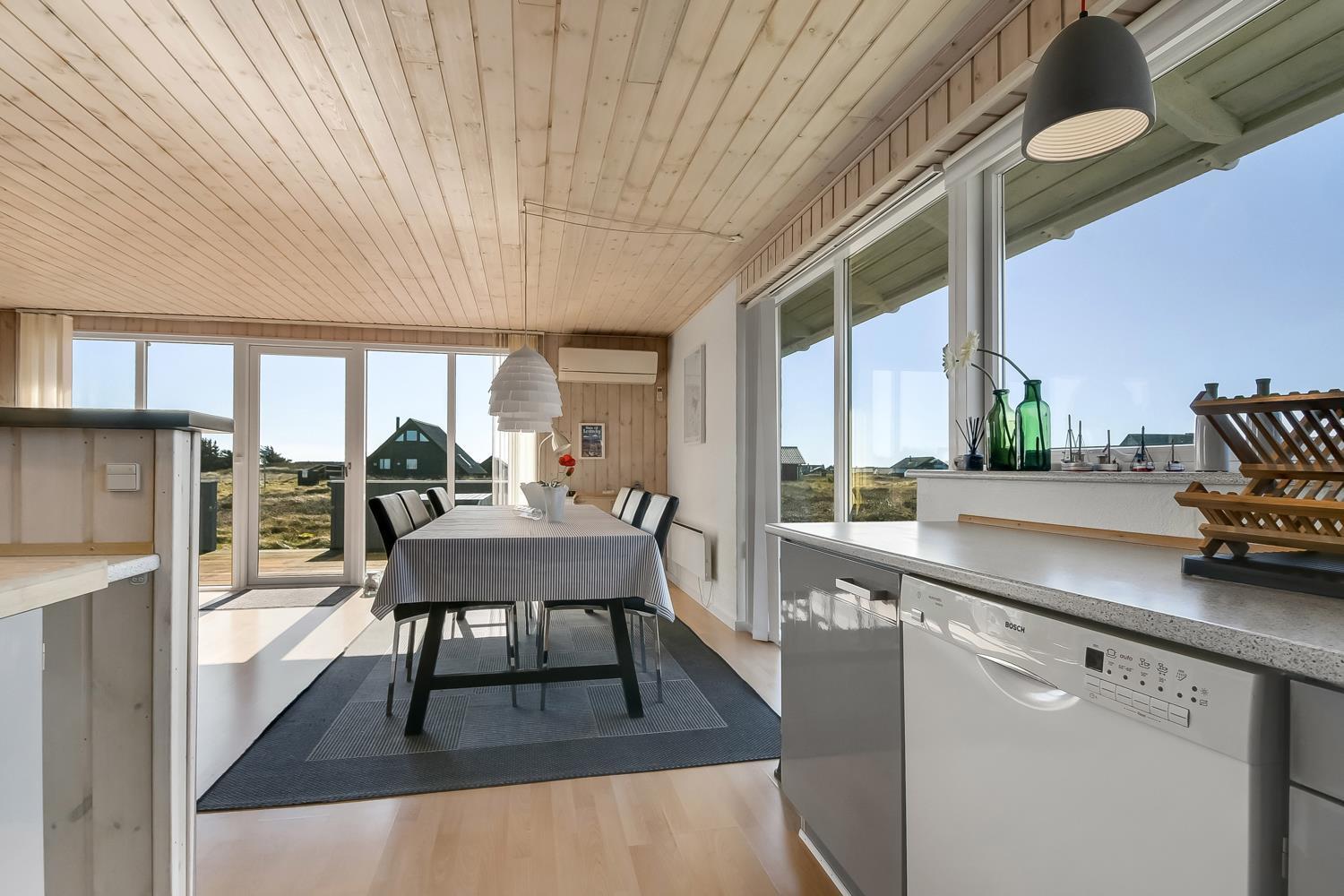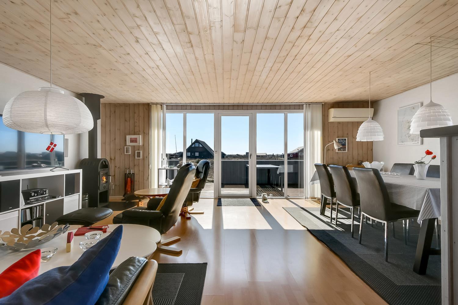 Godt udnyttet feriehus på ca. 75 m2 med kig til de høje klitter ved Vesterhavet. 2 soveværelser (1DS, 2ES+1KS). Huset seneste større renovering var 2006, men huset bliver løbende vedligeholdt og renoveret. Huset er indrettet med lædermøbler, spiseplads, samt-TV med danske og tyske programmer samt mulighed for streaming af TV / radio / Apps. Radio og CD-afspiller. En hyggelig brændeovn samt varmepumpe søger for en billigere el-regning og ekstra hygge samt varme til de rå dage ved Vesterhavet. Praktisk køkkenhjørne med bl.a. opvaskemaskine, komfur med keramiske kogeplade, emhætte, mikroovn samt køleskab med fryseboks. Badeværelse med toilet, håndvask, bruseniche og klinkegulv samt vaskemaskine. Der er praktiske træ gulve i alle opholds- og soverum. Max. 1 husdyr tilladt. Ikke ryger hus.