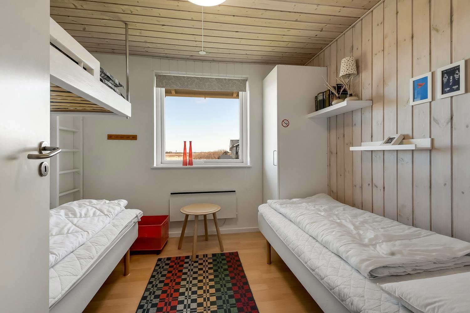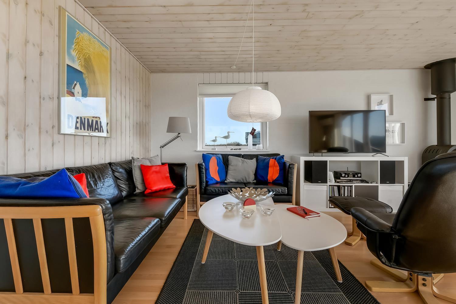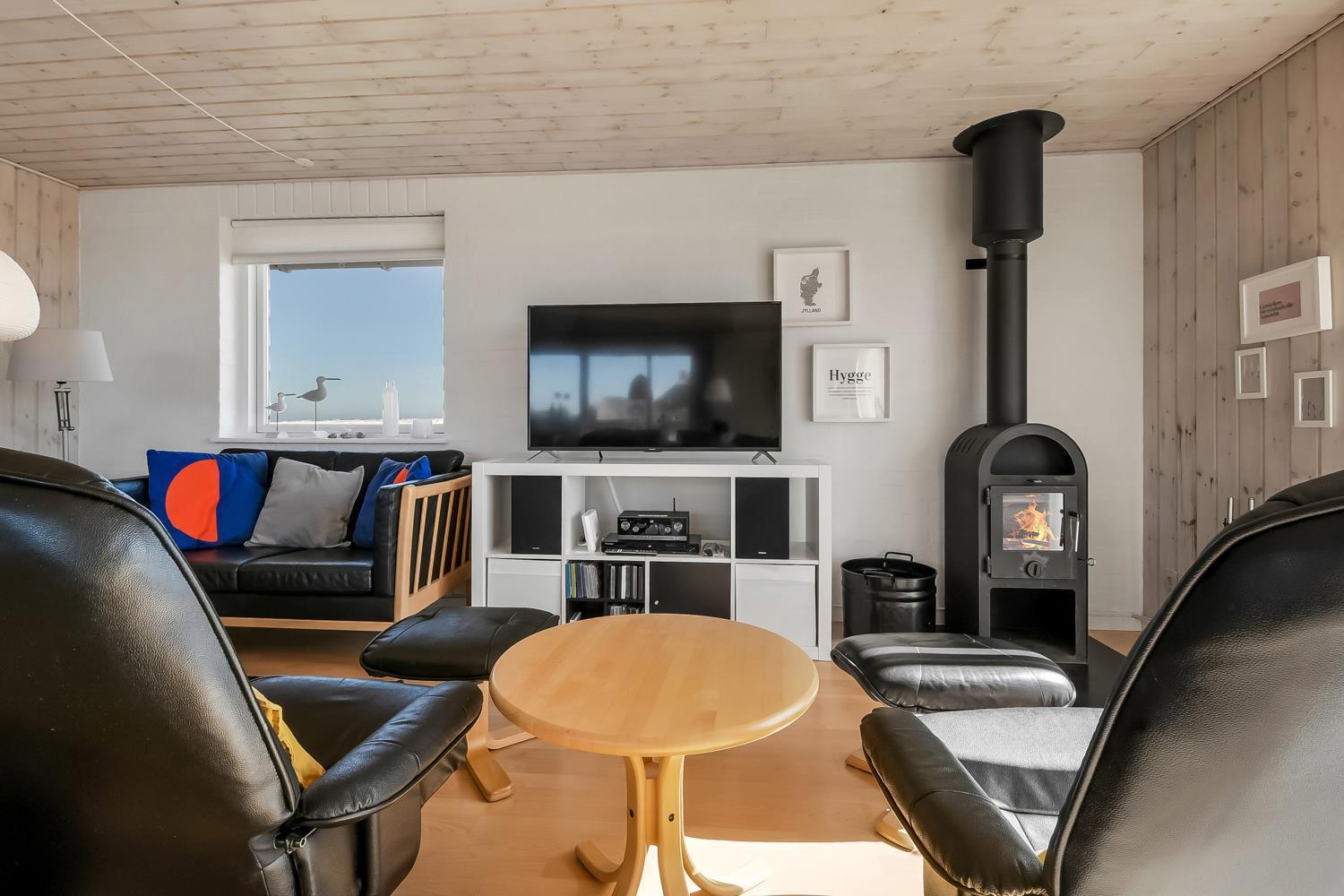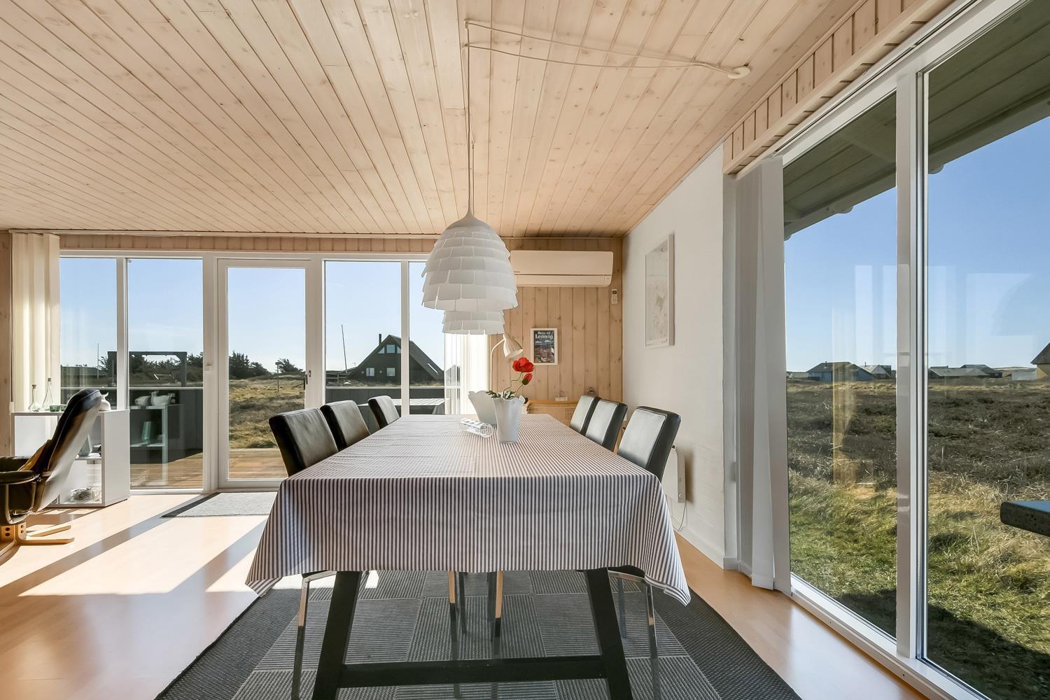 Godt udnyttet feriehus på ca. 75 m2 med kig til de høje klitter ved Vesterhavet. 2 soveværelser (1DS, 2ES+1KS). Huset seneste større renovering var 2006, men huset bliver løbende vedligeholdt og renoveret. Huset er indrettet med lædermøbler, spiseplads, samt-TV med danske og tyske programmer samt mulighed for streaming af TV / radio / Apps. Radio og CD-afspiller. En hyggelig brændeovn samt varmepumpe søger for en billigere el-regning og ekstra hygge samt varme til de rå dage ved Vesterhavet. Praktisk køkkenhjørne med bl.a. opvaskemaskine, komfur med keramiske kogeplade, emhætte, mikroovn samt køleskab med fryseboks. Badeværelse med toilet, håndvask, bruseniche og klinkegulv samt vaskemaskine. Der er praktiske træ gulve i alle opholds- og soverum. Max. 1 husdyr tilladt. Ikke ryger hus.