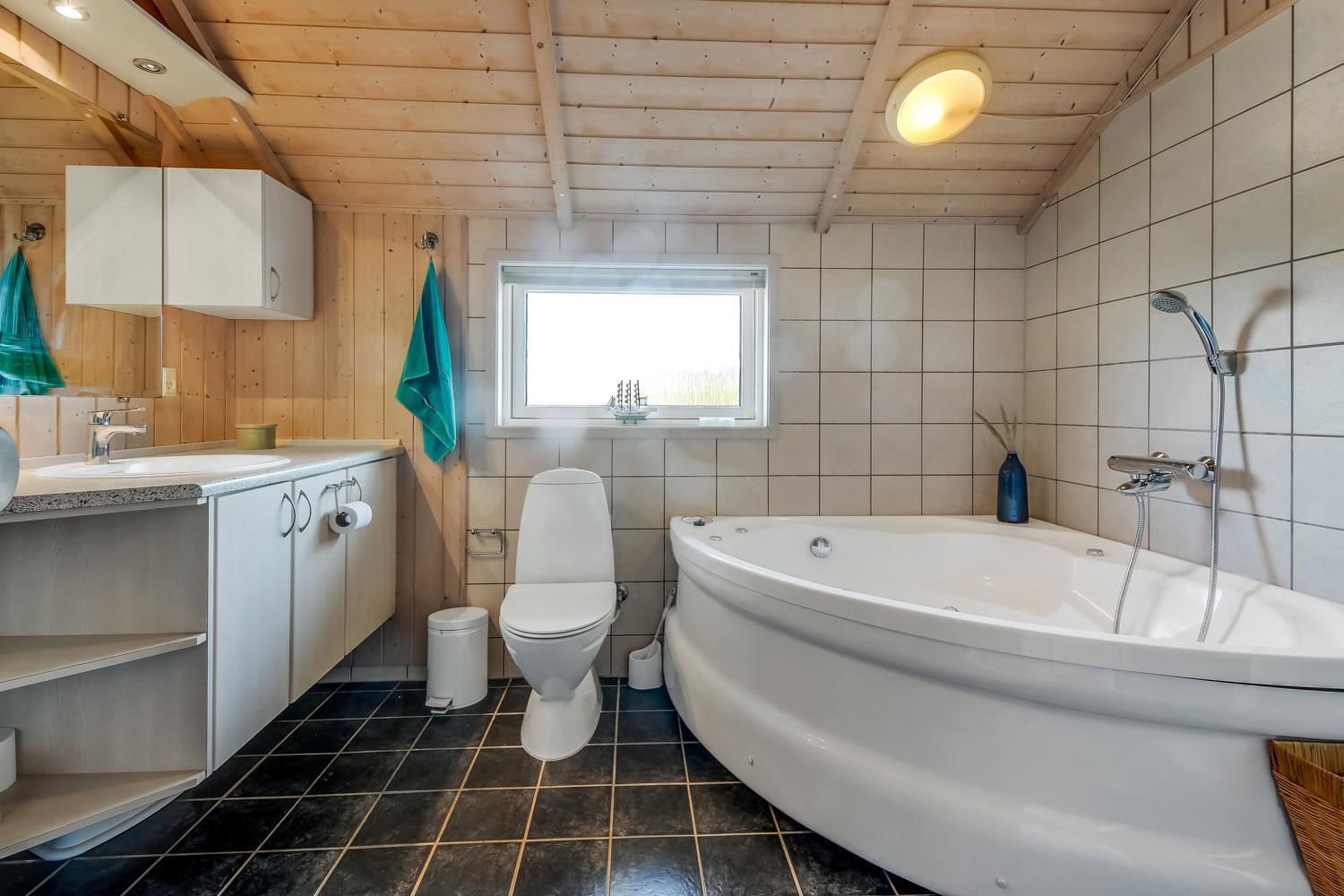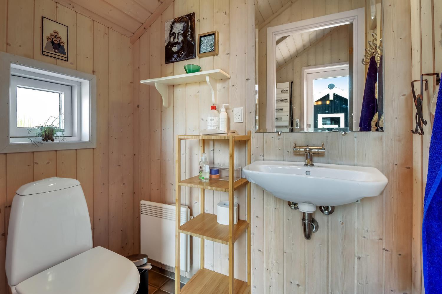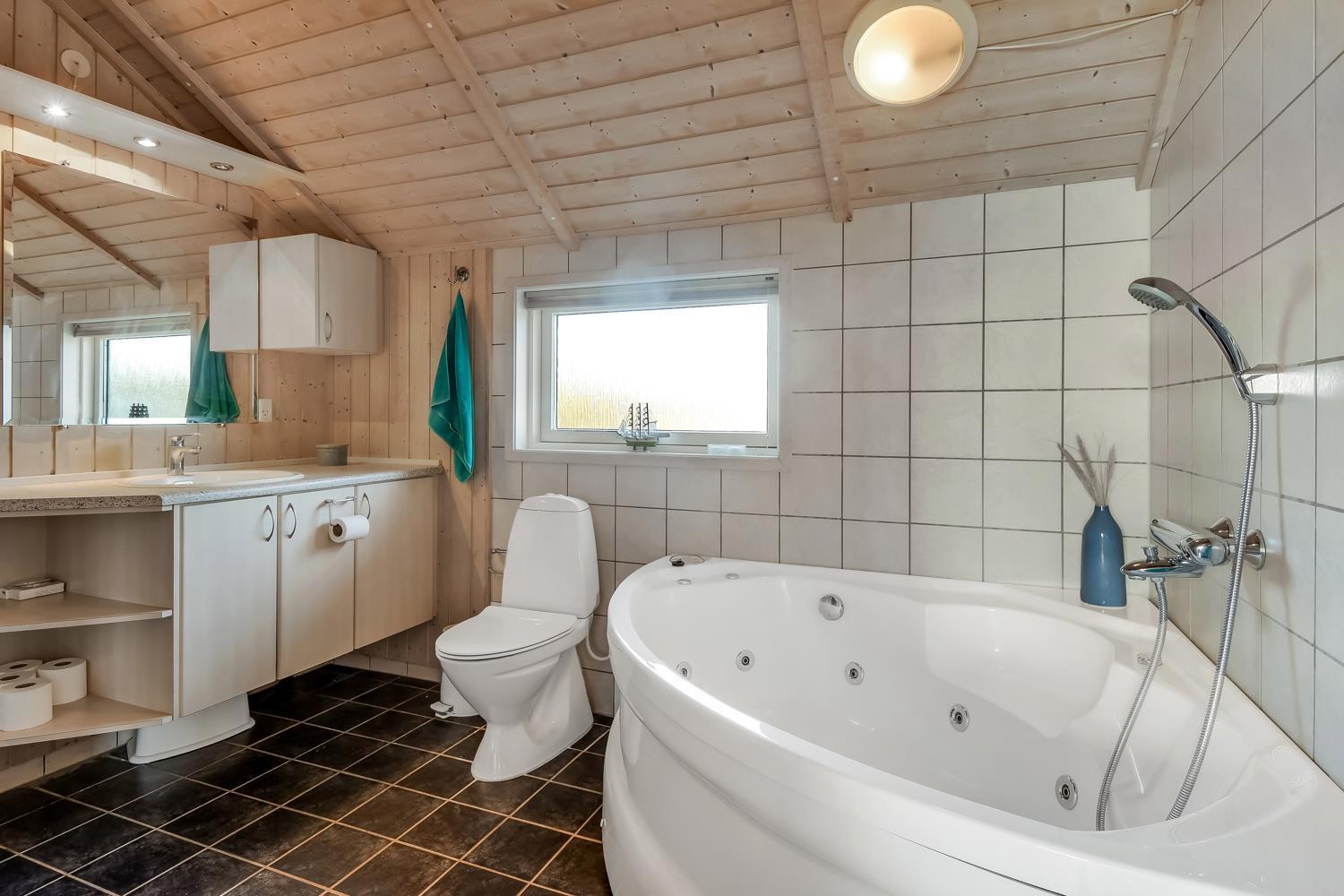 Der er to moderne badeværelser i huset, begge med toilet og håndvask, hvoraf det ene badeværelse er udstyret med et luksuriøst spabad og direkte adgang til en sauna – en perfekt kombination til afslapning efter en lang dag ved stranden eller i naturen.