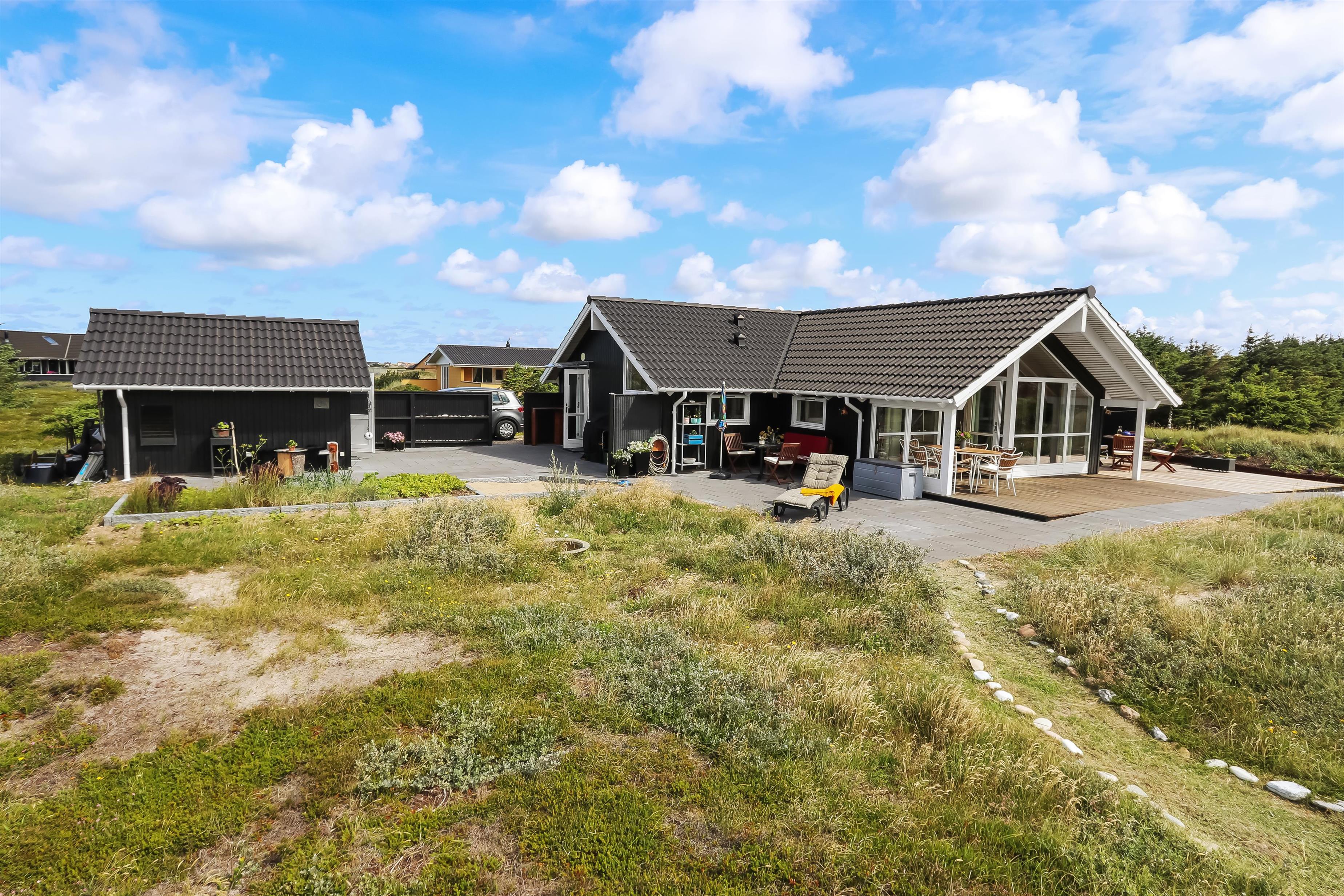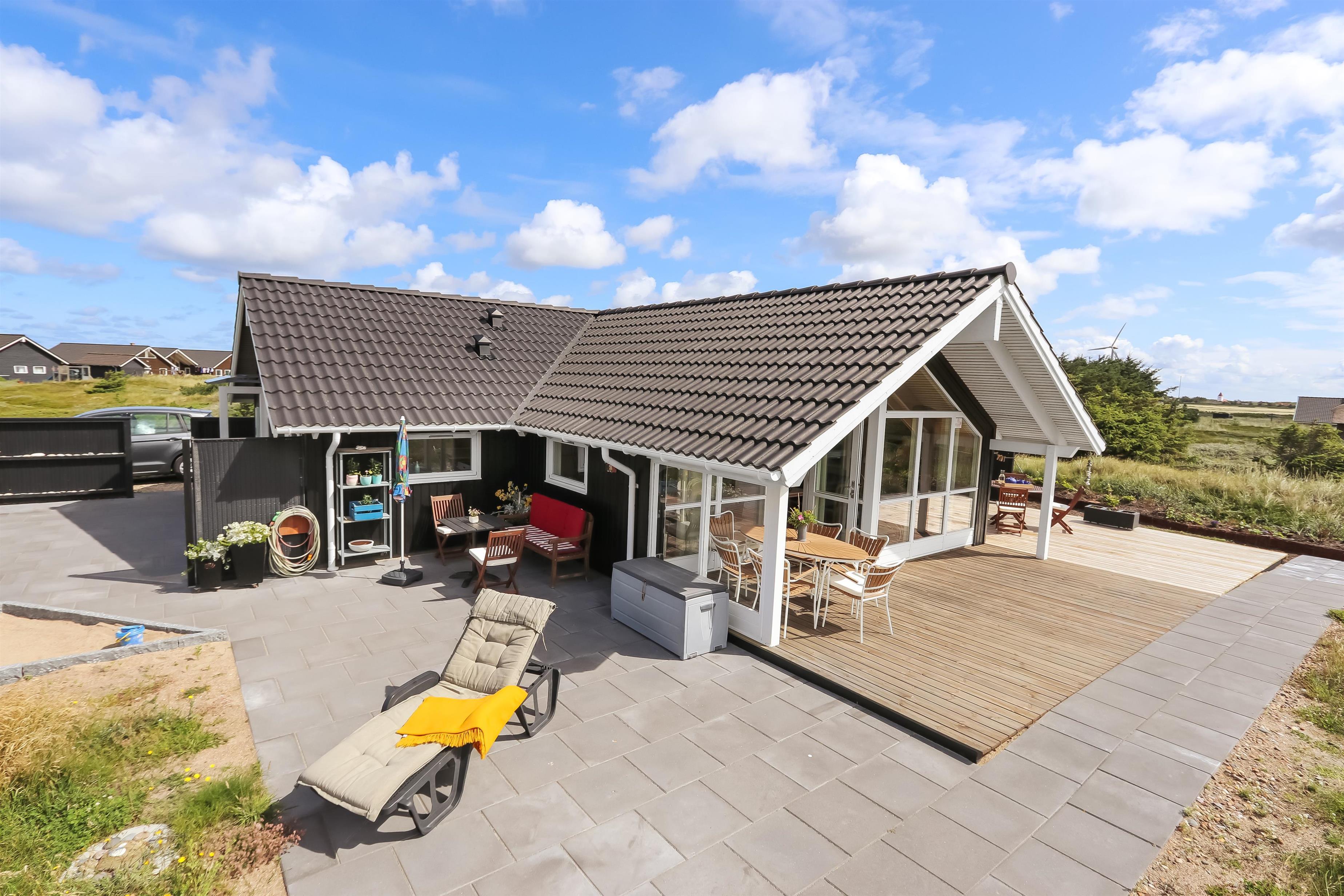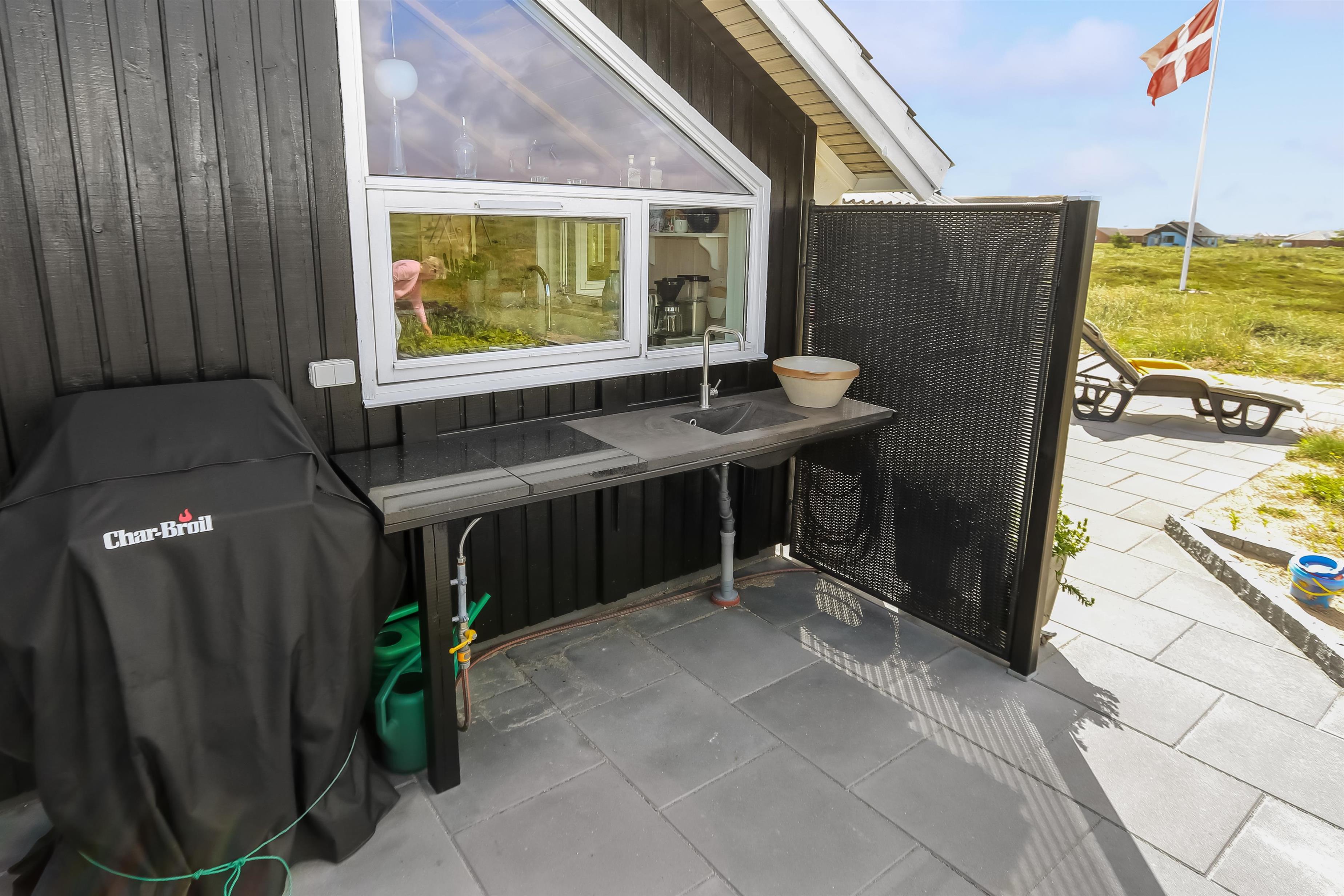 Huset er omgivet af en stor terrasse, som giver masser af plads til udendørs afslapning og aktiviteter. Her kan du finde læ og nyde solen fra morgen til aften. Der er havemøbler på terrassen, så du kan spise ude eller bare slappe af med en god bog. Der er også et udekøkken, som gør det nemt at tilberede måltider udendørs, perfekt til de varme sommerdage, hvor du kan grille og nyde måltider i det fri.