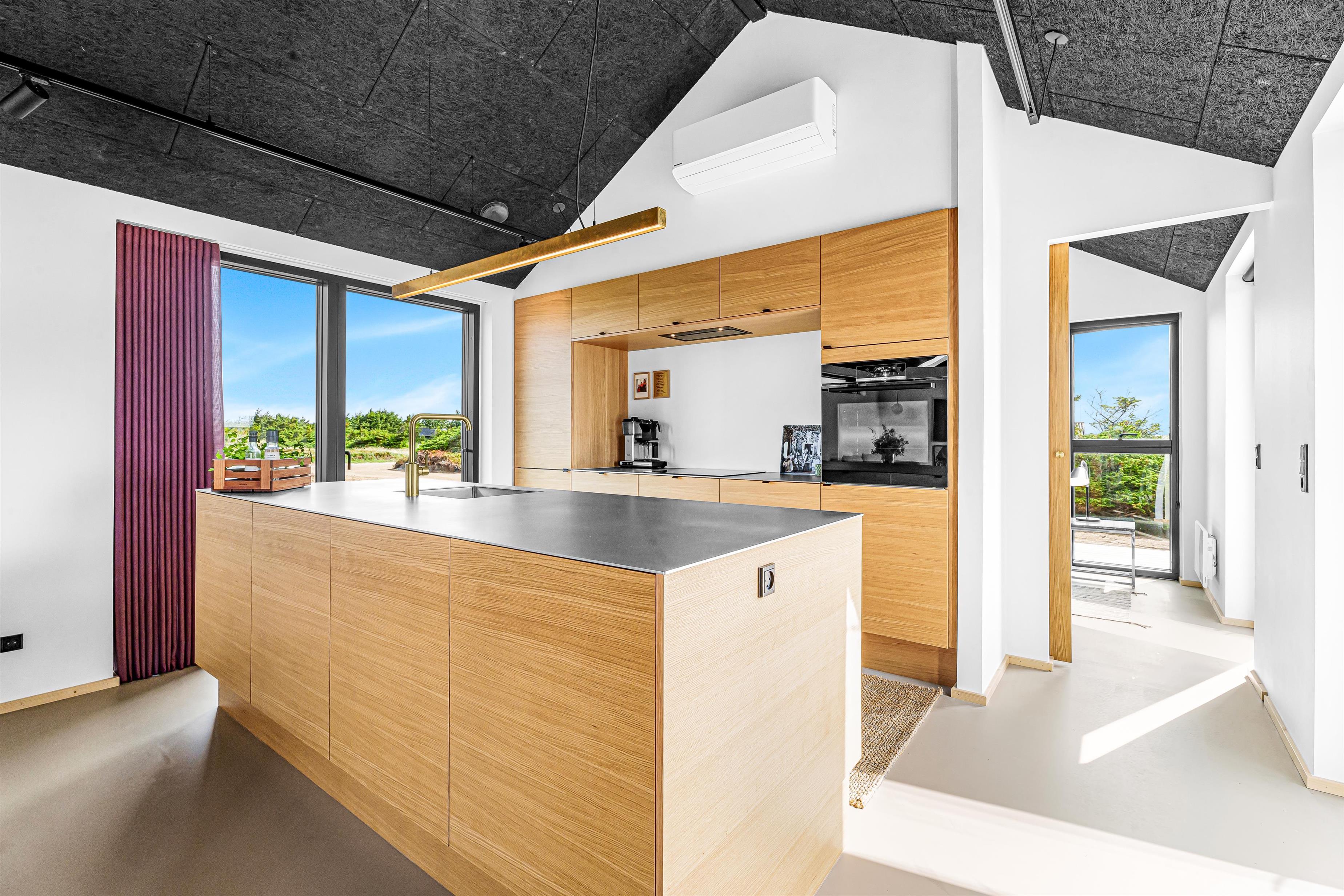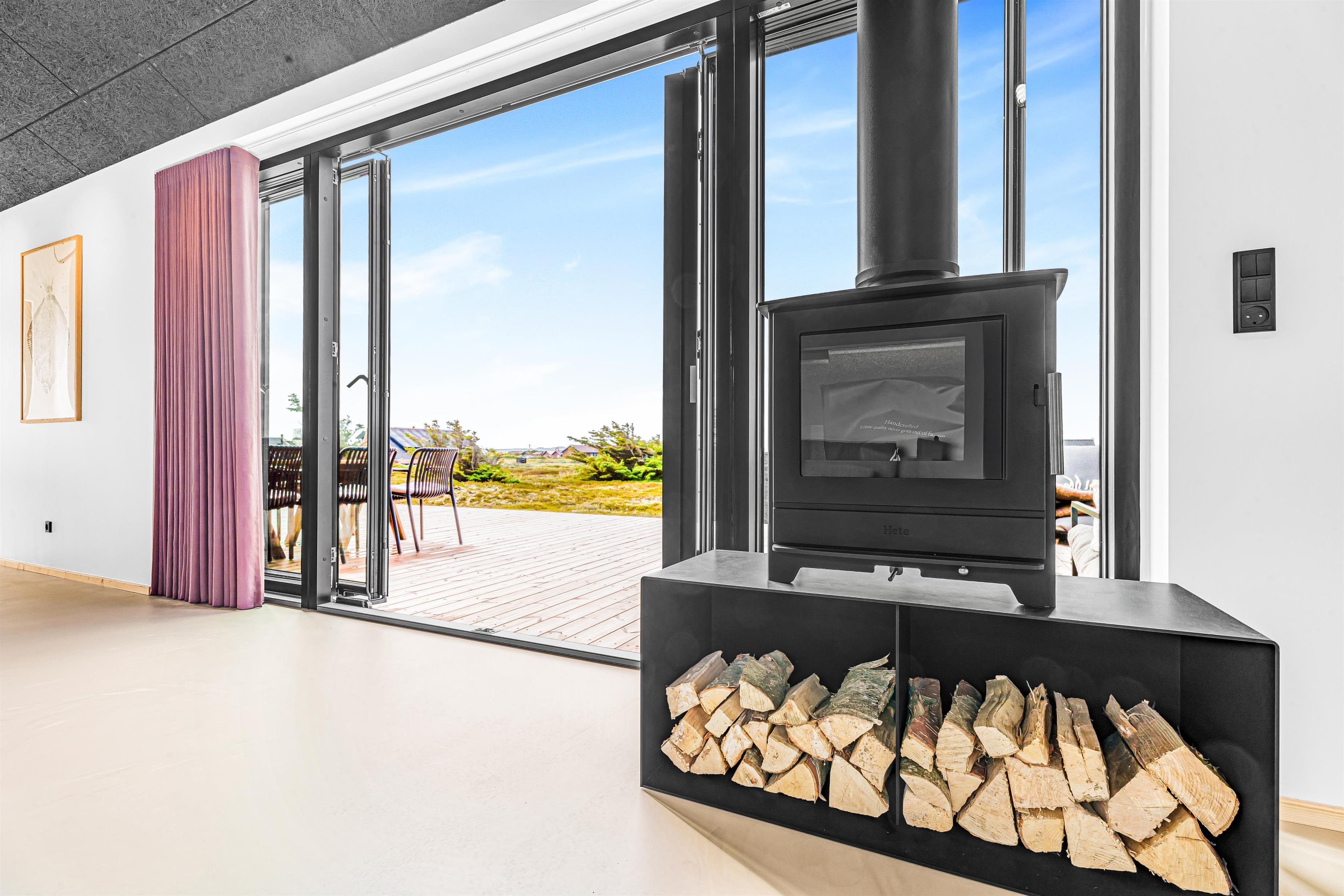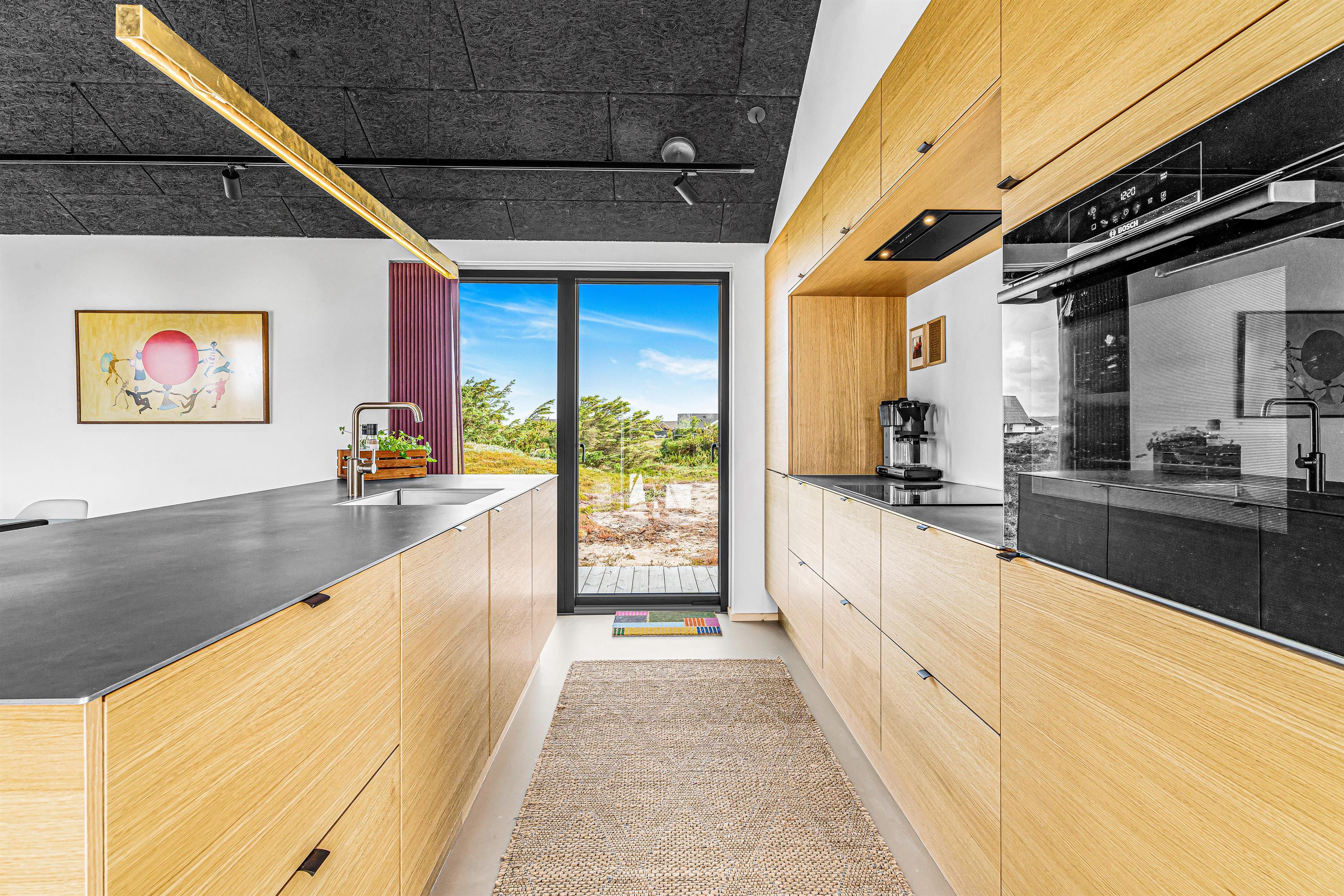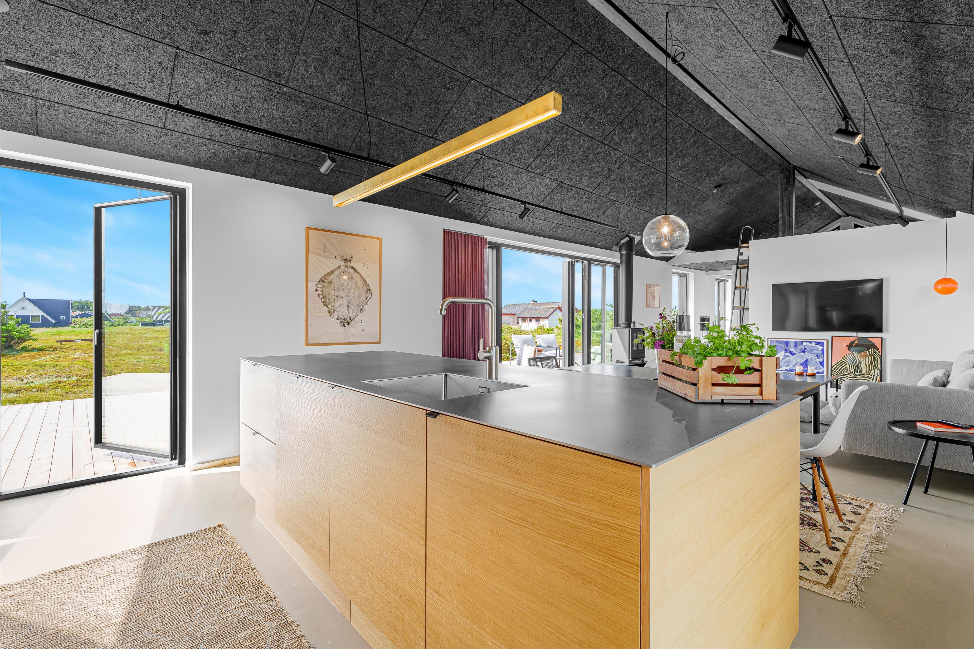 Fra entréen kommer man direkte ind i husets kernerum, som er en kombineret opholdsstue og køkken med høje lofter. Her er der plads til at alle husets gæster kan samles og nyde hinandens samvær. Nævneværdigt er feriehusets indretningsstil og materialesammensætning. Køkkenet består af egetræsfiner med stålbordplade og i hele opholdsrummet er der et blødt Epoxy PU-gulv. Køkkenet er udstyret med blandt andet køle-/fryseskab, opvaskemaskine, indbygningsovn, glaskeramiske kogeplader, emhætte og mikroovn. Her er alt, hvad man skal bruge til en ferie ved Vesterhavet. Stuehjørnet indbyder til filmhygge, da den er indrettet med lædermøbler og fjernsyn med den store pakke af fibernet-TV altså både danske og tyske kanaler. Desuden er der en Chromecast, hvorfra man kan streame egne streamingtjenester. Opholdsrummet kan opvarmes ved hjælp af en brændeovn, der skaber hygge og kan varme hele huset op på selv en kold og trist vinterdag.