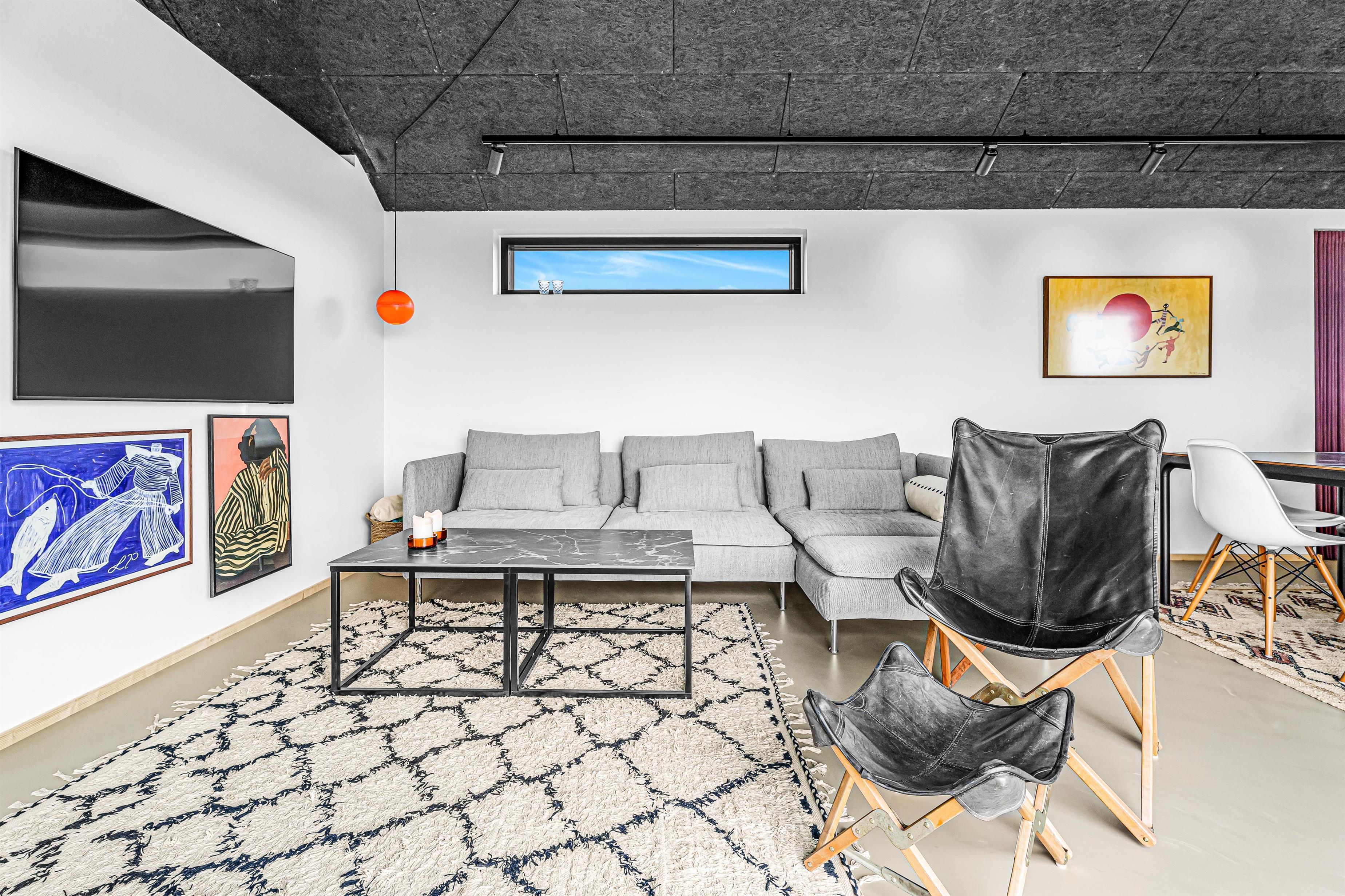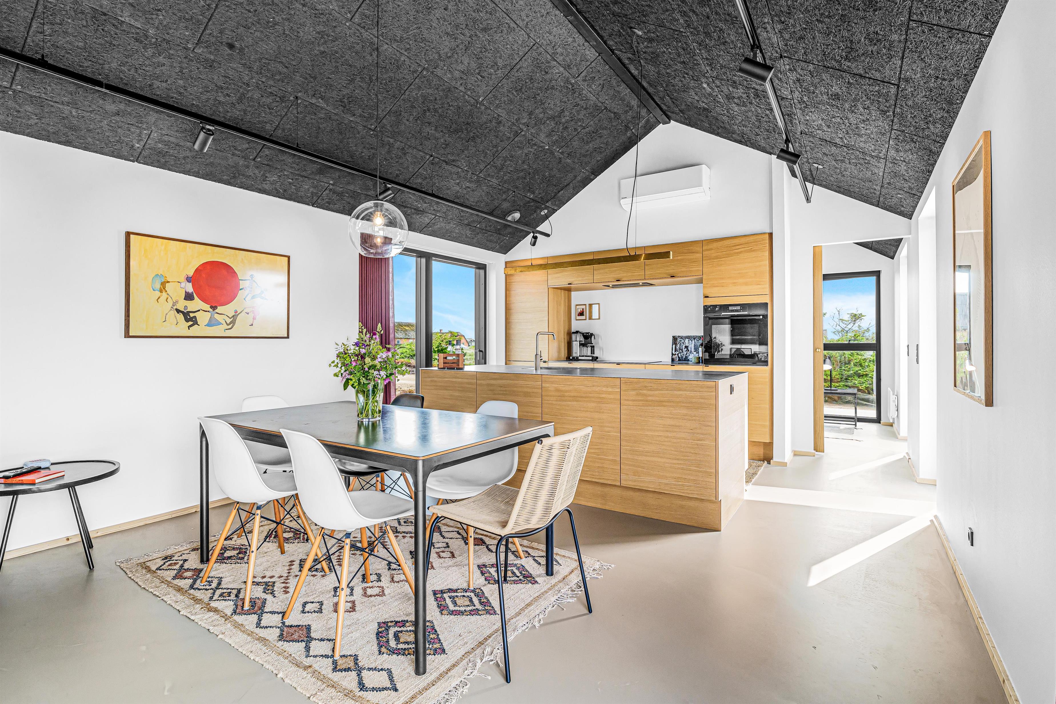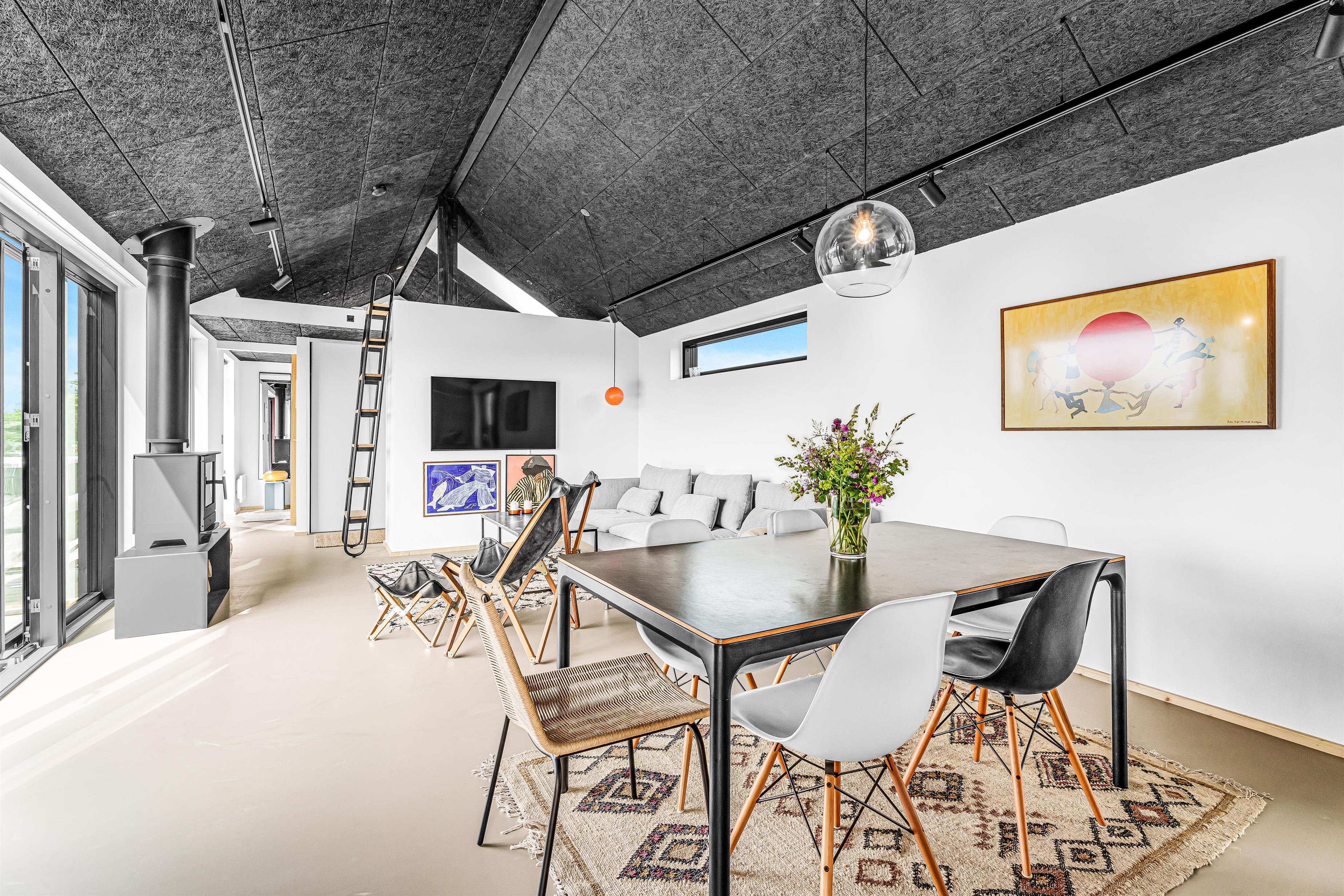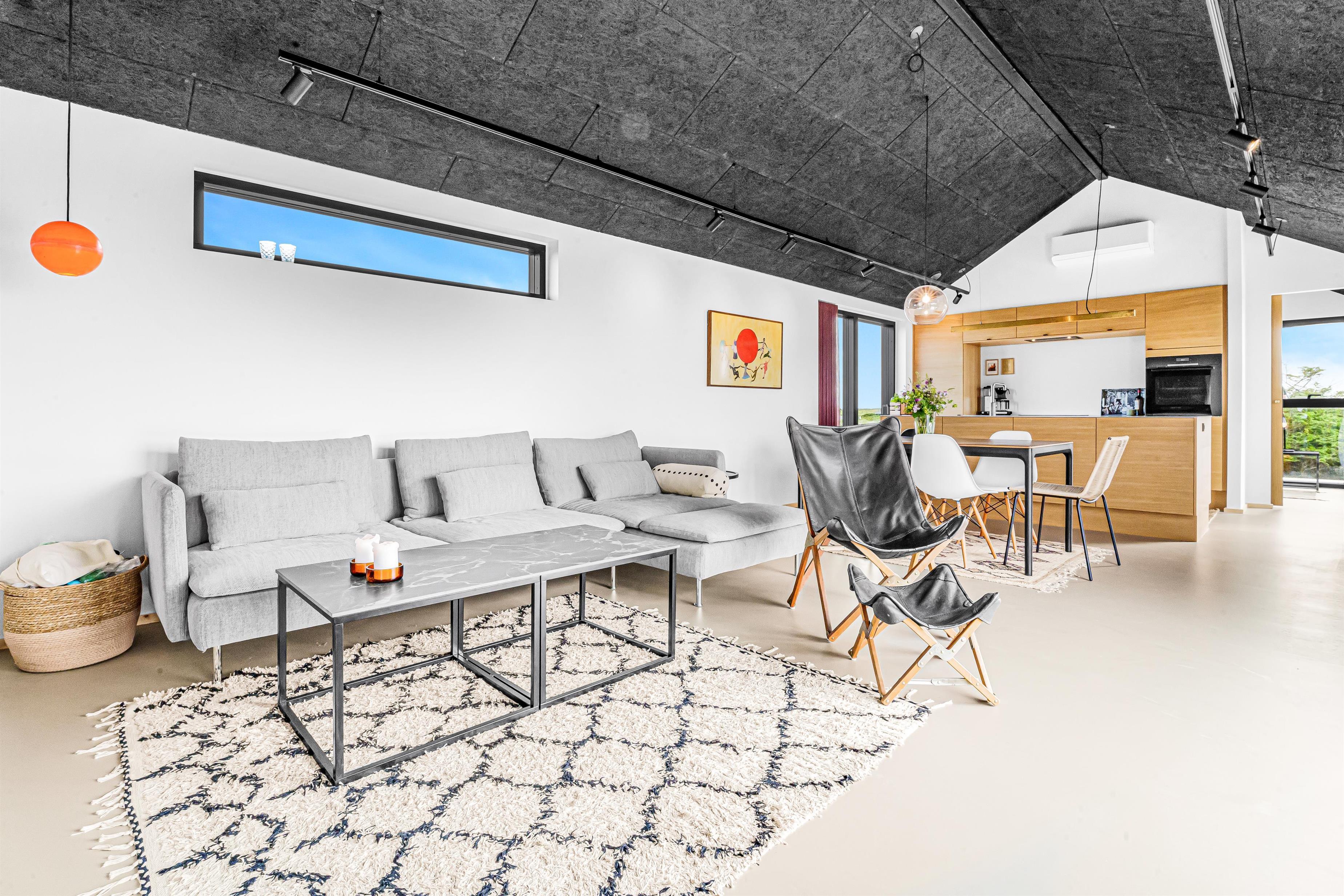 Fra entréen kommer man direkte ind i husets kernerum, som er en kombineret opholdsstue og køkken med høje lofter. Her er der plads til at alle husets gæster kan samles og nyde hinandens samvær. Nævneværdigt er feriehusets indretningsstil og materialesammensætning. Køkkenet består af egetræsfiner med stålbordplade og i hele opholdsrummet er der et blødt Epoxy PU-gulv. Køkkenet er udstyret med blandt andet køle-/fryseskab, opvaskemaskine, indbygningsovn, glaskeramiske kogeplader, emhætte og mikroovn. Her er alt, hvad man skal bruge til en ferie ved Vesterhavet. Stuehjørnet indbyder til filmhygge, da den er indrettet med lædermøbler og fjernsyn med den store pakke af fibernet-TV altså både danske og tyske kanaler. Desuden er der en Chromecast, hvorfra man kan streame egne streamingtjenester. Opholdsrummet kan opvarmes ved hjælp af en brændeovn, der skaber hygge og kan varme hele huset op på selv en kold og trist vinterdag.