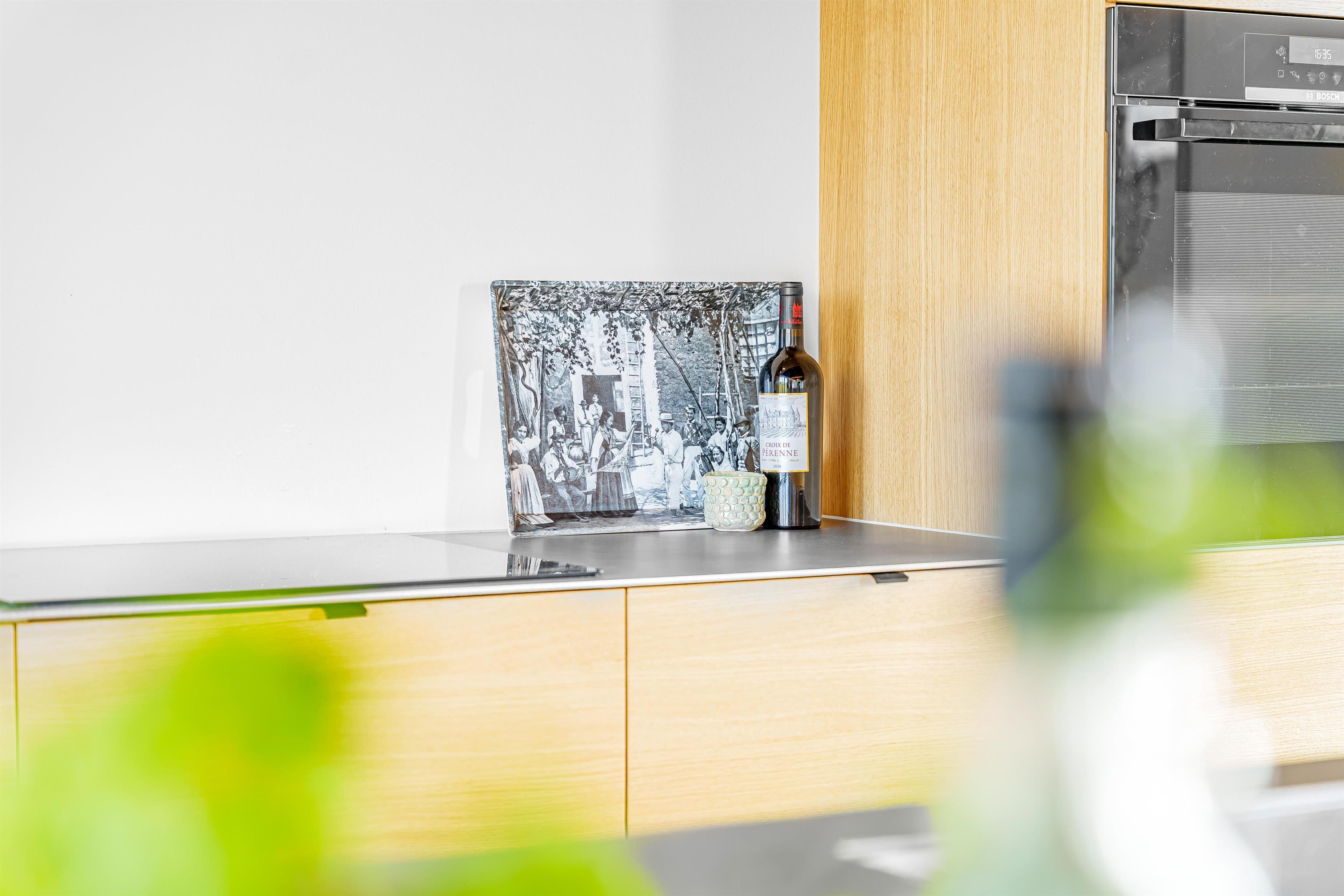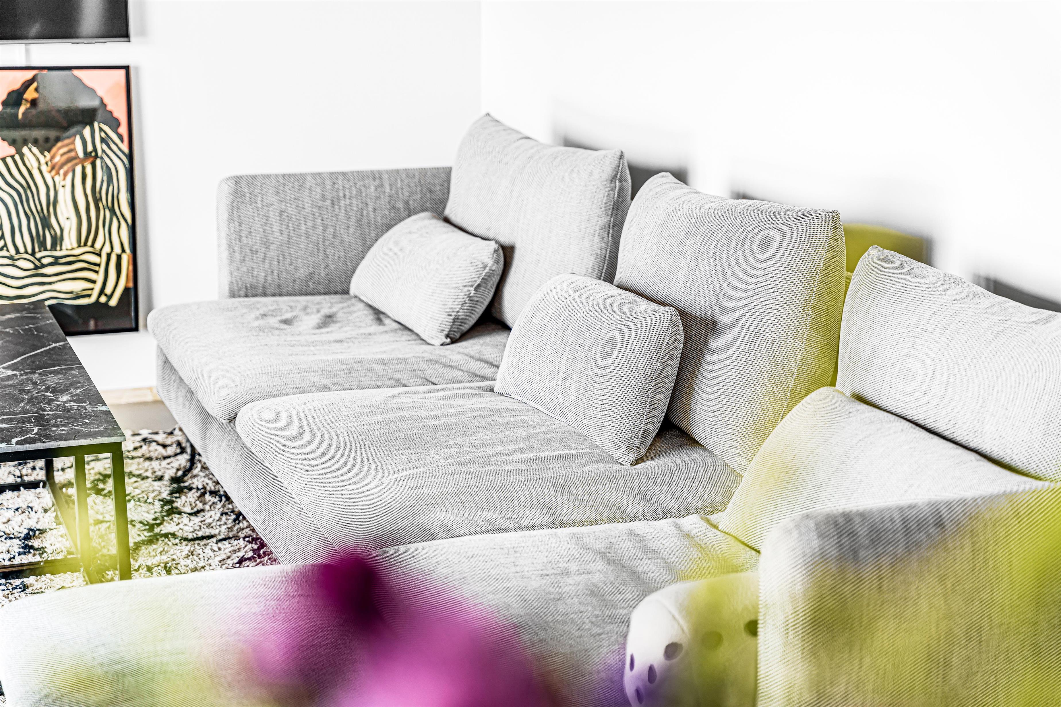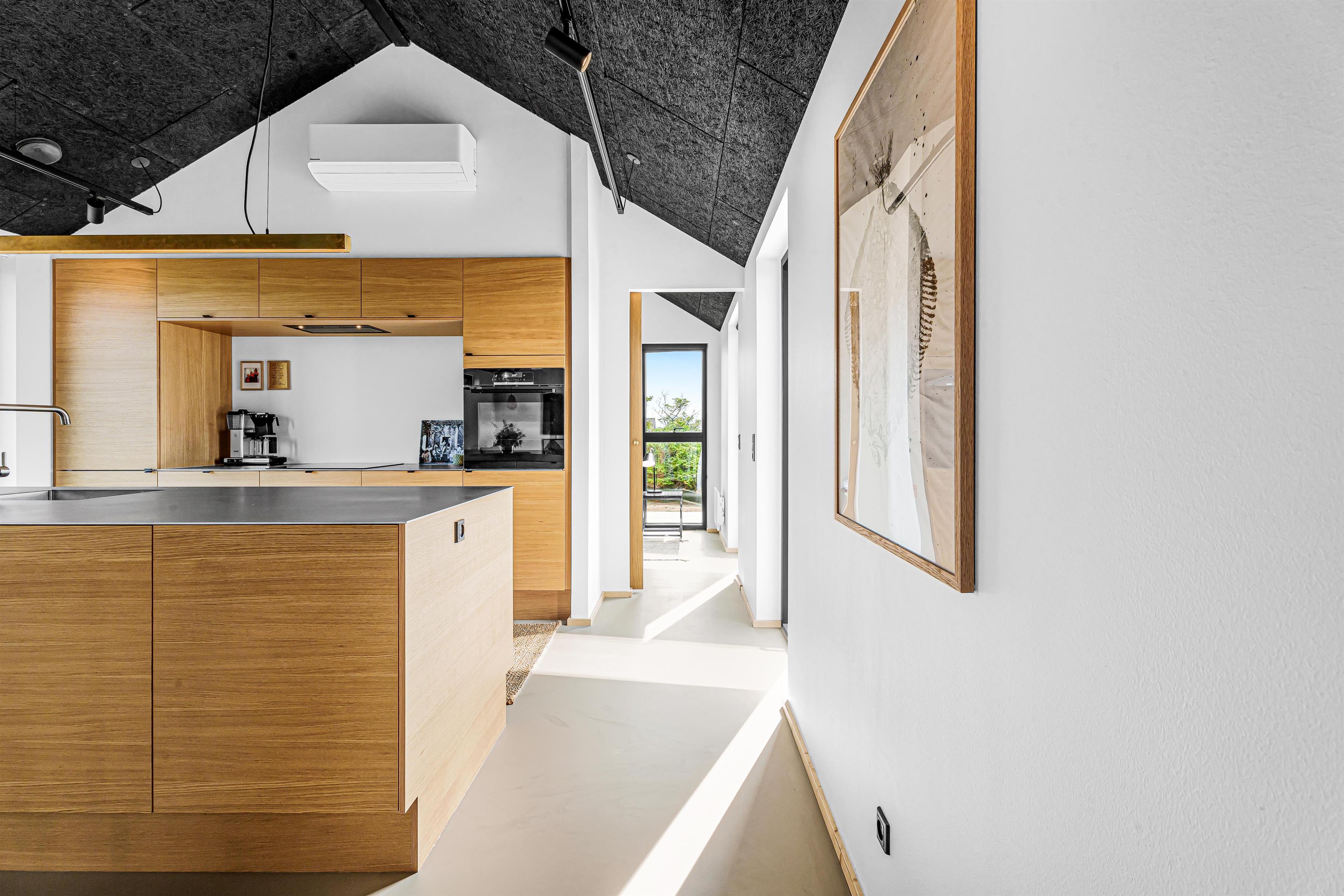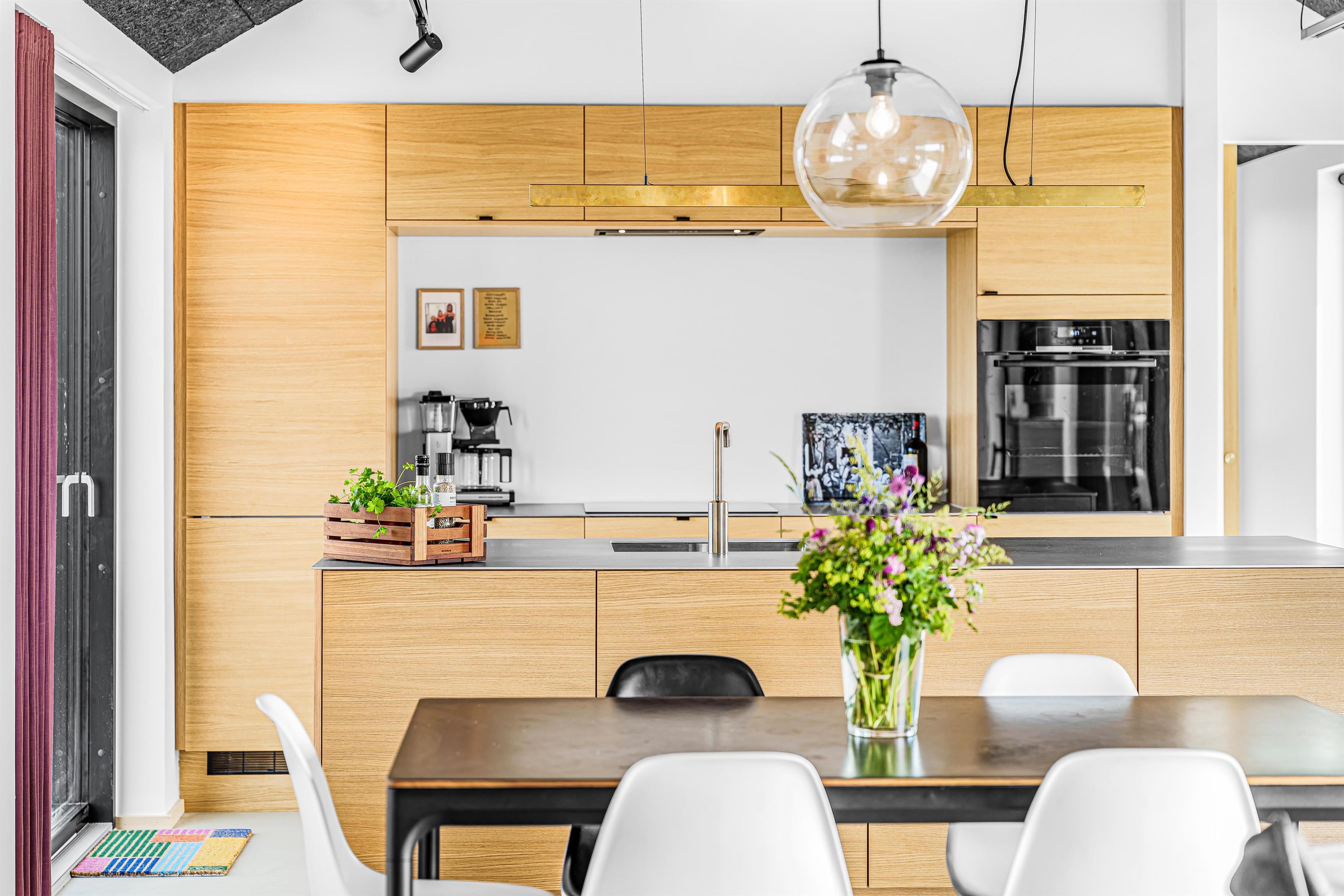 Fra entréen kommer man direkte ind i husets kernerum, som er en kombineret opholdsstue og køkken med høje lofter. Her er der plads til at alle husets gæster kan samles og nyde hinandens samvær. Nævneværdigt er feriehusets indretningsstil og materialesammensætning. Køkkenet består af egetræsfiner med stålbordplade og i hele opholdsrummet er der et blødt Epoxy PU-gulv. Køkkenet er udstyret med blandt andet køle-/fryseskab, opvaskemaskine, indbygningsovn, glaskeramiske kogeplader, emhætte og mikroovn. Her er alt, hvad man skal bruge til en ferie ved Vesterhavet. Stuehjørnet indbyder til filmhygge, da den er indrettet med lædermøbler og fjernsyn med den store pakke af fibernet-TV altså både danske og tyske kanaler. Desuden er der en Chromecast, hvorfra man kan streame egne streamingtjenester. Opholdsrummet kan opvarmes ved hjælp af en brændeovn, der skaber hygge og kan varme hele huset op på selv en kold og trist vinterdag.
