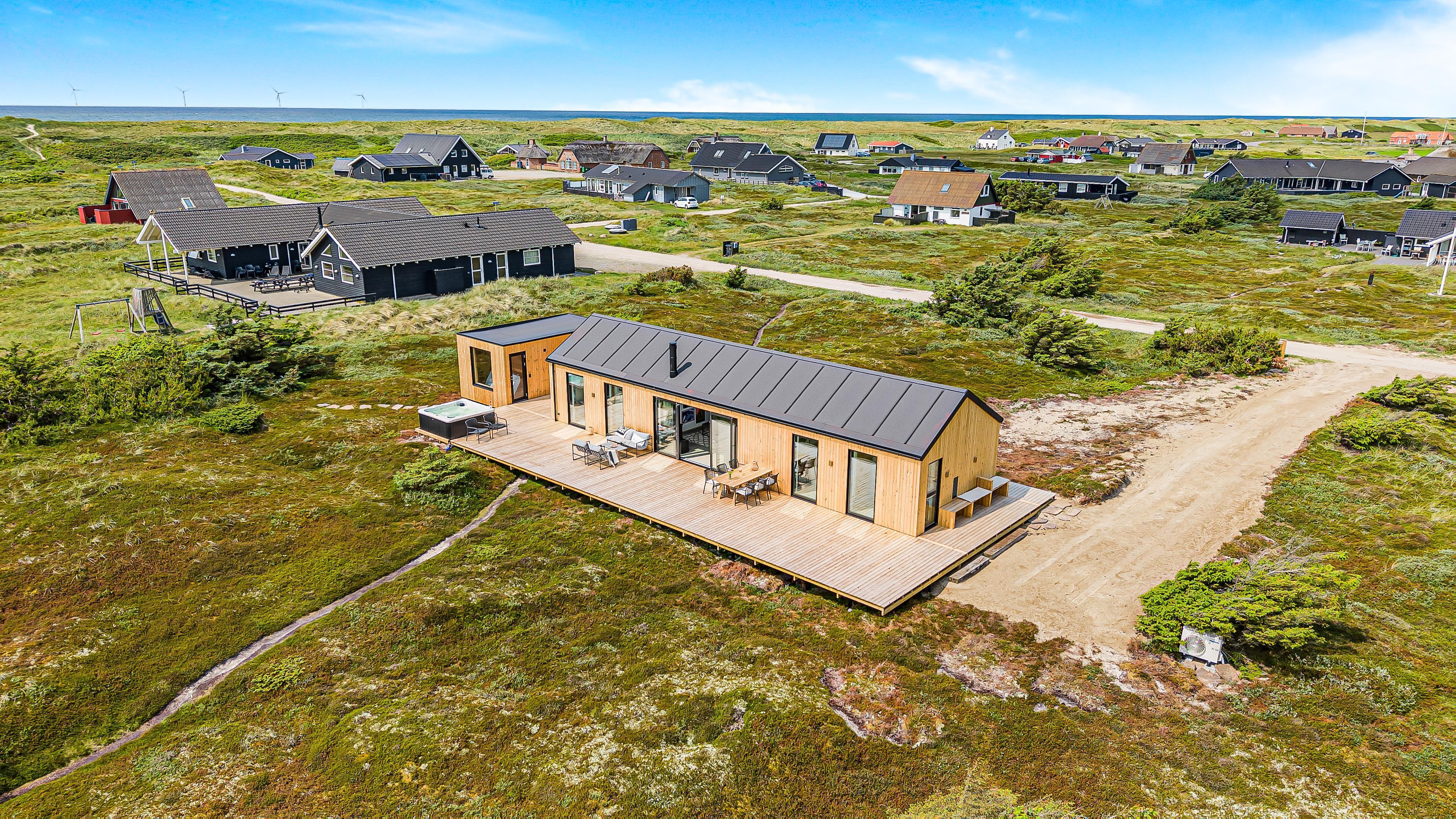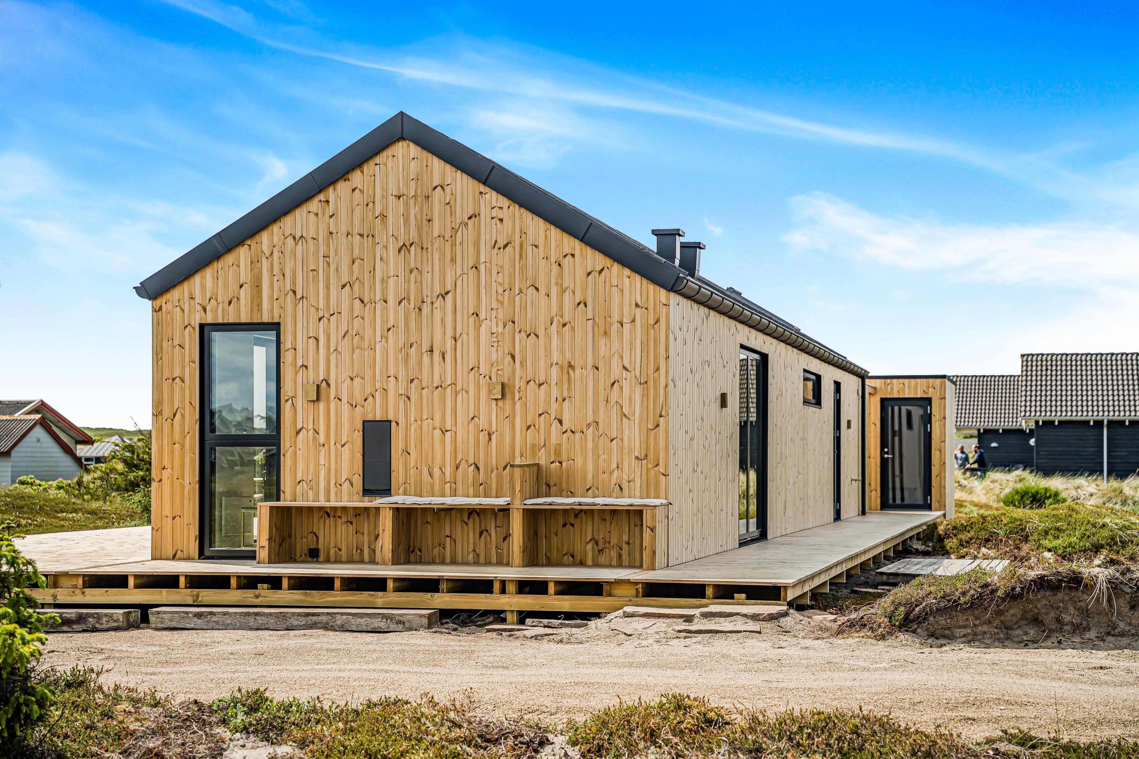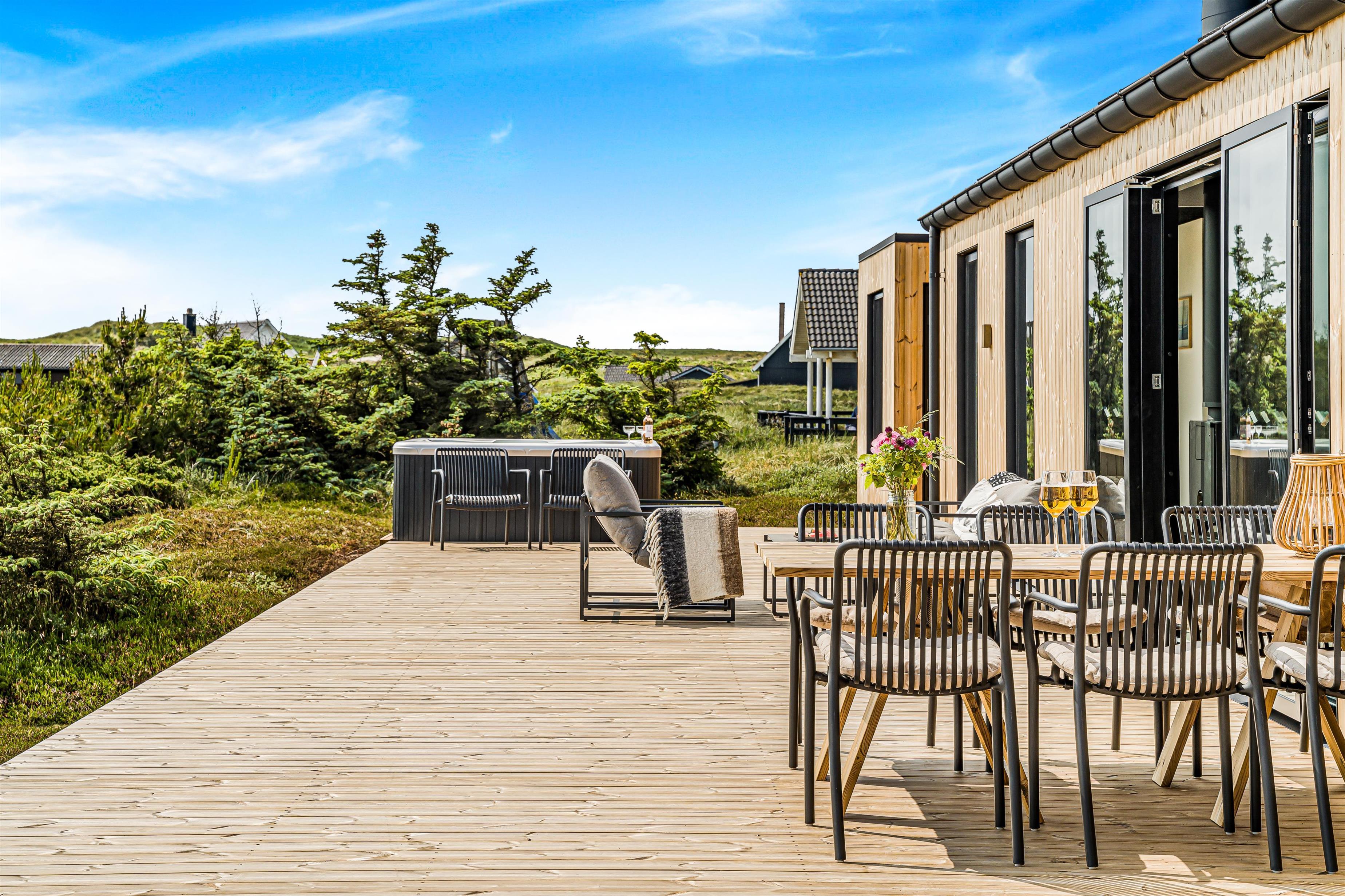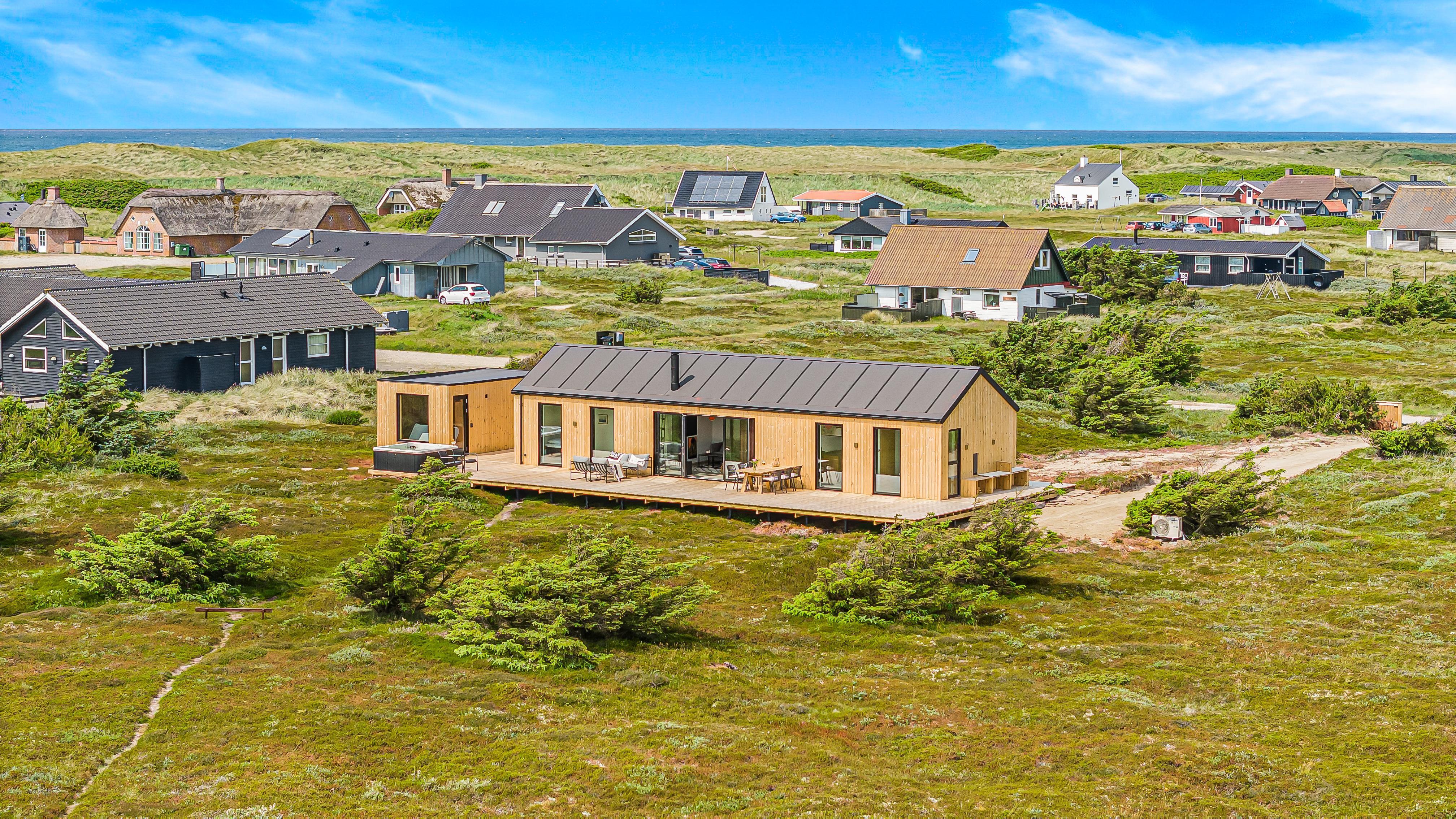 Feriehuset ligger på en 2500 m2 stor kuperet naturgrund, hvor udearealerne er et kapitel for sig selv. Huset er omkranset af en 110m2 stor træterrasse med udendørs wellnessområde. Her kan man hoppe en tur i den lækre udendørsspa. Har man været en tur i havet, kan man skylle sig af i udendørsbruseren og derefter varme sig igennem i udendørssaunaen. Desuden indbyder terrassen med havemøbler, solvogn og grill til hyggelige stunder med de nærmeste. Afstanden til det brusende Vesterhav er ganske kort – der er ikke mere end 200 meter, så står man og nyder den fabelagtige udsigt over det levende maleri Vesterhavet. Husets beliggenhed betyder at man kan være i Harboøre by på gåben på ganske få minutter, hvor der findes indkøbsmuligheder, spisemuligheder samt en masse aktiviteter for børnene. Ikke langt fra Vrist kommer man i bil hurtigt til havnebyerne Lemvig og Thyborøn, hvor man kan nyde en is på havnen, købe frisk fisk eller shoppe i de lokale butikker. Eller man tager det lille VLTJ-tog, hvortil man kan få gratis togbilletter på SJ’s kontor til at køre mellem Lemvig og Thyborøn.