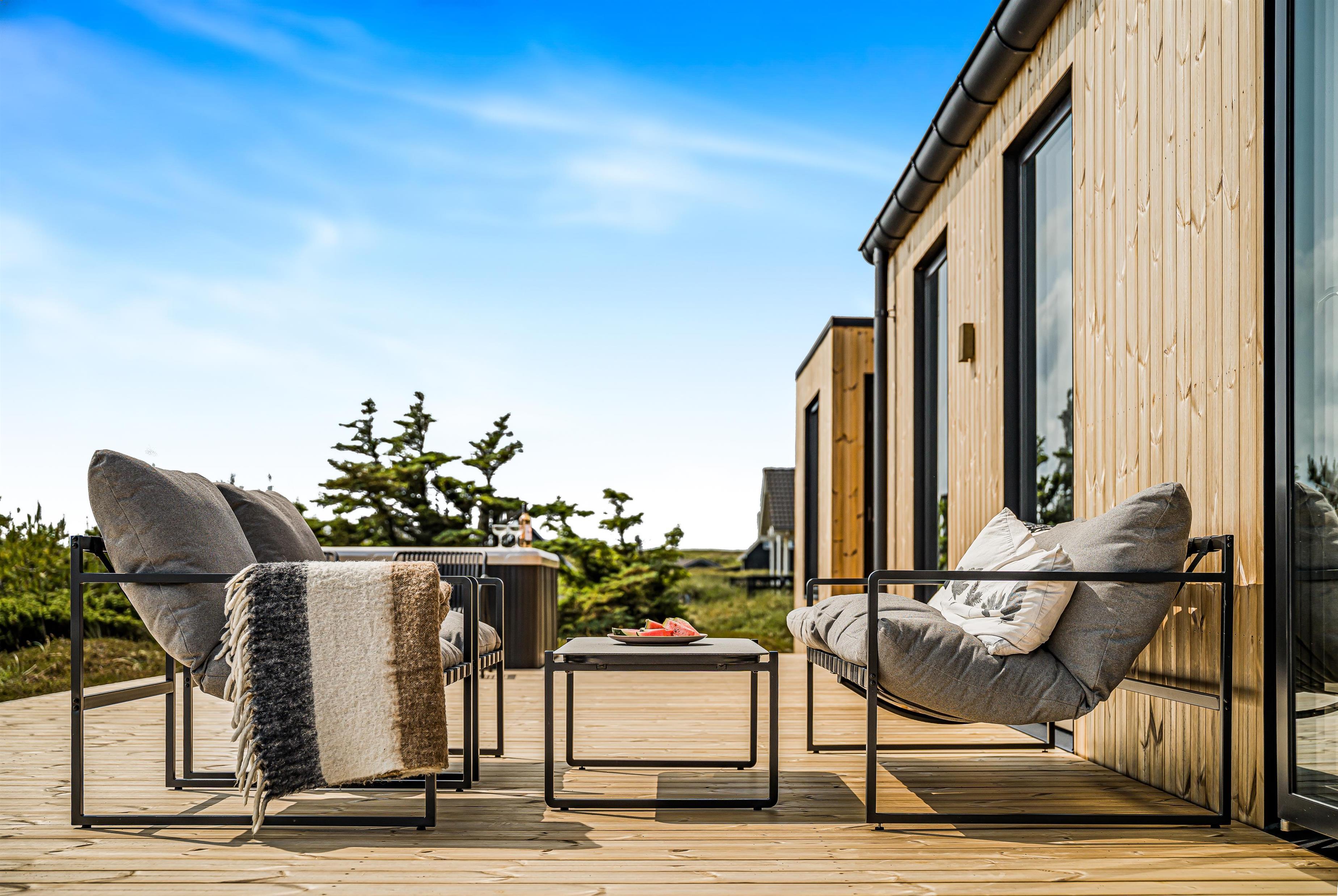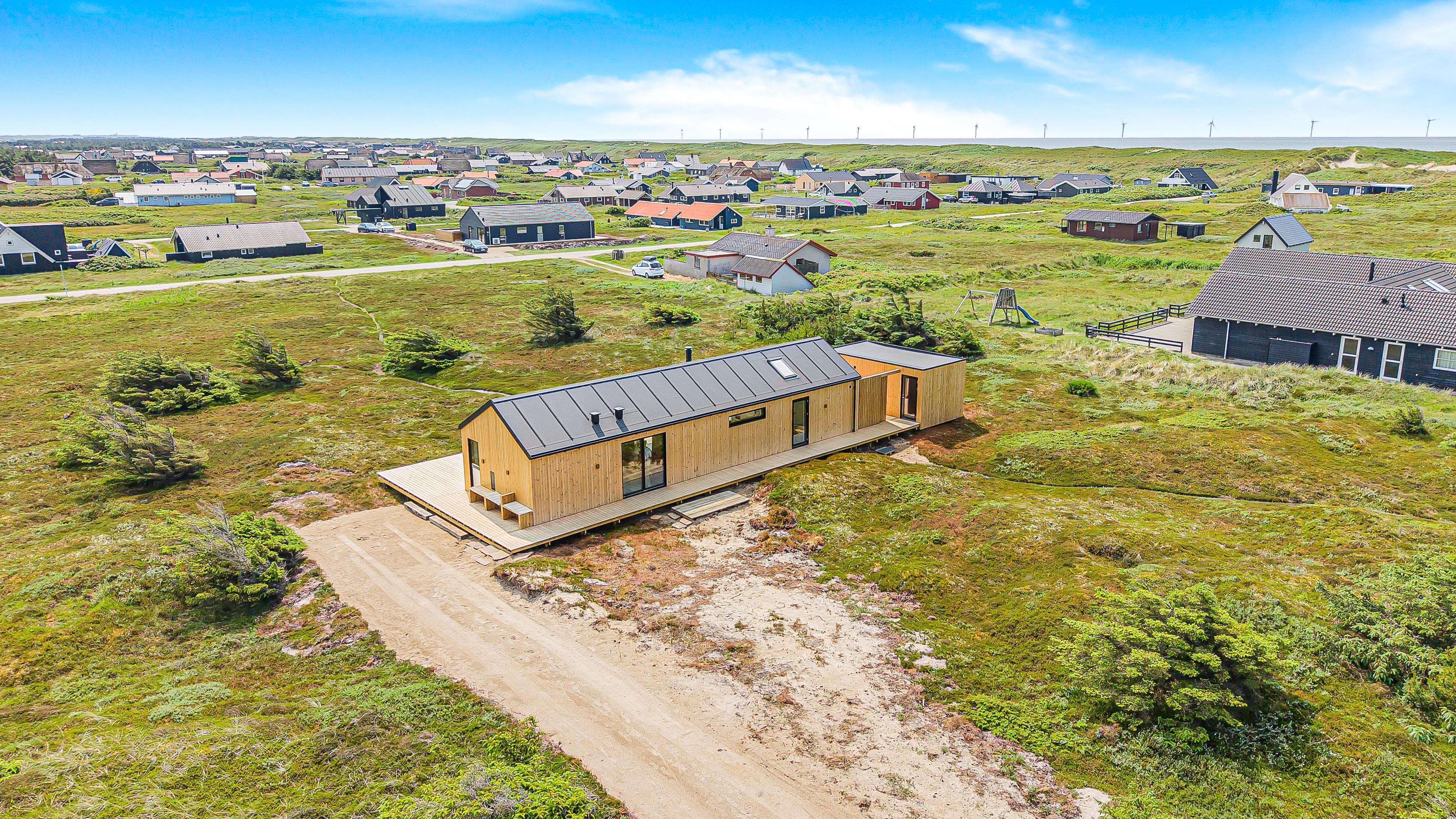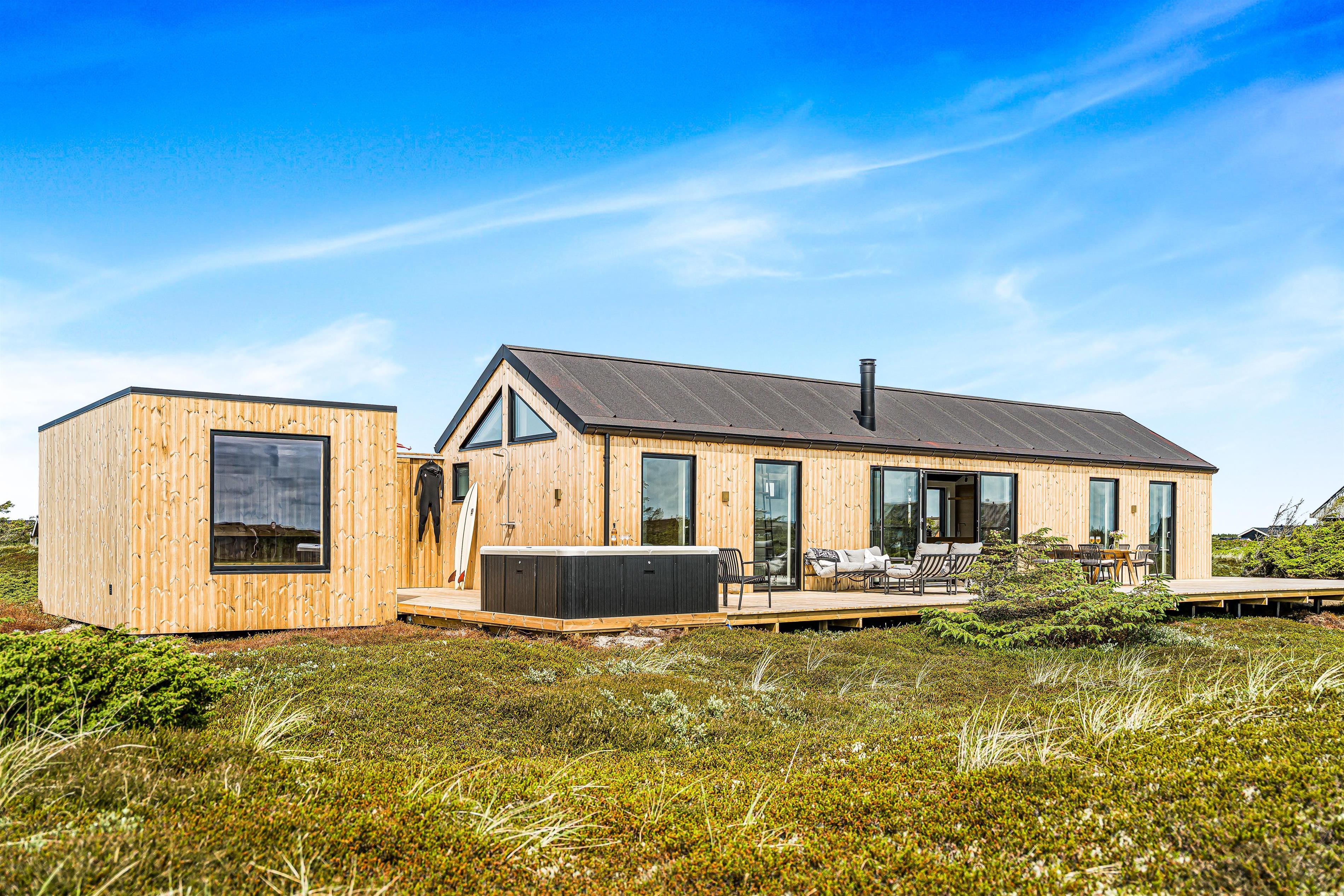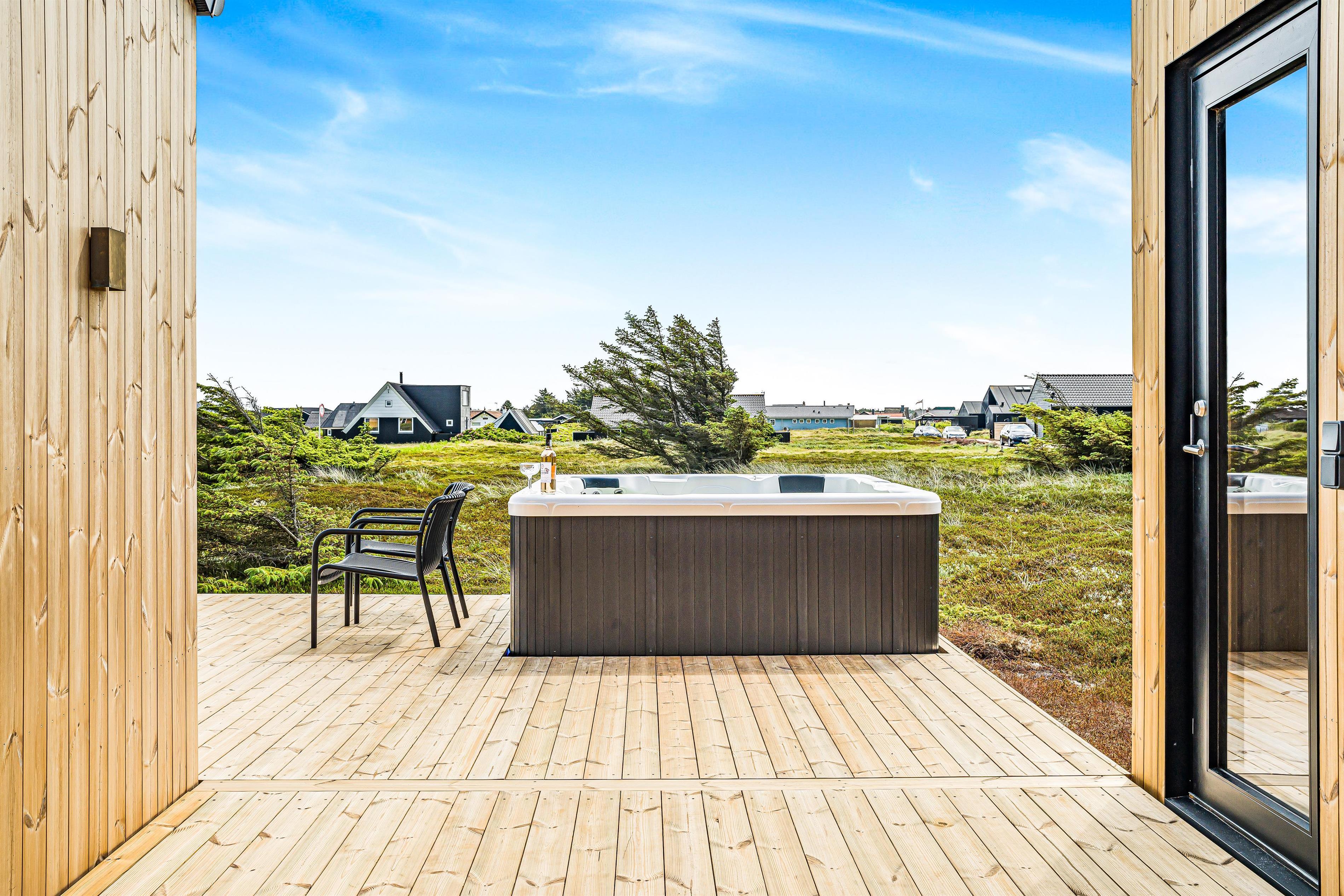 Feriehuset ligger på en 2500 m2 stor kuperet naturgrund, hvor udearealerne er et kapitel for sig selv. Huset er omkranset af en 110m2 stor træterrasse med udendørs wellnessområde. Her kan man hoppe en tur i den lækre udendørsspa. Har man været en tur i havet, kan man skylle sig af i udendørsbruseren og derefter varme sig igennem i udendørssaunaen. Desuden indbyder terrassen med havemøbler, solvogn og grill til hyggelige stunder med de nærmeste. Afstanden til det brusende Vesterhav er ganske kort – der er ikke mere end 200 meter, så står man og nyder den fabelagtige udsigt over det levende maleri Vesterhavet. Husets beliggenhed betyder at man kan være i Harboøre by på gåben på ganske få minutter, hvor der findes indkøbsmuligheder, spisemuligheder samt en masse aktiviteter for børnene. Ikke langt fra Vrist kommer man i bil hurtigt til havnebyerne Lemvig og Thyborøn, hvor man kan nyde en is på havnen, købe frisk fisk eller shoppe i de lokale butikker. Eller man tager det lille VLTJ-tog, hvortil man kan få gratis togbilletter på SJ’s kontor til at køre mellem Lemvig og Thyborøn.