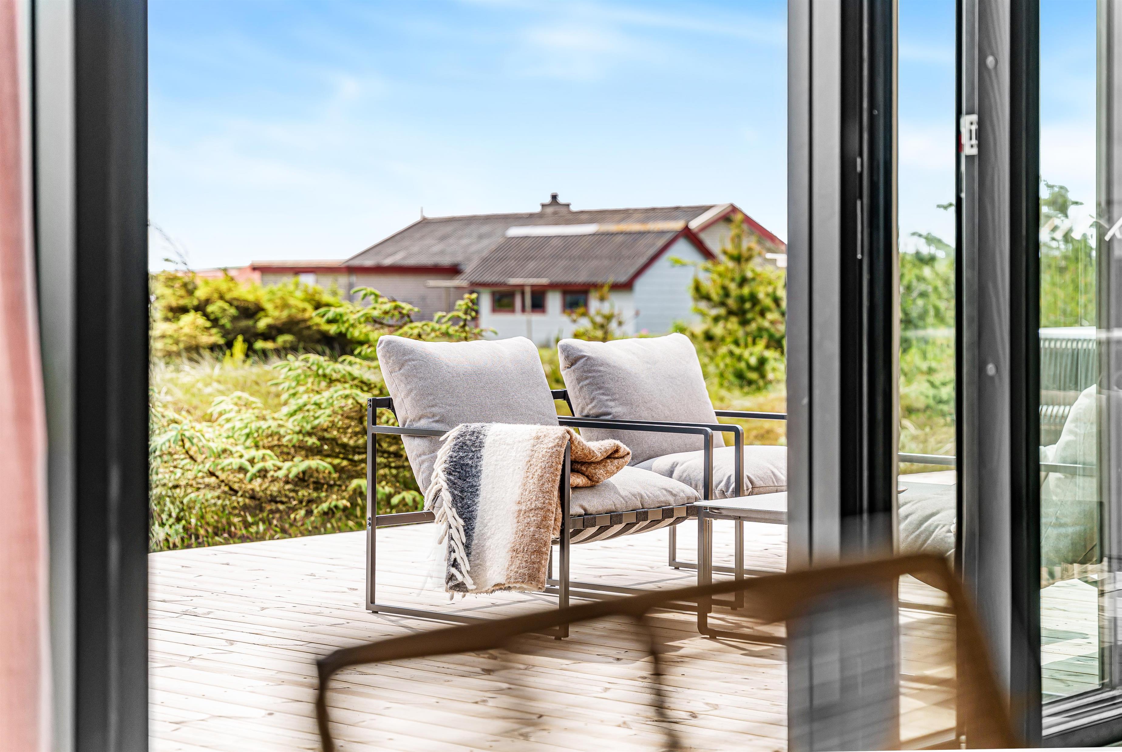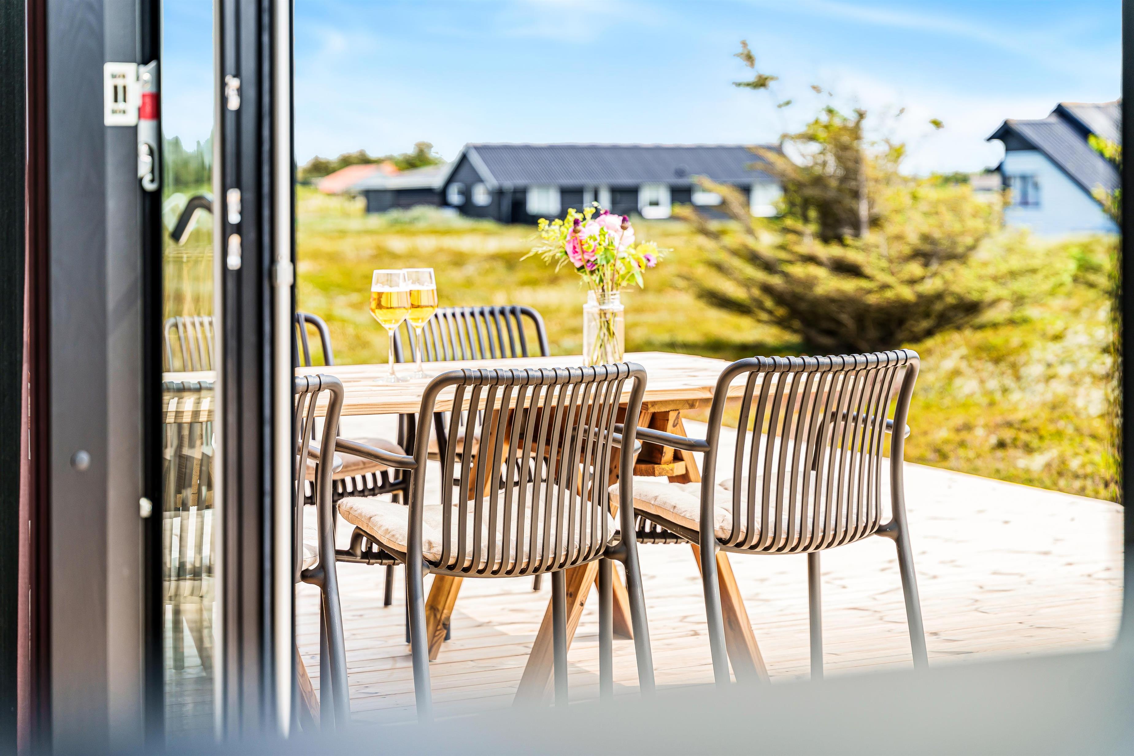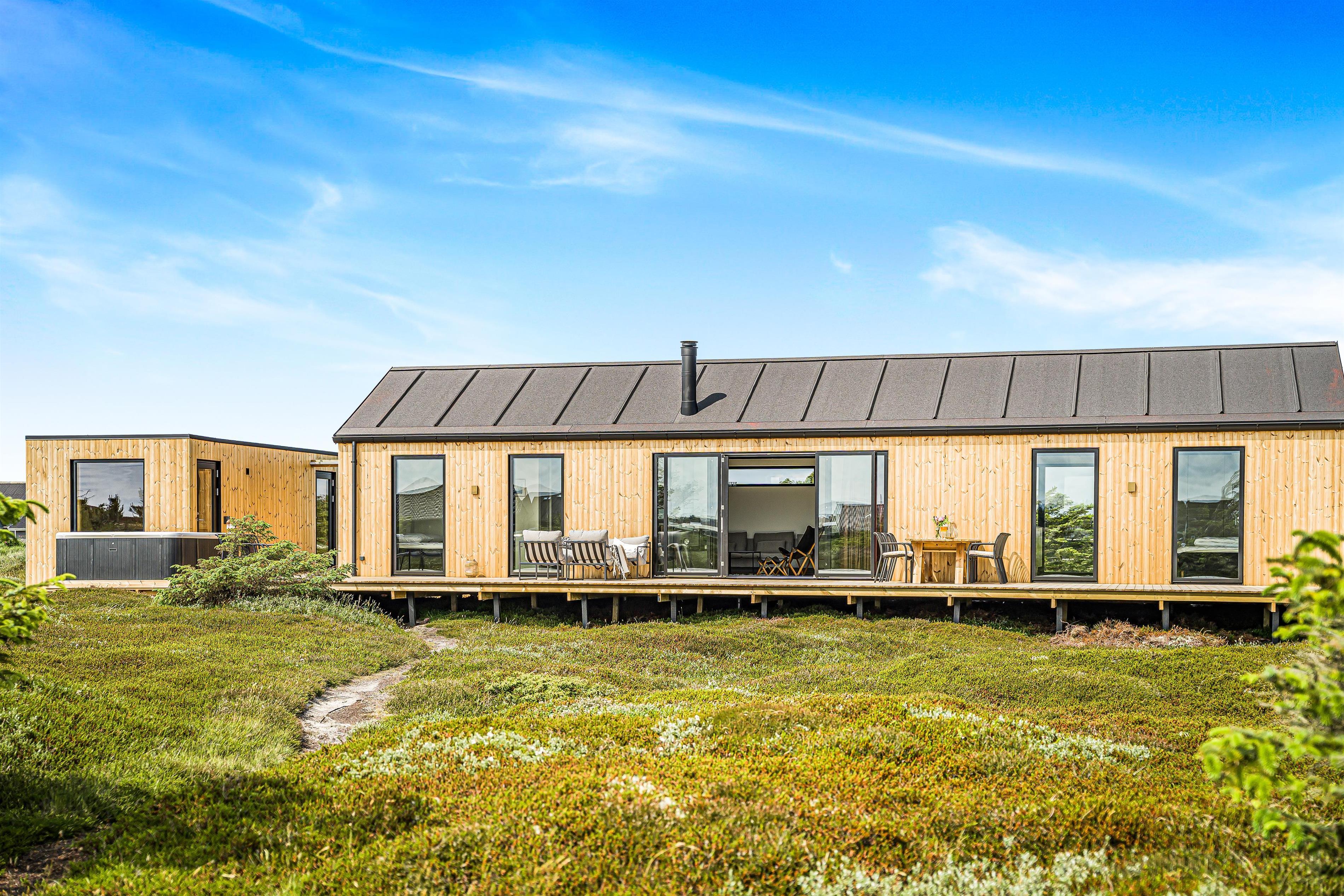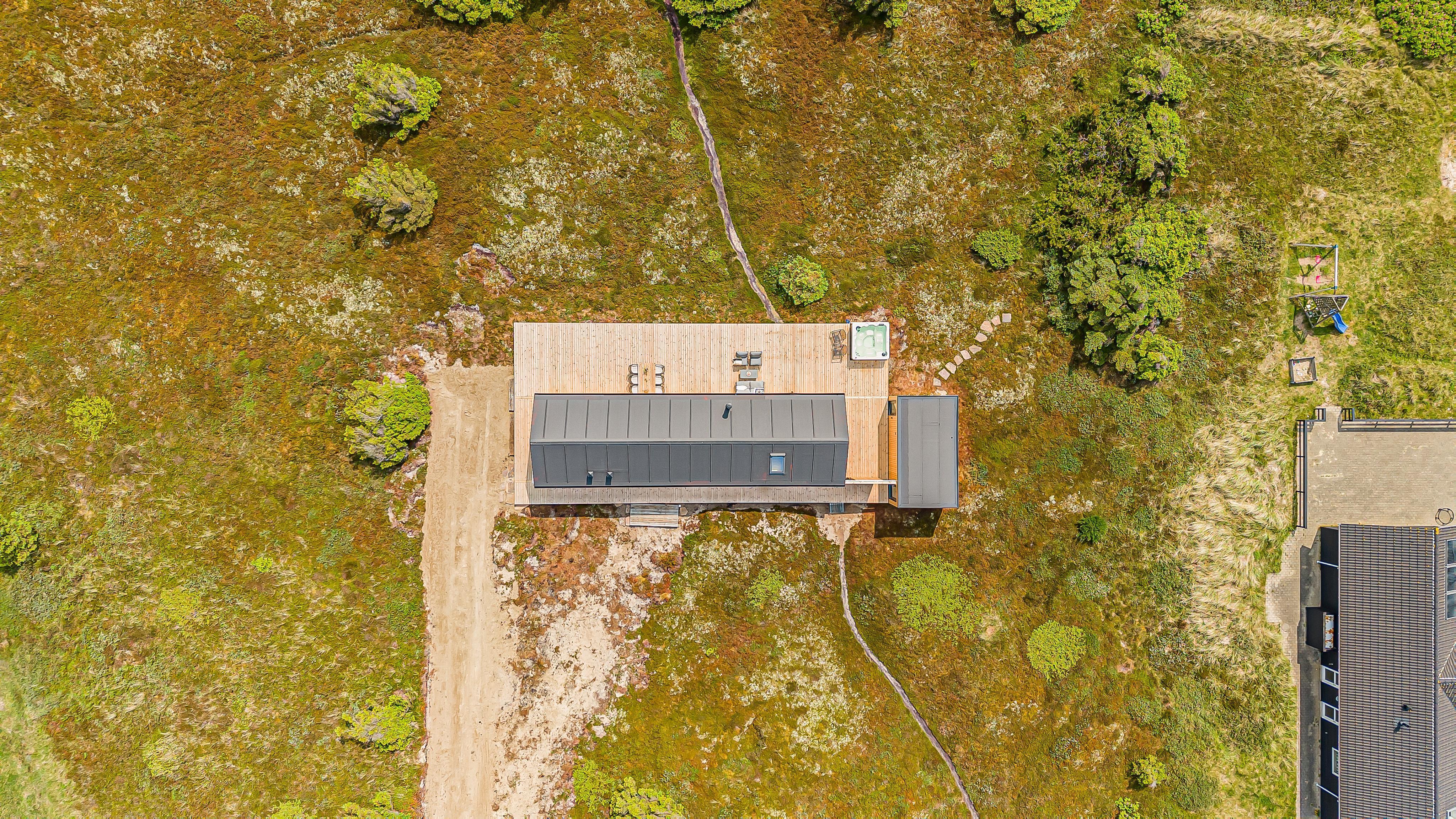 Feriehuset ligger på en 2500 m2 stor kuperet naturgrund, hvor udearealerne er et kapitel for sig selv. Huset er omkranset af en 110m2 stor træterrasse med udendørs wellnessområde. Her kan man hoppe en tur i den lækre udendørsspa. Har man været en tur i havet, kan man skylle sig af i udendørsbruseren og derefter varme sig igennem i udendørssaunaen. Desuden indbyder terrassen med havemøbler, solvogn og grill til hyggelige stunder med de nærmeste. Afstanden til det brusende Vesterhav er ganske kort – der er ikke mere end 200 meter, så står man og nyder den fabelagtige udsigt over det levende maleri Vesterhavet. Husets beliggenhed betyder at man kan være i Harboøre by på gåben på ganske få minutter, hvor der findes indkøbsmuligheder, spisemuligheder samt en masse aktiviteter for børnene. Ikke langt fra Vrist kommer man i bil hurtigt til havnebyerne Lemvig og Thyborøn, hvor man kan nyde en is på havnen, købe frisk fisk eller shoppe i de lokale butikker. Eller man tager det lille VLTJ-tog, hvortil man kan få gratis togbilletter på SJ’s kontor til at køre mellem Lemvig og Thyborøn.