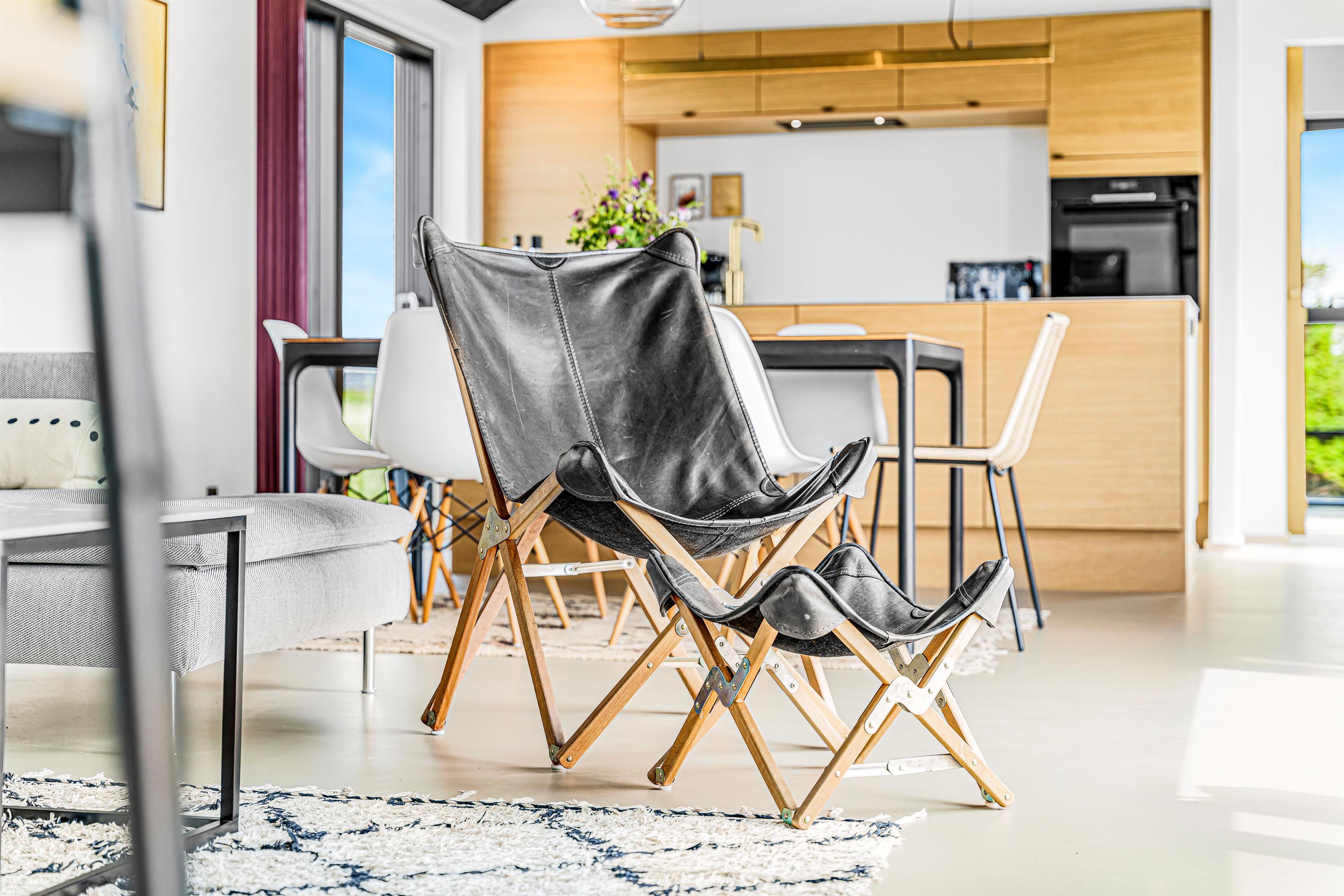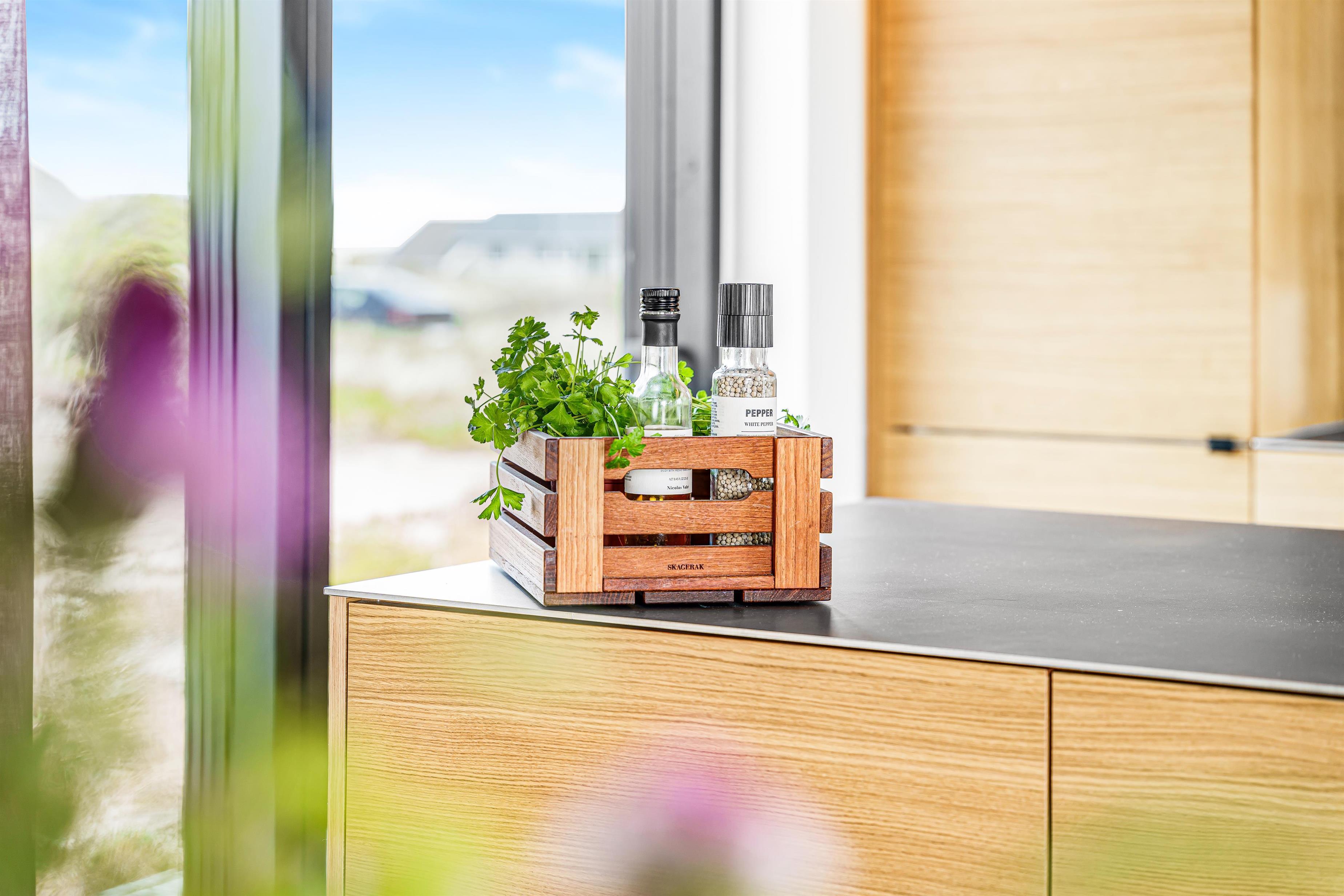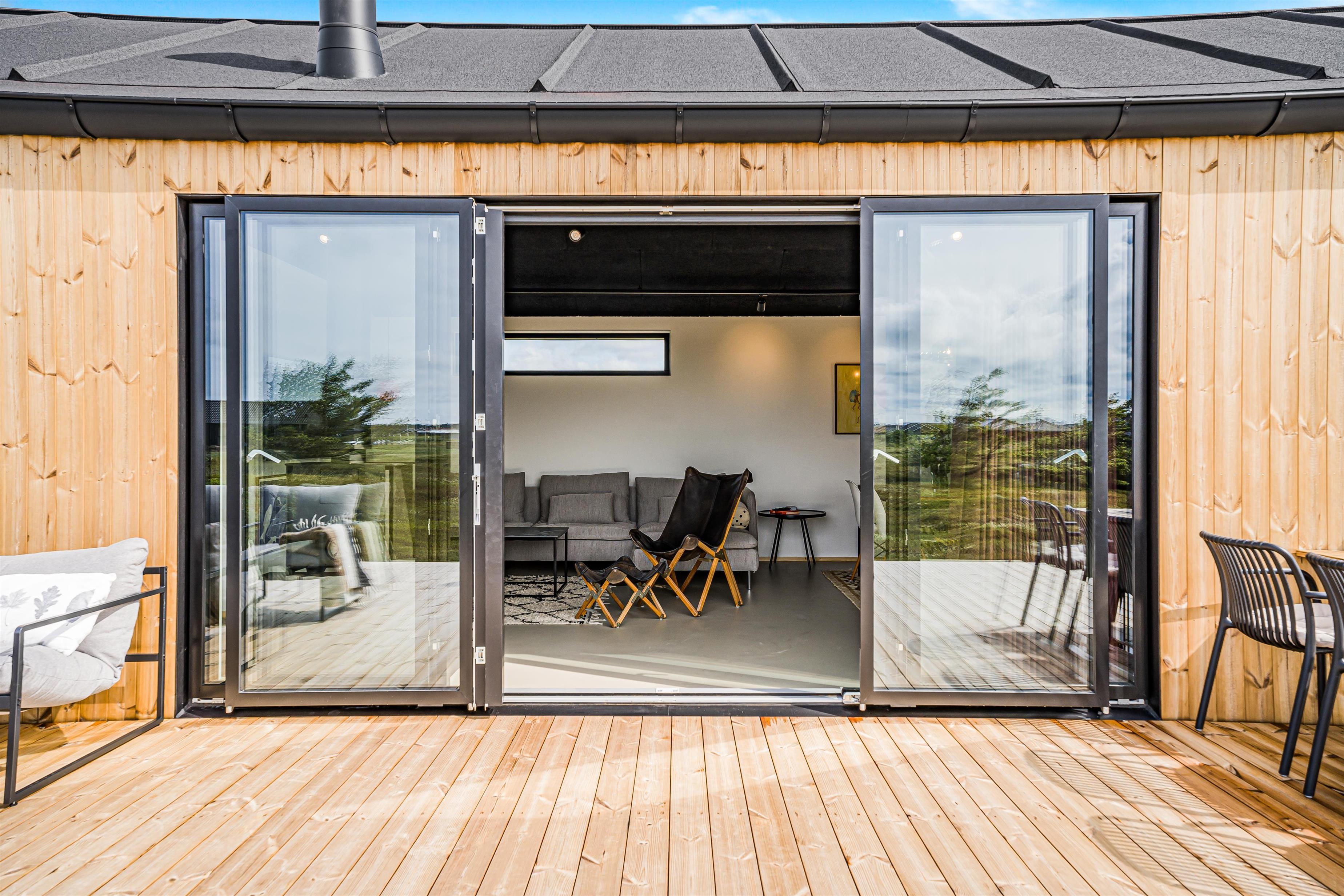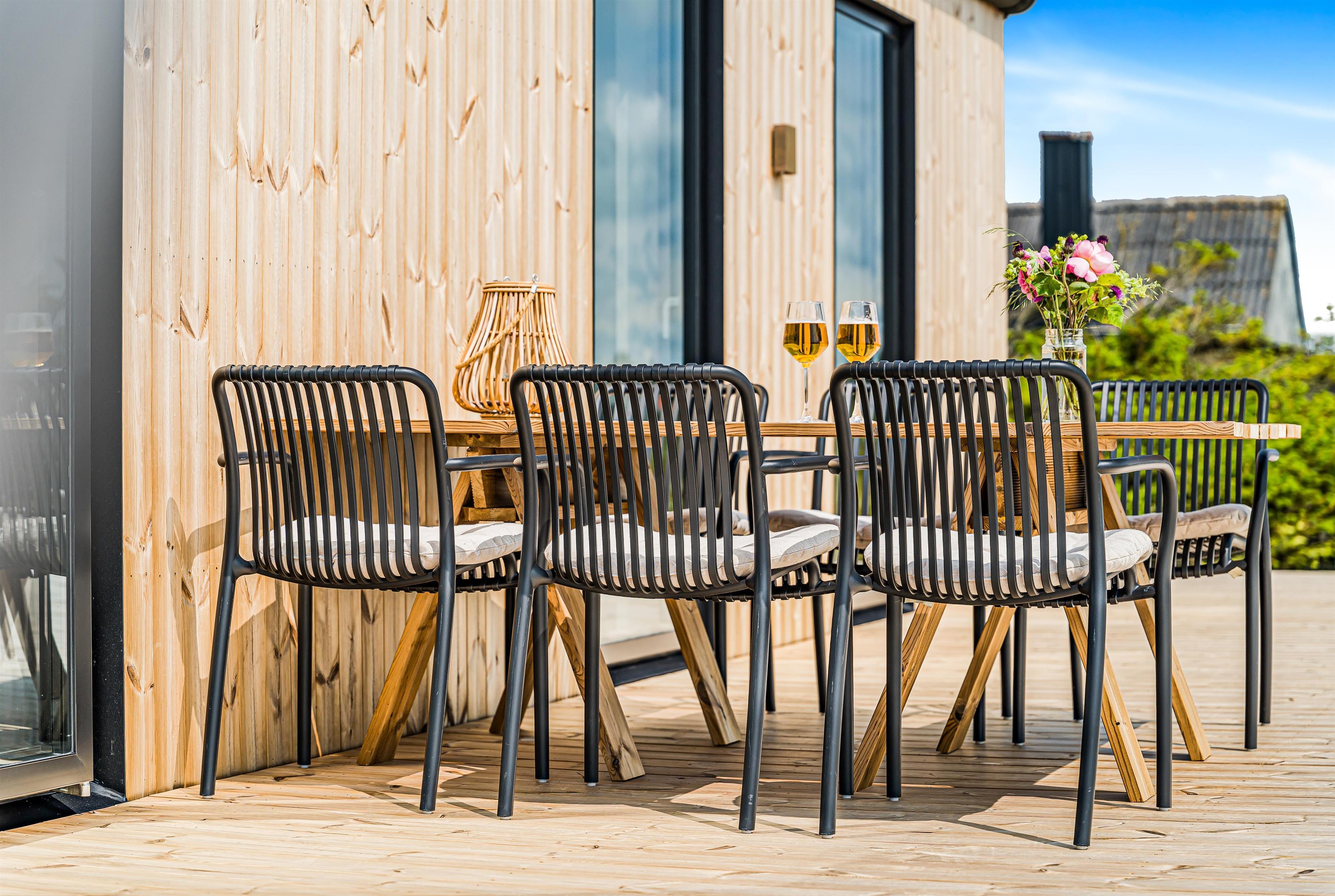 Feriehuset ligger på en 2500 m2 stor kuperet naturgrund, hvor udearealerne er et kapitel for sig selv. Huset er omkranset af en 110m2 stor træterrasse med udendørs wellnessområde. Her kan man hoppe en tur i den lækre udendørsspa. Har man været en tur i havet, kan man skylle sig af i udendørsbruseren og derefter varme sig igennem i udendørssaunaen. Desuden indbyder terrassen med havemøbler, solvogn og grill til hyggelige stunder med de nærmeste. Afstanden til det brusende Vesterhav er ganske kort – der er ikke mere end 200 meter, så står man og nyder den fabelagtige udsigt over det levende maleri Vesterhavet. Husets beliggenhed betyder at man kan være i Harboøre by på gåben på ganske få minutter, hvor der findes indkøbsmuligheder, spisemuligheder samt en masse aktiviteter for børnene. Ikke langt fra Vrist kommer man i bil hurtigt til havnebyerne Lemvig og Thyborøn, hvor man kan nyde en is på havnen, købe frisk fisk eller shoppe i de lokale butikker. Eller man tager det lille VLTJ-tog, hvortil man kan få gratis togbilletter på SJ’s kontor til at køre mellem Lemvig og Thyborøn.