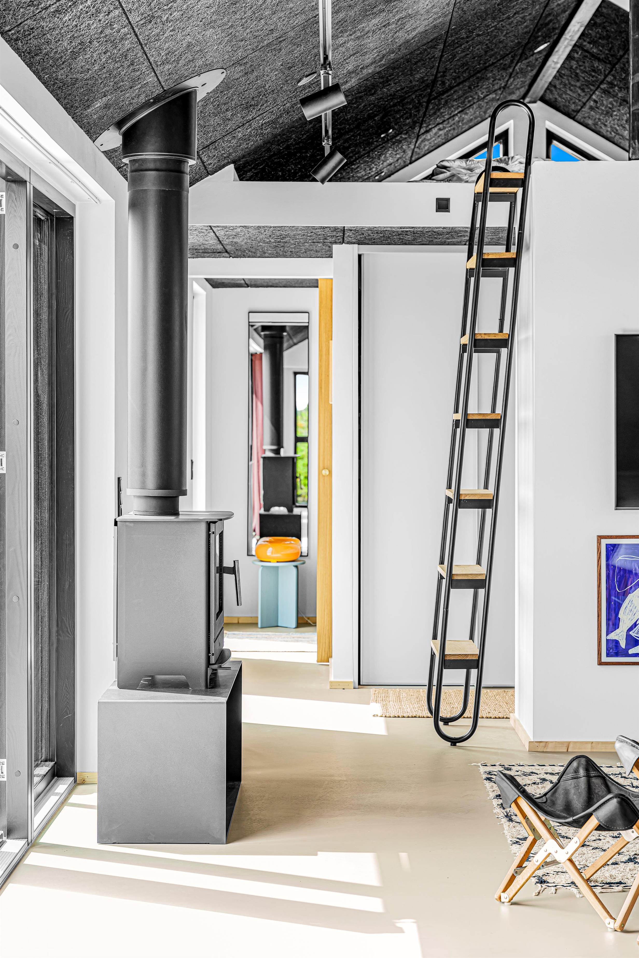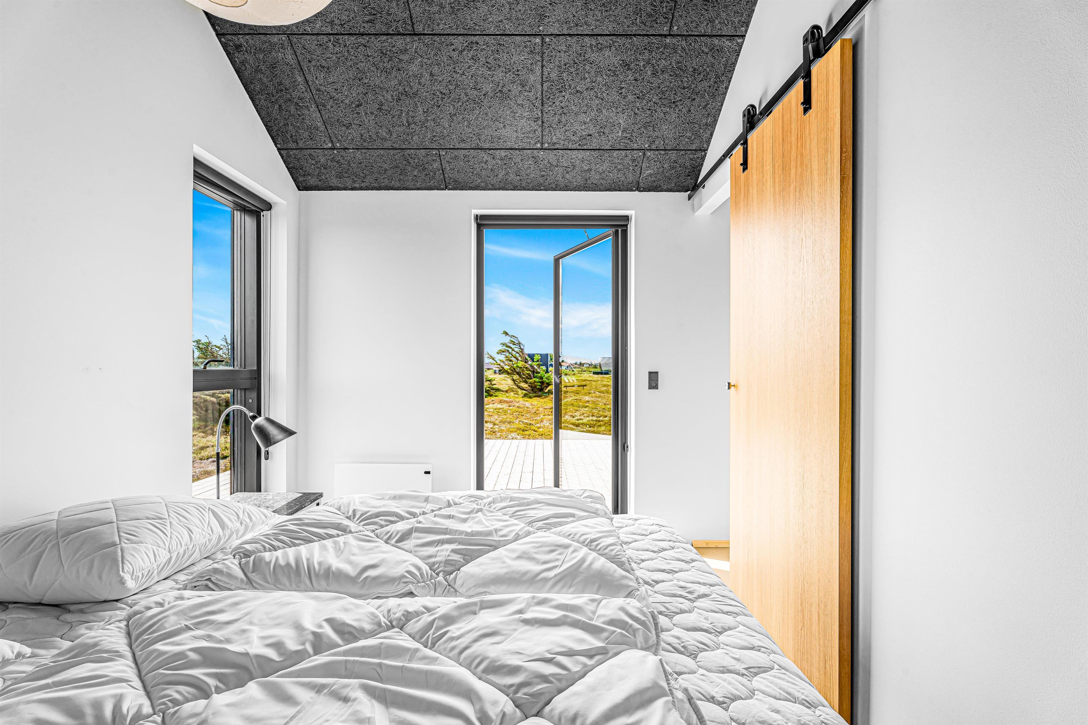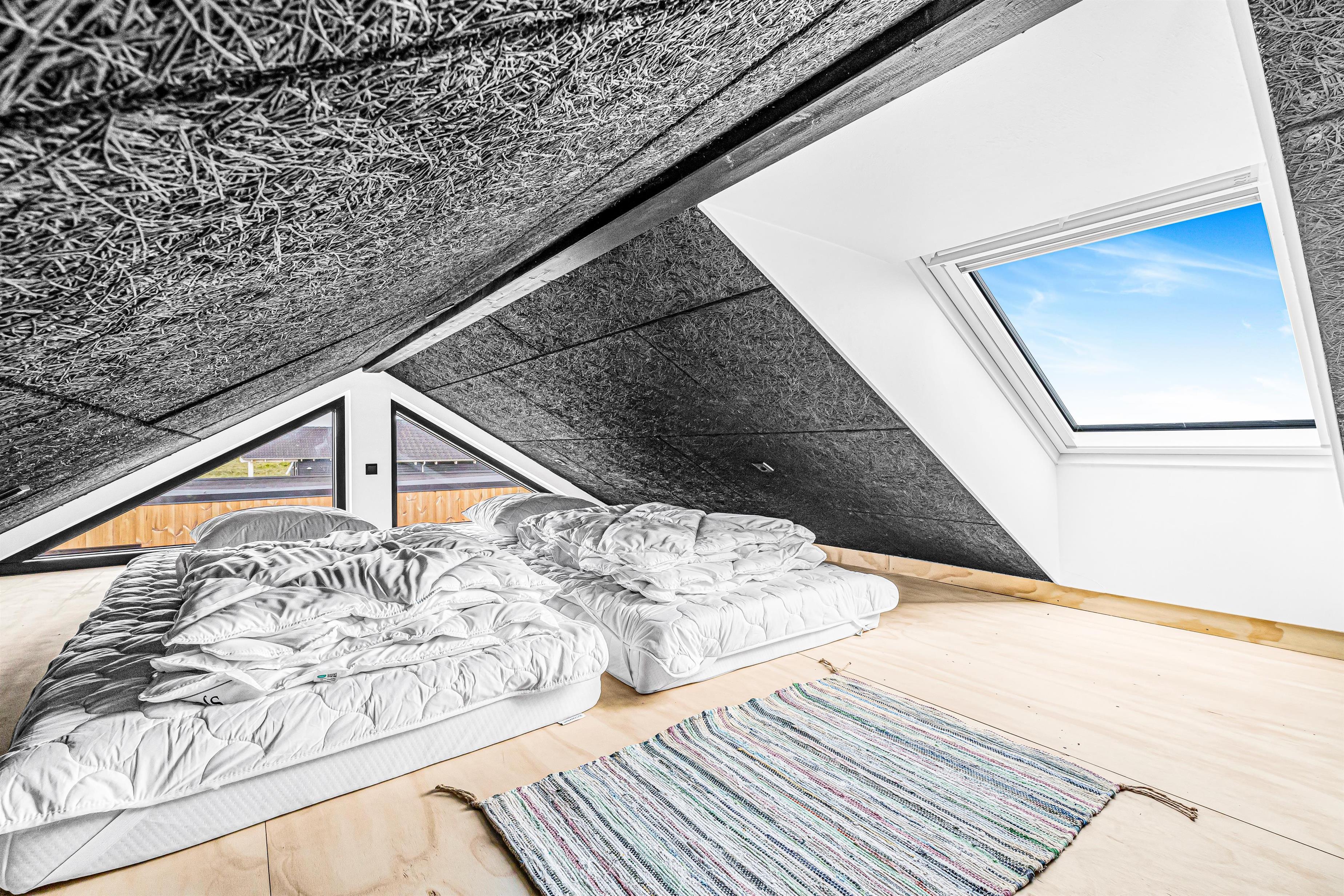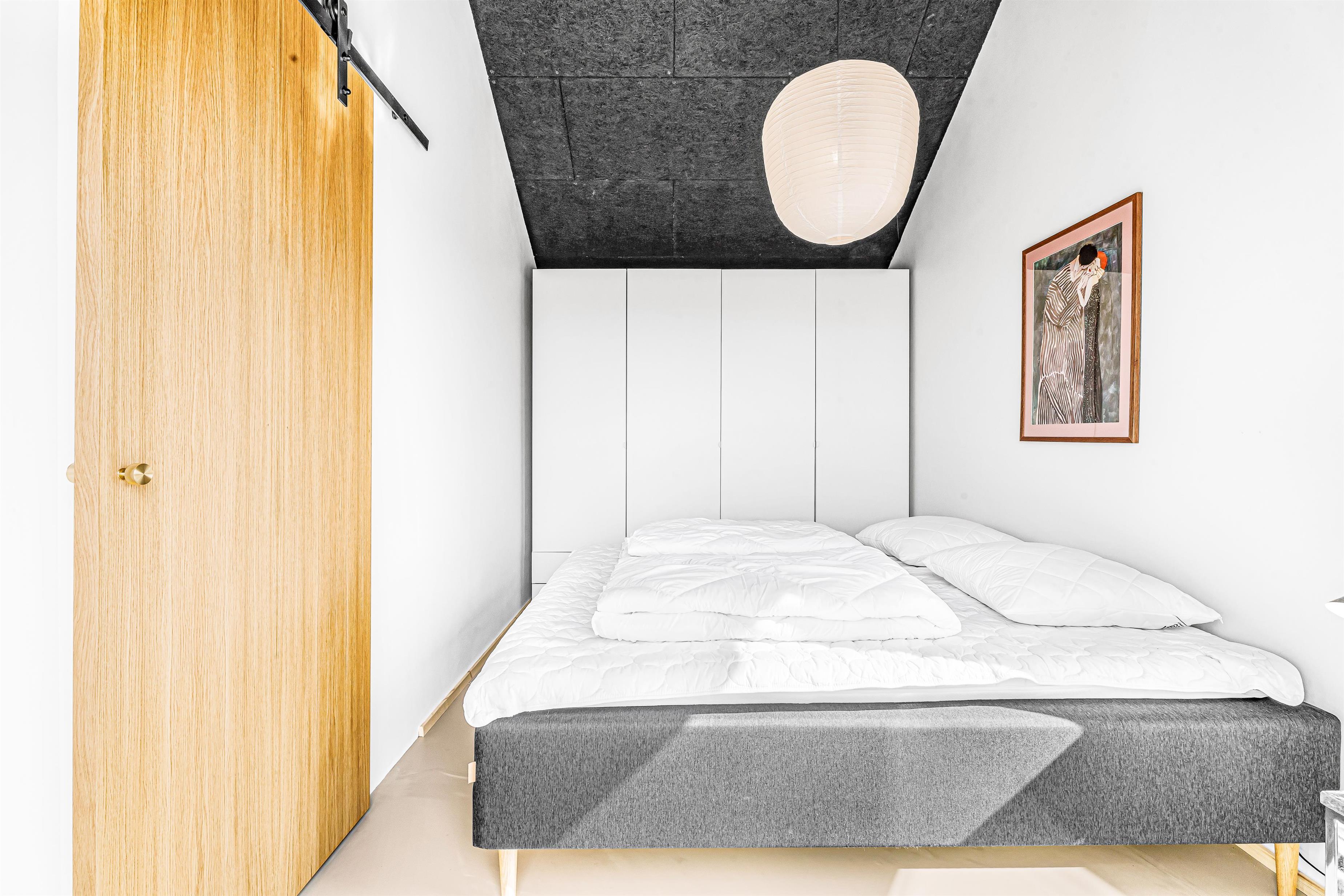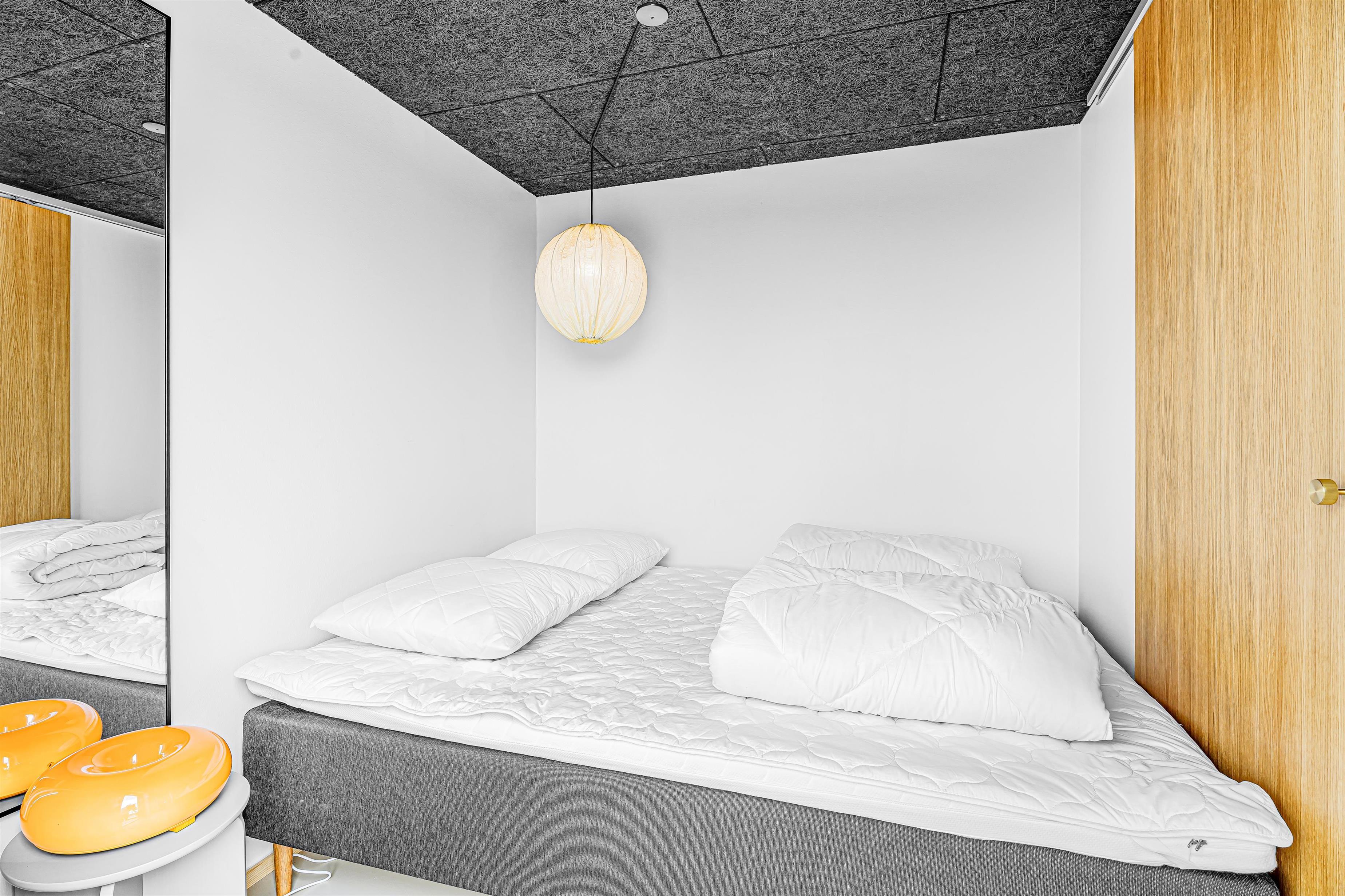 I hver ende af huset er der et soveværelse, der hver har en dobbeltseng. Desuden er der 2 yderligere sovepladser på hemsen, hvor der er højt til loftet.